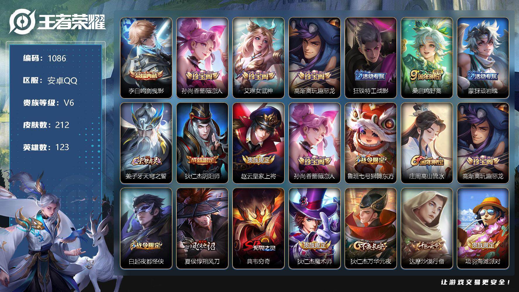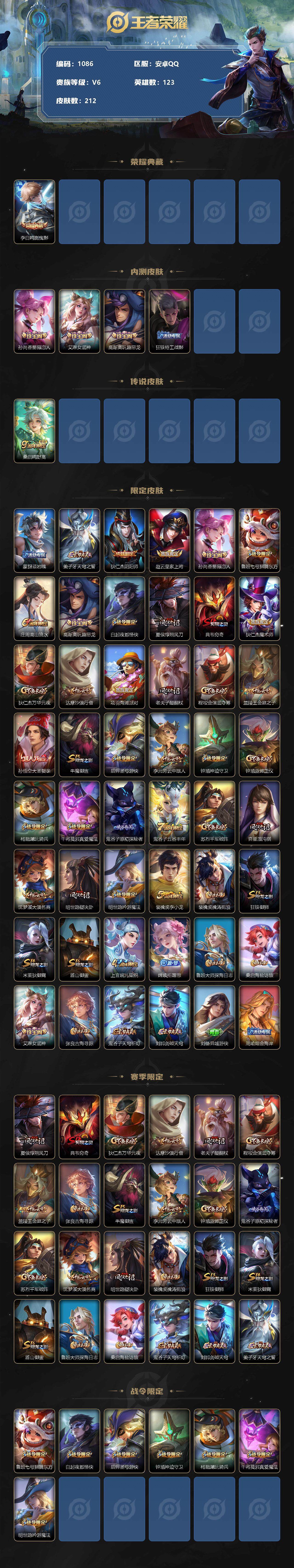 [11020176]【商品标题】:安卓Q-V6-至尊星耀IV段位-123英雄-212皮肤-1典藏-0珍品无双-0无双-0珍品传说-1传说-41史诗