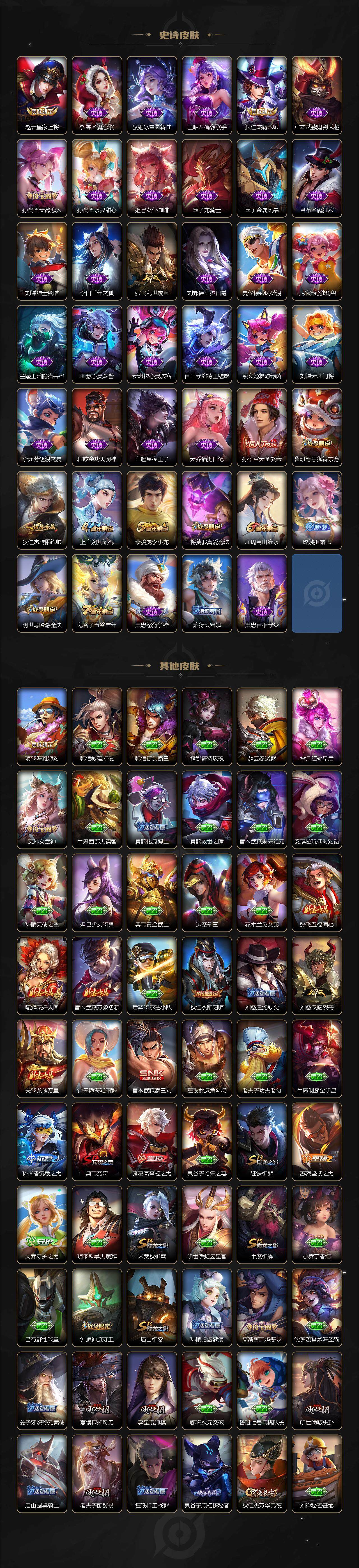 【史诗皮肤】:赵云皇家上将,貂蝉圣诞恋歌,甄姬冰雪圆舞曲,王昭君偶像歌手,狄仁杰魔术师,宫本武藏鬼剑武藏,孙尚香蔷薇恋人,孙尚香水果甜心,妲己女仆咖啡,墨子龙骑士,墨子金属风暴,吕布圣诞狂欢,刘禅绅士熊喵,李白千年之狐,张飞乱世虎臣,刘邦德古拉伯爵,夏侯惇乘风破浪,小乔缤纷独角兽,兰陵王暗隐猎兽者,亚瑟心灵战警,安琪拉心灵骇客,百里守约特工魅影,蔡文姬舞动绿茵,刘禅天才门将,李元芳逐浪之夏,程咬金功夫厨神,白起星夜王子,大乔猫狗日记,孙悟空大圣娶亲,鲁班七号狮舞东方,狄仁杰鹰眼统帅,上官婉儿梁祝,裴擒虎李小龙,干将莫邪真爱魔法,庄周高山流水,嫦娥