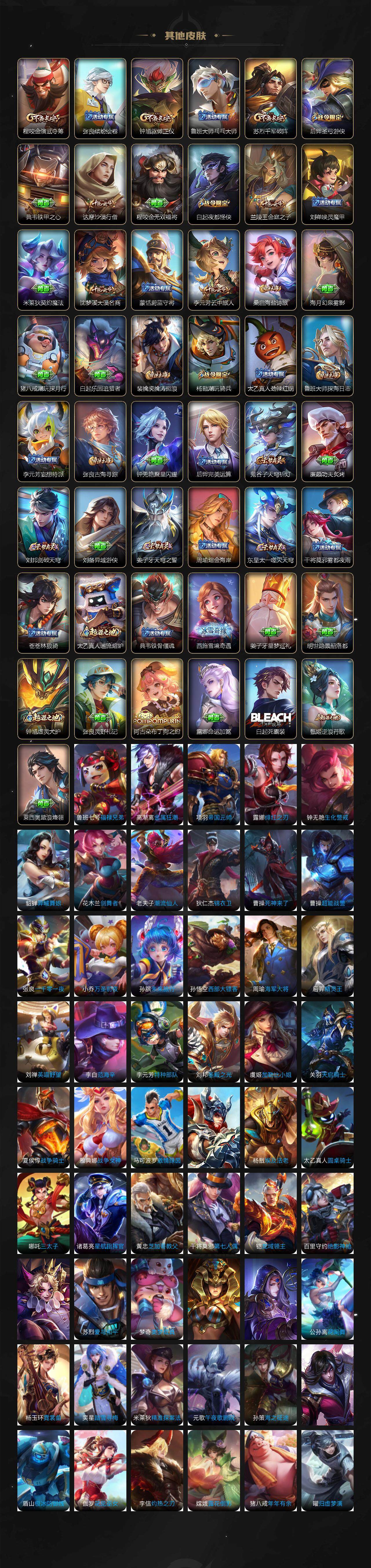 【限定皮肤】:蒙犽顽岩魄,姜子牙天穹之誓,狄仁杰阴阳师,赵云皇家上将,孙尚香蔷薇恋人,鲁班七号狮舞东方,庄周高山流水,高渐离玩趣恶龙,白起夜都怪侠,夏侯惇朔风刀,典韦穷奇,狄仁杰魔术师,狄仁杰万华元夜,达摩沙漠行僧,项羽海滩派对,老夫子醍醐杖,程咬金演武夺筹,兰陵王金庭之子,孙悟空大圣娶亲,牛魔御旌,后羿圣弓游侠,李元芳云中旅人,钟馗神迹守卫,钟馗驱傩正仪,杨戬潮玩骑兵,干将莫邪真爱魔法,鬼谷子原初探秘者,鬼谷子五谷丰年,苏烈千军破阵,弈星混沌棋,沈梦溪大漠名商,明世隐疑决卦,明世隐吟游魔法,裴擒虎李小龙,裴擒虎擒涛扼浪,狂铁御狮,米莱狄御霄,盾山御銮,上官婉儿梁祝,嫦娥拒霜思,鲁班大师探海日志,桑启海盐诗旅,艾琳女武神,张良古海寻踪,鬼谷子天穹祈灯,刘邦剑破天穹,刘备异域游侠,周瑜熔金海岸