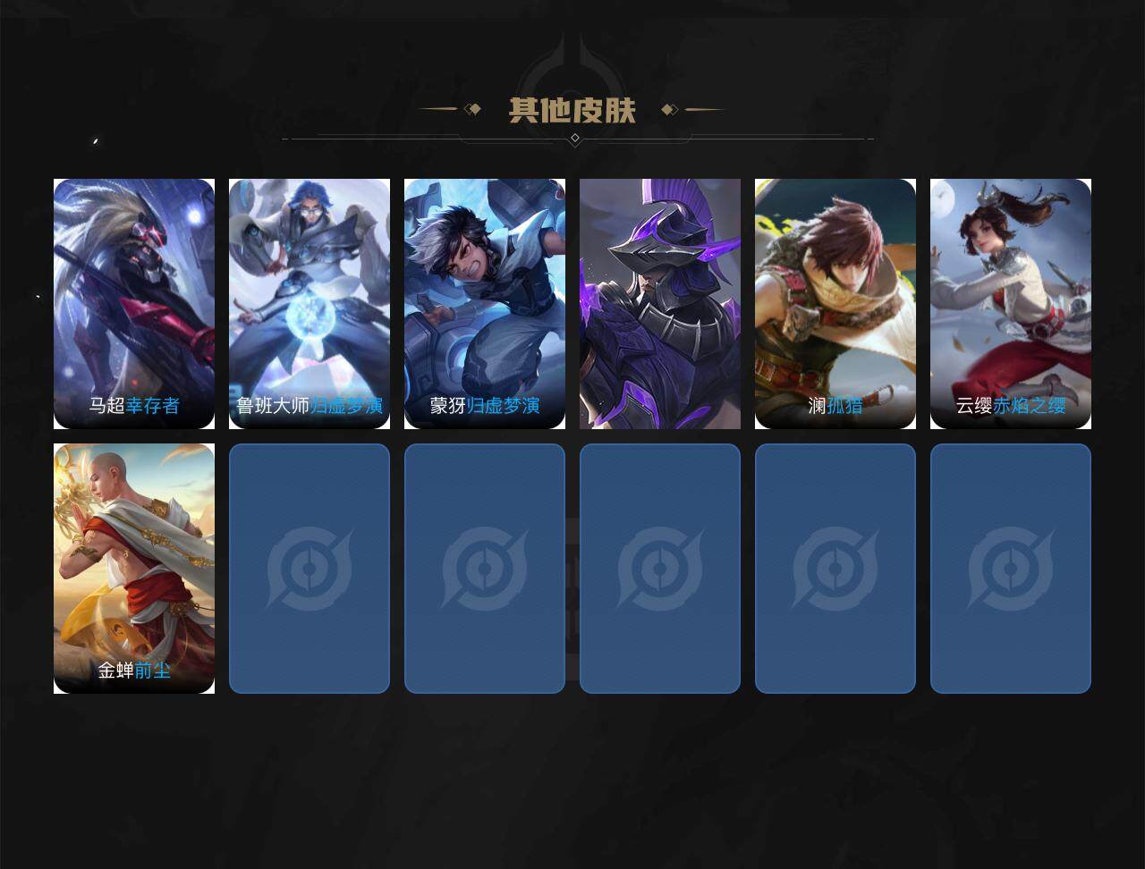 【赛季限定】:夏侯惇朔风刀,典韦穷奇,狄仁杰万华元夜,达摩沙漠行僧,老夫子醍醐杖,程咬金演武夺筹,兰陵王金庭之子,张良古海寻踪,牛魔御旌,李元芳云中旅人,钟馗驱傩正仪,鬼谷子原初探秘者,苏烈千军破阵,弈星混沌棋,沈梦溪大漠名商,明世隐疑决卦,裴擒虎擒涛扼浪,狂铁御狮,米莱狄御霄,盾山御銮,鲁班大师探海日志,桑启海盐诗旅,鬼谷子天穹祈灯,刘邦剑破天穹,姜子牙天穹之誓
