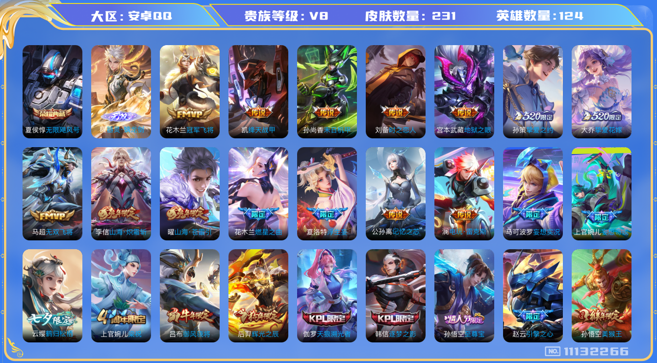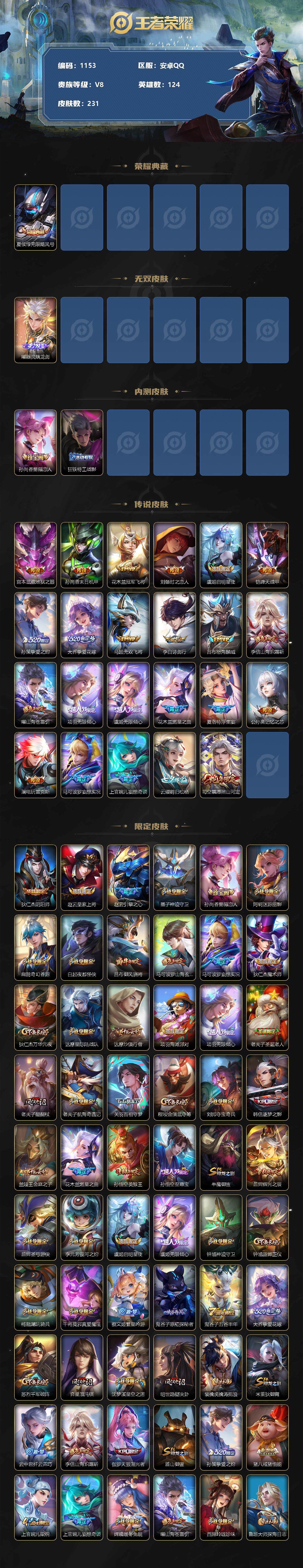 [11132266]【商品标题】:安卓Q-V8-永恒钻石IV段位-124英雄-231皮肤-1典藏-0珍品无双-1无双-0珍品传说-23传说-56史诗