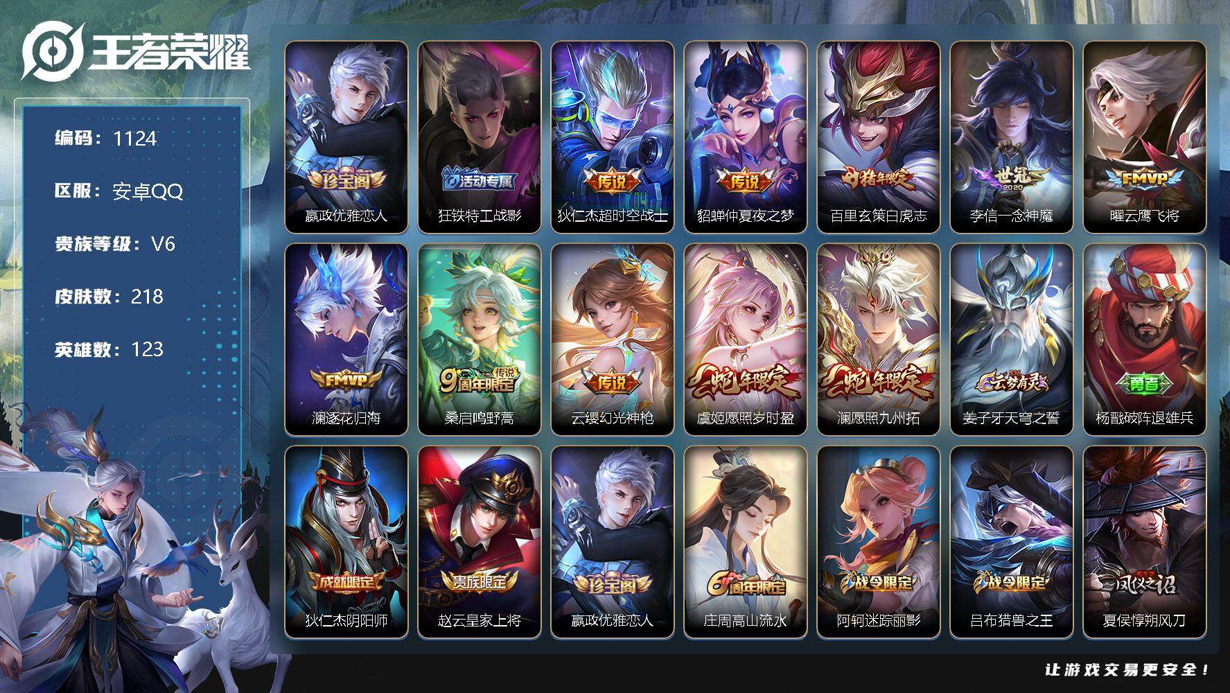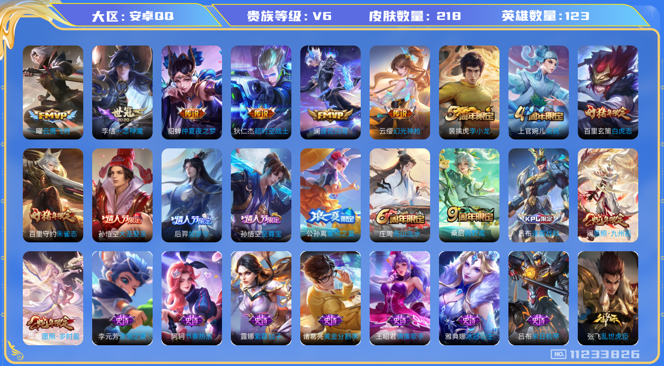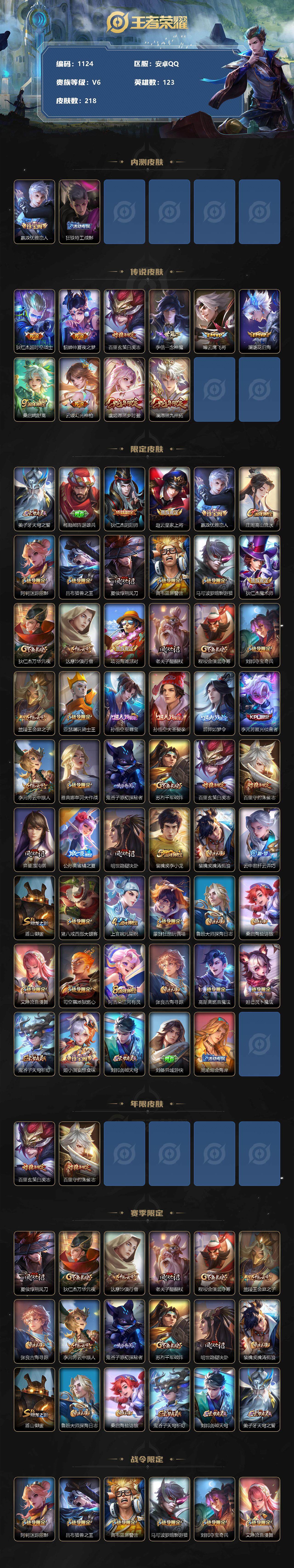 [11233826]【商品标题】:安卓Q-V6-至尊星耀III段位-123英雄-218皮肤-0典藏-0珍品无双-0无双-0珍品传说-10传说-60史诗