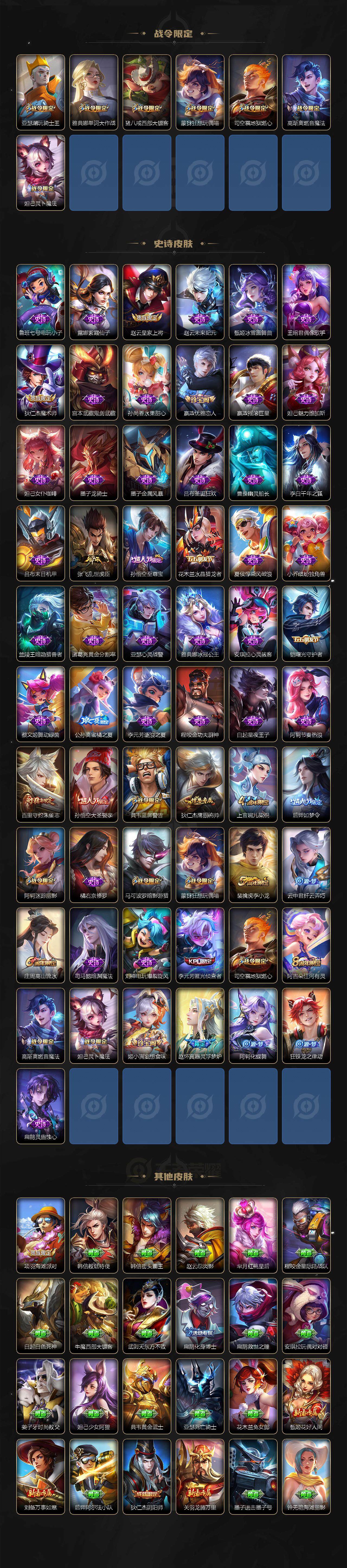 - [12279800]V10 4典藏 3无双 34传说 126英雄 381皮肤 典藏英雄武则天 牛魔小国标 可修改实名 优质装备:鸣剑·曳影,全息碎影(猴子典藏),九霄神辉(木兰典藏),弑枪猎影(韩信典藏),韩信群星魔术团(韩信无双),花合斗,离恨烟(公孙离无双),黄金狮子座,冠军飞将,云鹰飞将(小将军),绛天战甲(鸡嘴战神),黄金白羊座,久胜战神,炽阳神光,末日机甲-孙尚香(绿蚂蚱),地狱火,仲夏夜之梦(大飞蛾),音你心动-小乔,地狱之眼,胖达荣荣,时之恋人-刘备(电焊工),超时空战士-狄仁杰,末日机甲-孙策,挚爱之约,山海·炽霜斩(李信年限),小动物乐团,澜逐花归海,艾琳觅芳踪,黄金天蝎座,云中君群星魔术团,涂山容容 传说皮:乘龙·淬吴钩(孙策年限),铠冥王哈迪斯 珍宝阁皮:女武神,玩趣恶龙 限定皮:鸣野蒿,至尊宝,白虎志(电光耗子),凤求凰(白切鸡),太华(伽罗年限),异界灵契(白毛香),时之彼端,魔法小厨娘,时雨天司(水龙头),神威(电光马子),飞衡(韩信年限),降魔,五谷丰年,冰锋战神,御风骁将(吕布年限),虎魄,李小龙,玄武志(苏烈年限),朱雀志(守约年限),如梦令-后羿,霸王别姬-虞姬,孙行者,大圣娶亲,天魔缭乱,冰霜恋舞曲,寅虎·赤拳(老虎年限),山海·玄木吟(马可年限) 史诗皮:灵蛊蚀心,星界战将,龙之律动,怒海争锋,撼地雄心,破空之剑,战舞者,东方月初,芈月浮光幕影,海诺心动手记,琥珀纪元伽罗,决胜骁骑,上官婉儿群星魔术团,蔬乡物语(鲁班七号),乘龙·聚宝船(安琪拉年限),百相守梦-百里守约,百相守梦-黄忠,紫霞仙子,电玩小子(小书包),白龙吟,黄金分割率,特工魅影,千年之狐,永昼,江河有灵,匿光侦查者,真我赫兹(百里守约),魅语,百解令(蒙犽),高渐离燃音魔法,蒙恬荣光圣徽,无限星赏官,偶像歌手,晚萤,龙骑士(小龙虾),末日机甲-吕布,猫狗日记-孙策,猫狗日记-大乔,时之恋人-孙尚香,乱世虎臣,节奏热浪,修罗,女仆咖啡,摇滚巨星,水果甜心,绅士熊喵,天才门将,星夜王子,心灵骇客,时之奇旅-安琪拉,功夫厨神,德古拉伯爵,暗隐猎兽者,幽灵船长,鬼剑武藏,暗渊魔法,心灵战警,乐园奇幻夜,天秀·启明,舞动绿茵,地狱岩魂,纤云弄巧,繁星吟游(呼啦呼啦),拒霜思,缤纷独角兽,乘风破浪,逐浪之夏,月团寄思,水晶猎龙者,曙光守护者,箭羽风息,金属风暴,原初追逐者,圣诞狂欢,