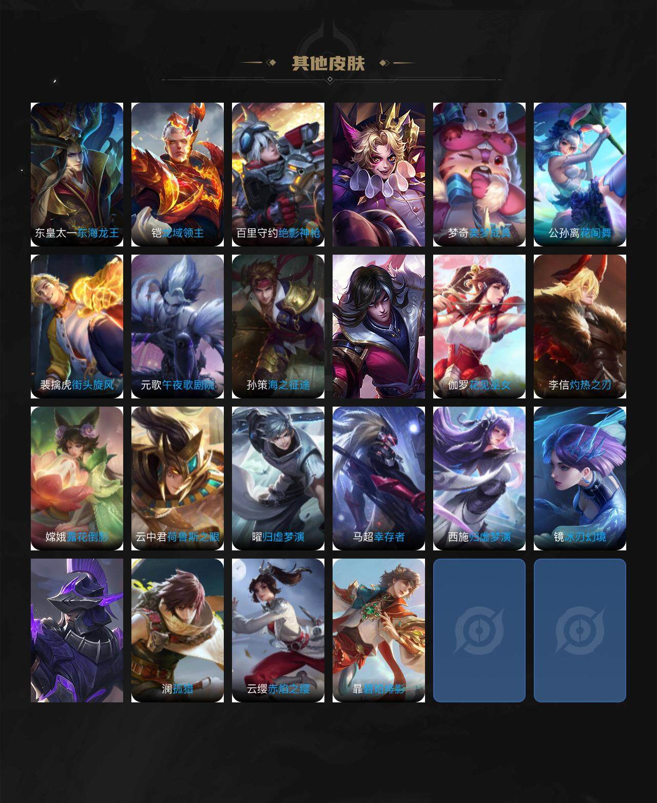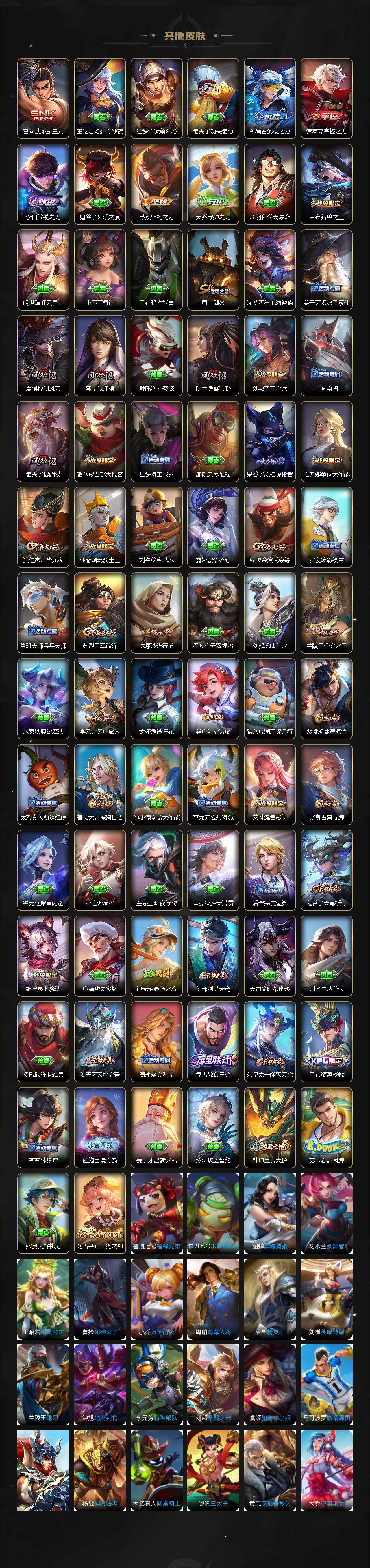 【限定皮肤】:姜子牙天穹之誓,杨戬破阵退雄兵,狄仁杰阴阳师,赵云皇家上将,嬴政优雅恋人,庄周高山流水,阿轲迷踪丽影,吕布猎兽之王,夏侯惇朔风刀,典韦蓝屏警告,马可波罗暗影游猎,狄仁杰魔术师,狄仁杰万华元夜,达摩沙漠行僧,项羽海滩派对,老夫子醍醐杖,程咬金演武夺筹,刘邦夺宝奇兵,兰陵王金庭之子,亚瑟潮玩骑士王,孙悟空至尊宝,孙悟空大圣娶亲,后羿如梦令,李元芳匿光侦查者,李元芳云中旅人,雅典娜单词大作战,鬼谷子原初探秘者,苏烈千军破阵,百里玄策白虎志,百里守约朱雀志,弈星混沌棋,公孙离蜜橘之夏,明世隐疑决卦,裴擒虎李小龙,裴擒虎擒涛扼浪,云中君纤云弄巧,盾山御銮,猪八戒西部大镖客,上官婉儿梁祝,蒙犽狂想玩偶喵,鲁班大师探海日志,桑启海盐诗旅,艾琳流音漫舞,司空震地狱燃心,阿古朵江河有灵,张良古海寻踪,高渐离燃音魔法,妲己灵卜魔法,鬼谷子天穹祈灯,姬小满妄想食味,刘邦剑破天穹,刘备异域游侠,周瑜熔金海岸