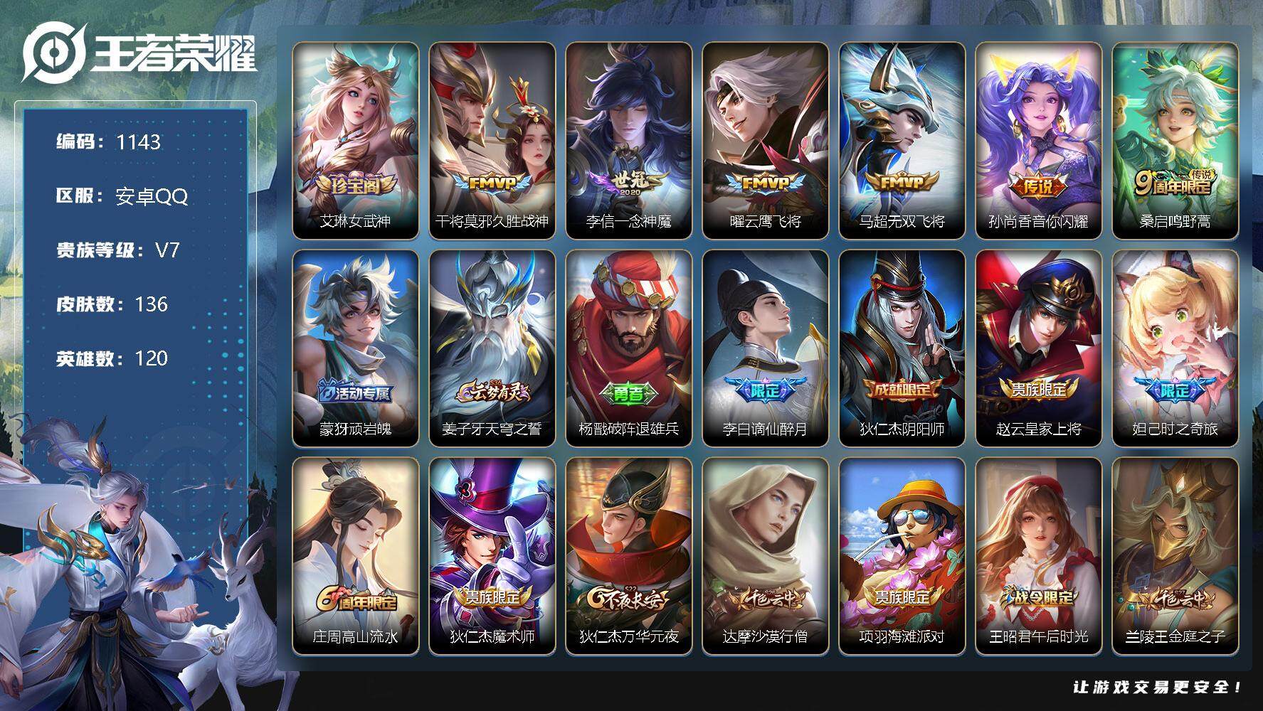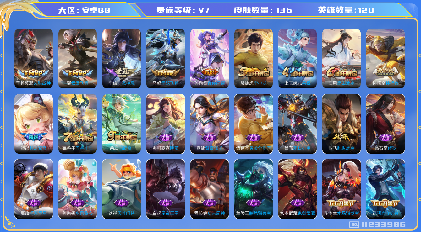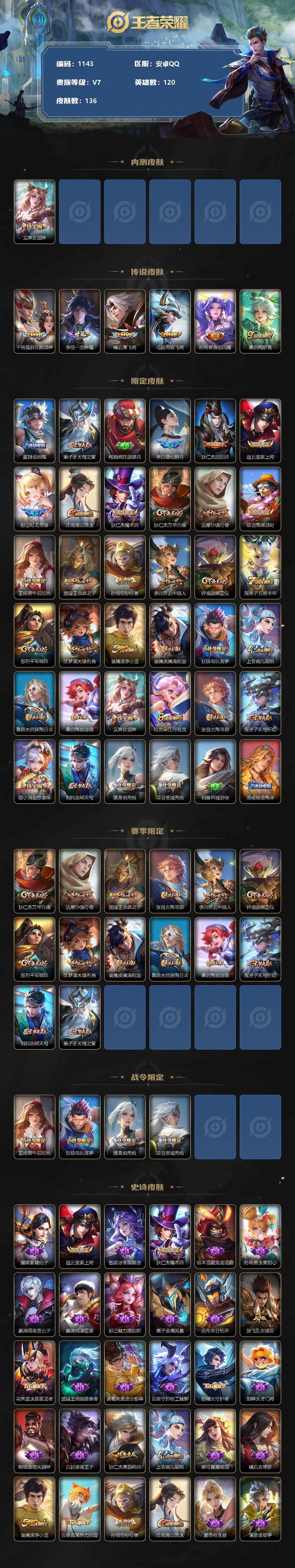 [11233986]【商品标题】:安卓Q-V4-尊贵铂金IV段位-120英雄-136皮肤-0典藏-0珍品无双-0无双-0珍品传说-6传说-39史诗