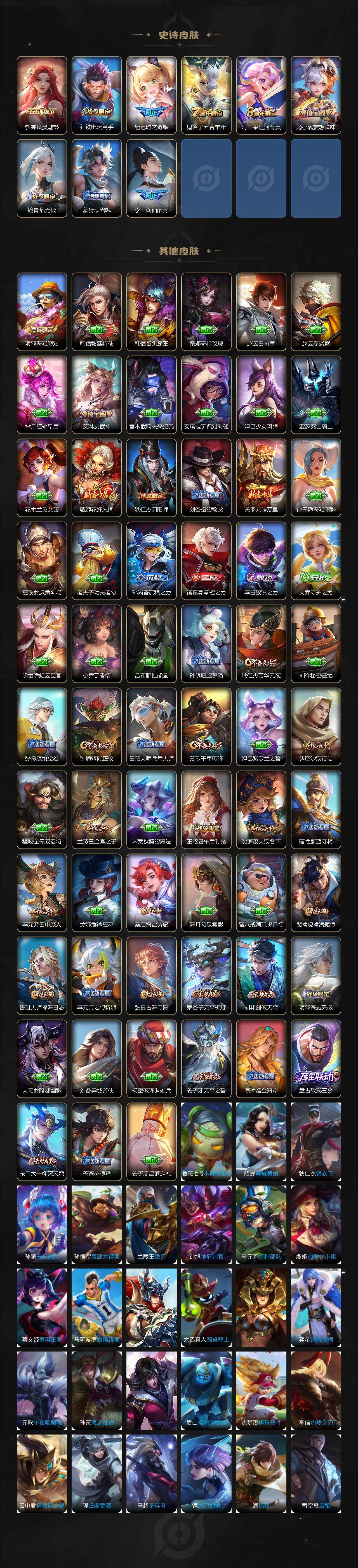【史诗皮肤】:露娜紫霞仙子,赵云皇家上将,甄姬冰雪圆舞曲,狄仁杰魔术师,宫本武藏鬼剑武藏,孙尚香水果甜心,嬴政暗夜贵公子,嬴政摇滚巨星,妲己魅力维加斯,墨子金属风暴,吕布末日机甲,张飞乱世虎臣,花木兰水晶猎龙者,兰陵王暗隐猎兽者,诸葛亮黄金分割率,百里守约特工魅影,铠曙光守护者,刘禅天才门将,程咬金功夫厨神,白起星夜王子,狄仁杰鹰眼统帅,上官婉儿梁祝,娜可露露晚萤,橘右京修罗,裴擒虎李小龙,百里玄策热力回旋,孙悟空孙行者,庄周高山流水,夏洛特永昼,澜赏金猎手,貂蝉唤灵魅影,狂铁电玩高手,妲己时之奇旅,鬼谷子五谷丰年,阿古朵江河有灵,姬小满妄想食味,镜青焰无极,蒙犽顽岩魄,李白谪仙醉月