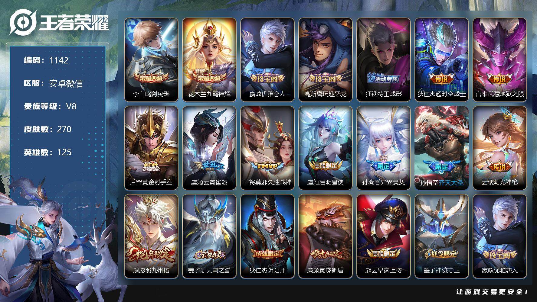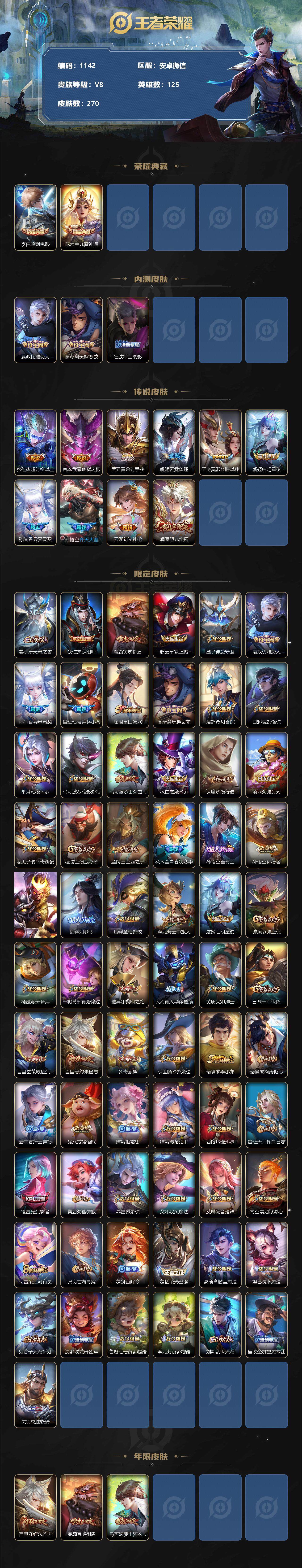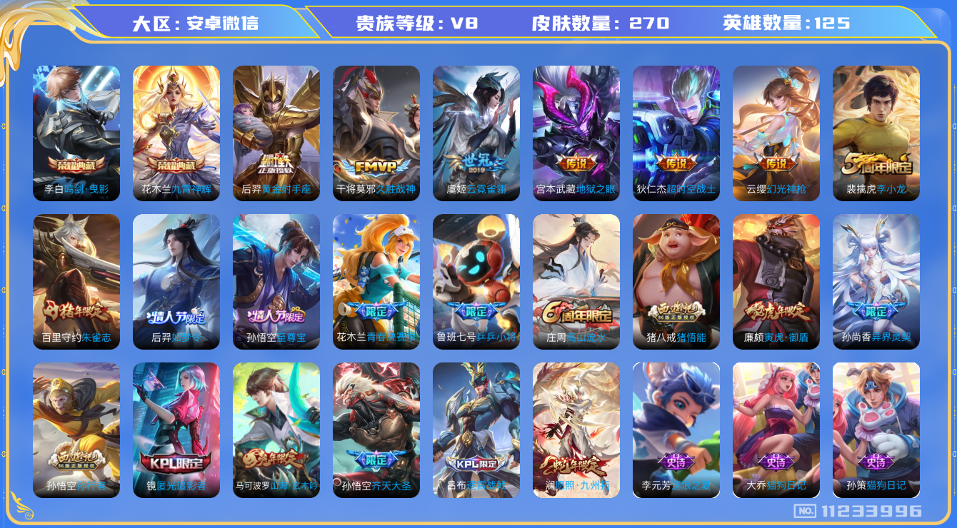 [11233996]【商品标题】:安卓WX-V8-至尊星耀III段位-125英雄-270皮肤-2典藏-0珍品无双-0无双-0珍品传说-10传说-84史诗