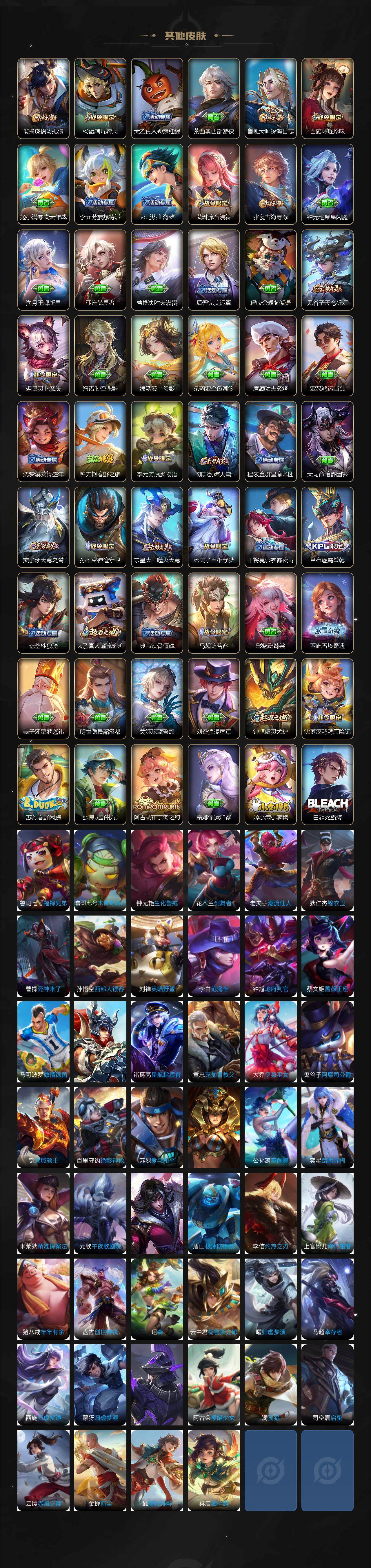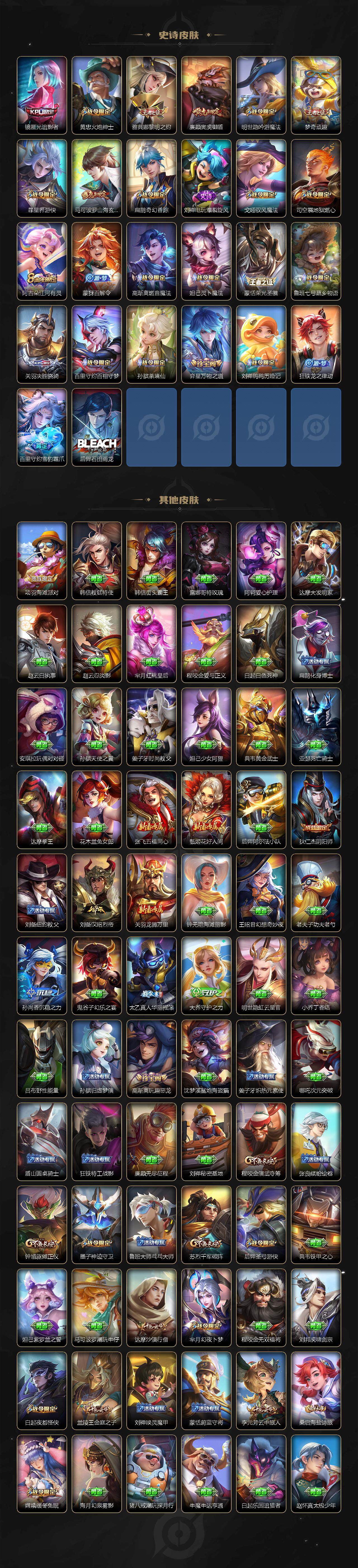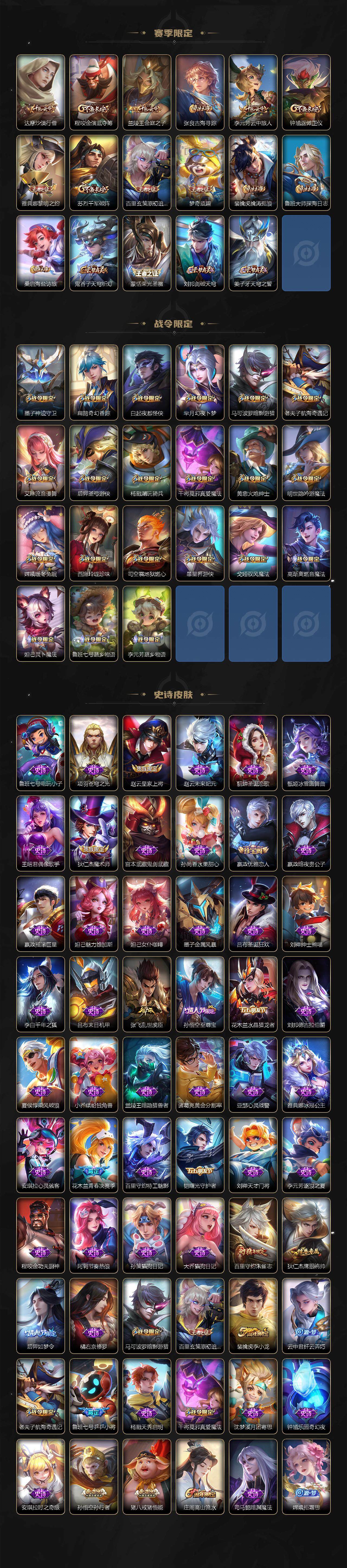 【限定皮肤】:姜子牙天穹之誓,狄仁杰阴阳师,廉颇寅虎御盾,赵云皇家上将,墨子神迹守卫,嬴政优雅恋人,孙尚香异界灵契,鲁班七号乒乒小将,庄周高山流水,高渐离玩趣恶龙,扁鹊奇幻香踪,白起夜都怪侠,芈月幻夜卜梦,马可波罗暗影游猎,马可波罗山海玄木吟,狄仁杰魔术师,达摩沙漠行僧,项羽海滩派对,老夫子航海奇遇记,程咬金演武夺筹,兰陵王金庭之子,花木兰青春决赛季,孙悟空至尊宝,孙悟空孙行者,孙悟空齐天大圣,后羿如梦令,后羿圣弓游侠,李元芳云中旅人,虞姬启明星使,钟馗驱傩正仪,杨戬潮玩骑兵,干将莫邪真爱魔法,雅典娜黎明之约,太乙真人华丽摇滚,黄忠火炮绅士,苏烈千军破阵,百里玄策原初追逐者,百里守约朱雀志,梦奇顽趣,明世隐吟游魔法,裴擒虎李小龙,裴擒虎擒涛扼浪,云中君纤云弄巧,猪八戒猪悟能,嫦娥拒霜思,嫦娥暖冬兔眠,西施玲珑珍味,鲁班大师探海日志,镜匿光追影者,桑启海盐诗旅,暃星界游侠,戈娅驭风魔法,艾琳流音漫舞,司空震地狱燃心,阿古朵江河有灵,张良古海寻踪,蒙犽百解令,蒙恬荣光圣徽,高渐离燃音魔法,妲己灵卜魔法,鬼谷子天穹祈灯,沈梦溪龙舞盛年,鲁班七号蔬乡物语,李元芳蔬乡物语,刘邦剑破天穹,程咬金群星魔术团,关羽决胜骁骑