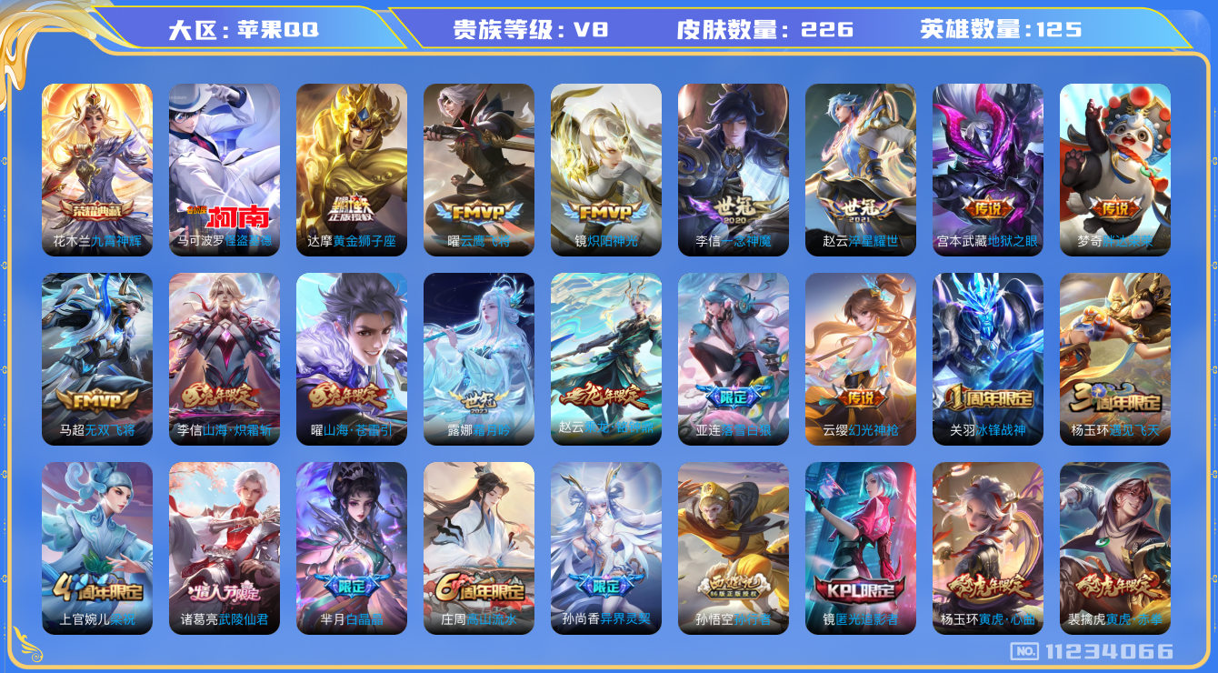 [11234066]【商品标题】:苹果Q-V5-永恒钻石V段位-125英雄-226皮肤-1典藏-0珍品无双-0无双-1珍品传说-23传说-74史诗