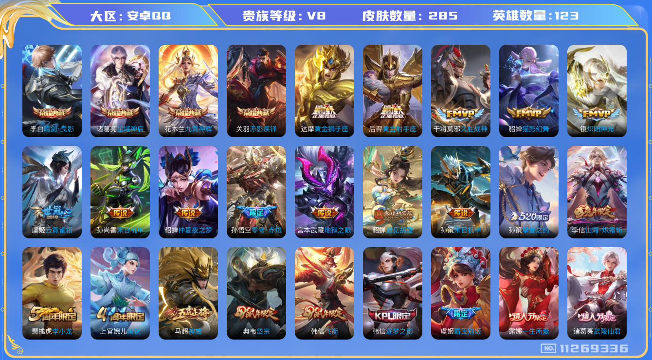 [11269336]【商品标题】:安卓Q-V7-永恒钻石V段位-123英雄-285皮肤-4典藏-0珍品无双-0无双-0珍品传说-23传说-78史诗