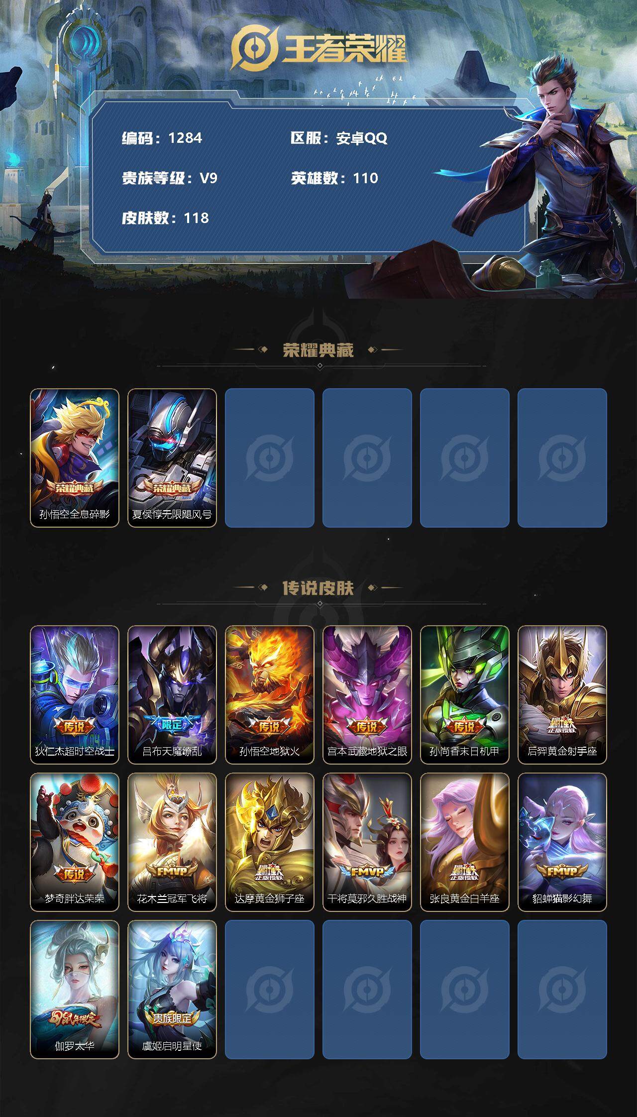 - PX_2095926-实名: 可修改 贵族等级: V5 英雄数: 124 皮肤数: 163 传说皮: 乘龙·问璇玑 限定皮: 李小龙,梁祝,御风骁将,引擎之心,飞衡,大圣娶亲,五谷丰年,山海·玄木吟,鸣野蒿,逐霄战戟