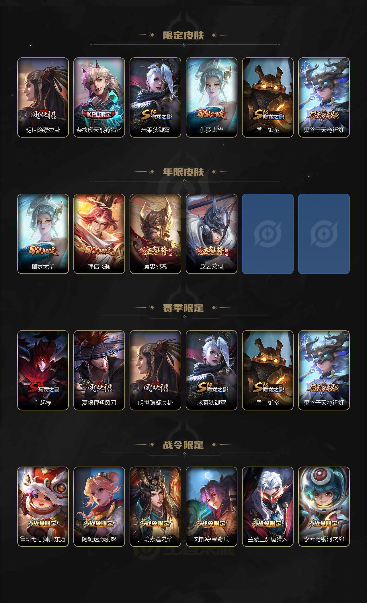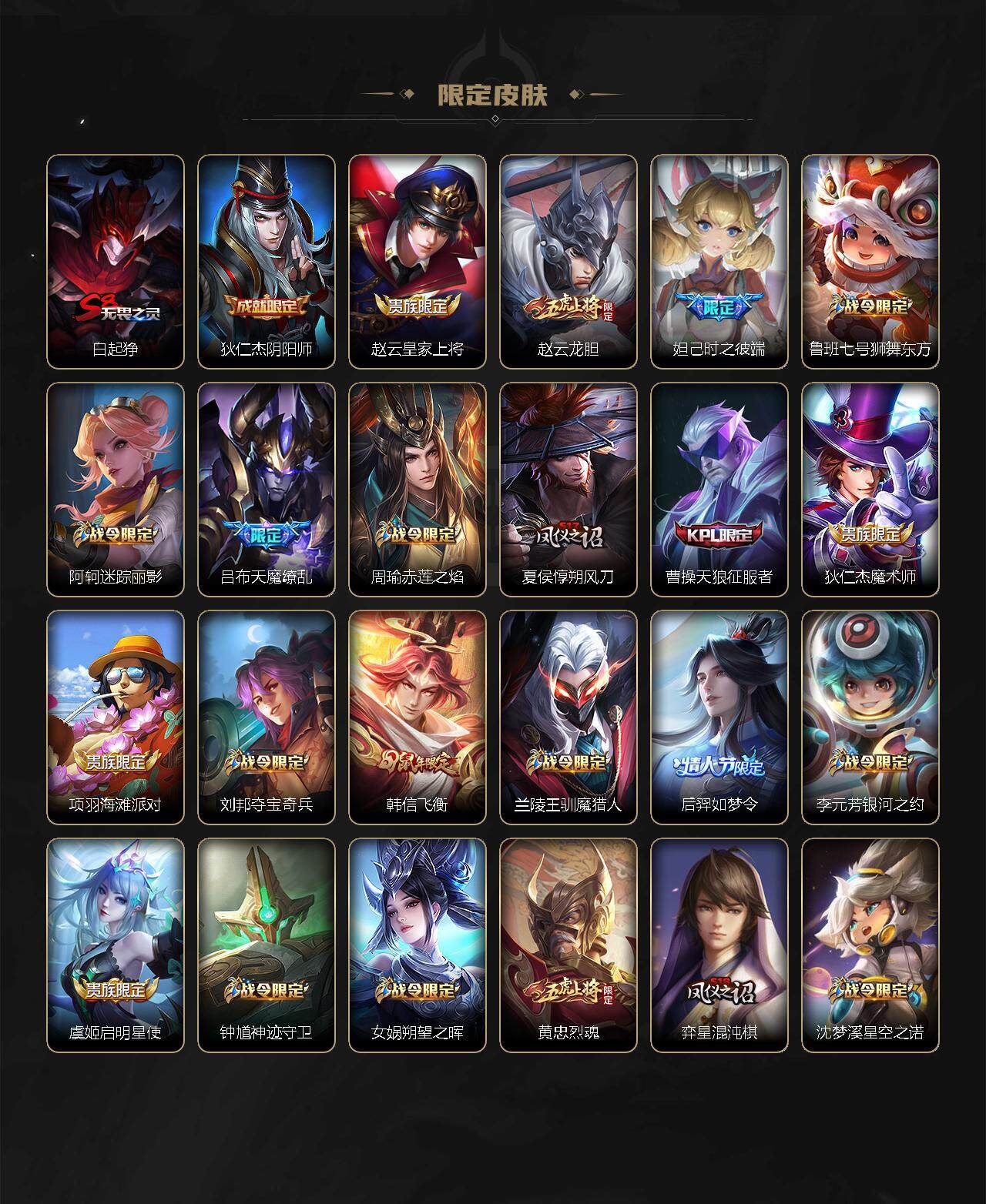 【限定皮肤】:白起狰,狄仁杰阴阳师,赵云皇家上将,赵云龙胆,妲己时之彼端,鲁班七号狮舞东方,阿轲迷踪丽影,吕布天魔缭乱,周瑜赤莲之焰,夏侯惇朔风刀,曹操天狼征服者,狄仁杰魔术师,项羽海滩派对,刘邦夺宝奇兵,韩信飞衡,兰陵王驯魔猎人,后羿如梦令,李元芳银河之约,虞姬启明星使,钟馗神迹守卫,女娲朔望之晖,黄忠烈魂,弈星混沌棋,沈梦溪星空之诺,明世隐疑决卦,裴擒虎天狼狩猎者,米莱狄御霄,伽罗太华,盾山御銮,鬼谷子天穹祈灯