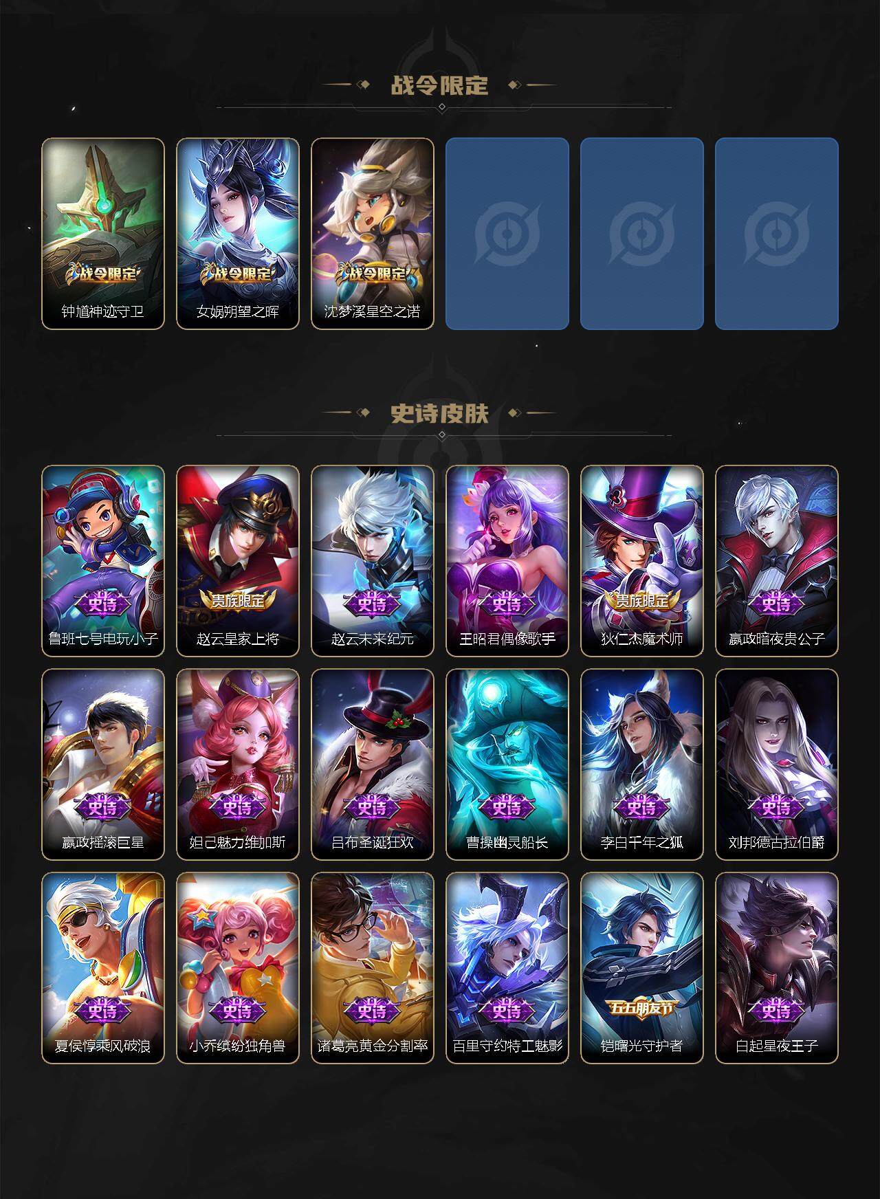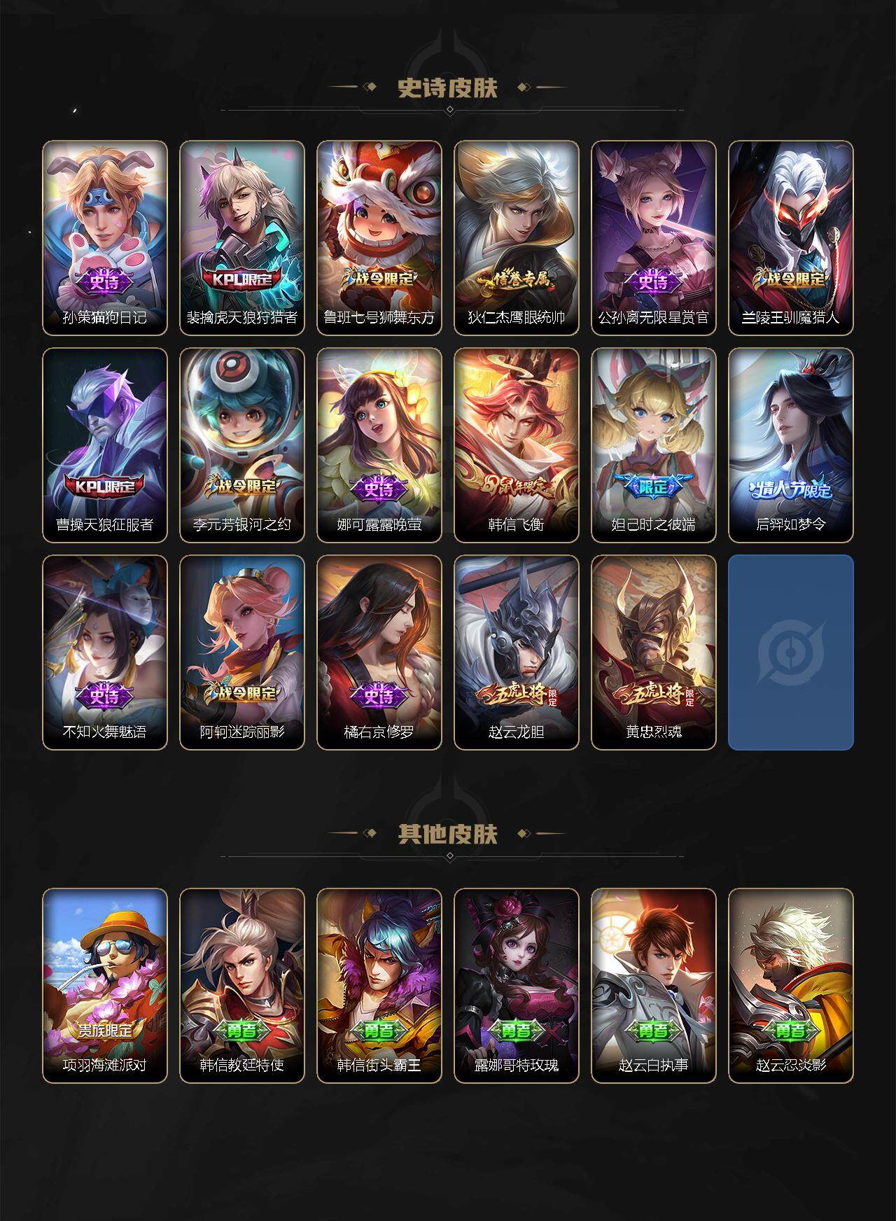 【史诗皮肤】:鲁班七号电玩小子,赵云皇家上将,赵云未来纪元,王昭君偶像歌手,狄仁杰魔术师,嬴政暗夜贵公子,嬴政摇滚巨星,妲己魅力维加斯,吕布圣诞狂欢,曹操幽灵船长,李白千年之狐,刘邦德古拉伯爵,夏侯惇乘风破浪,小乔缤纷独角兽,诸葛亮黄金分割率,百里守约特工魅影,铠曙光守护者,白起星夜王子,孙策猫狗日记,裴擒虎天狼狩猎者,鲁班七号狮舞东方,狄仁杰鹰眼统帅,公孙离无限星赏官,兰陵王驯魔猎人,曹操天狼征服者,李元芳银河之约,娜可露露晚萤,韩信飞衡,妲己时之彼端,后羿如梦令,不知火舞魅语,阿轲迷踪丽影,橘右京修罗,赵云龙胆,黄忠烈魂