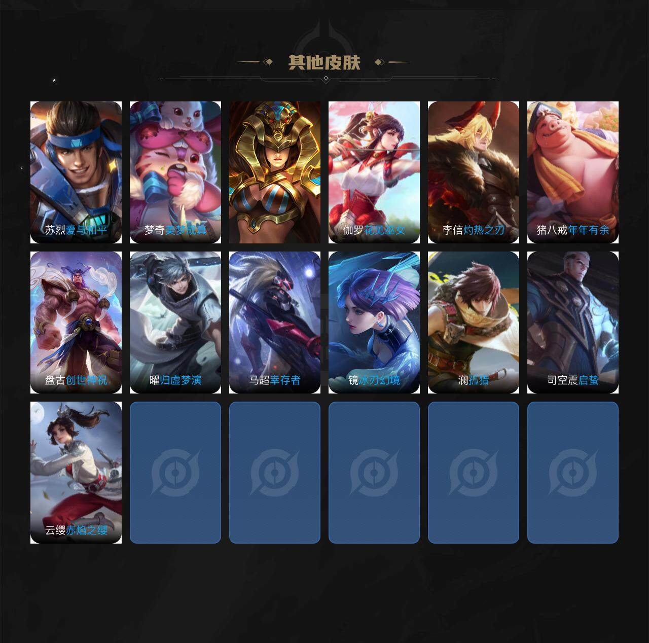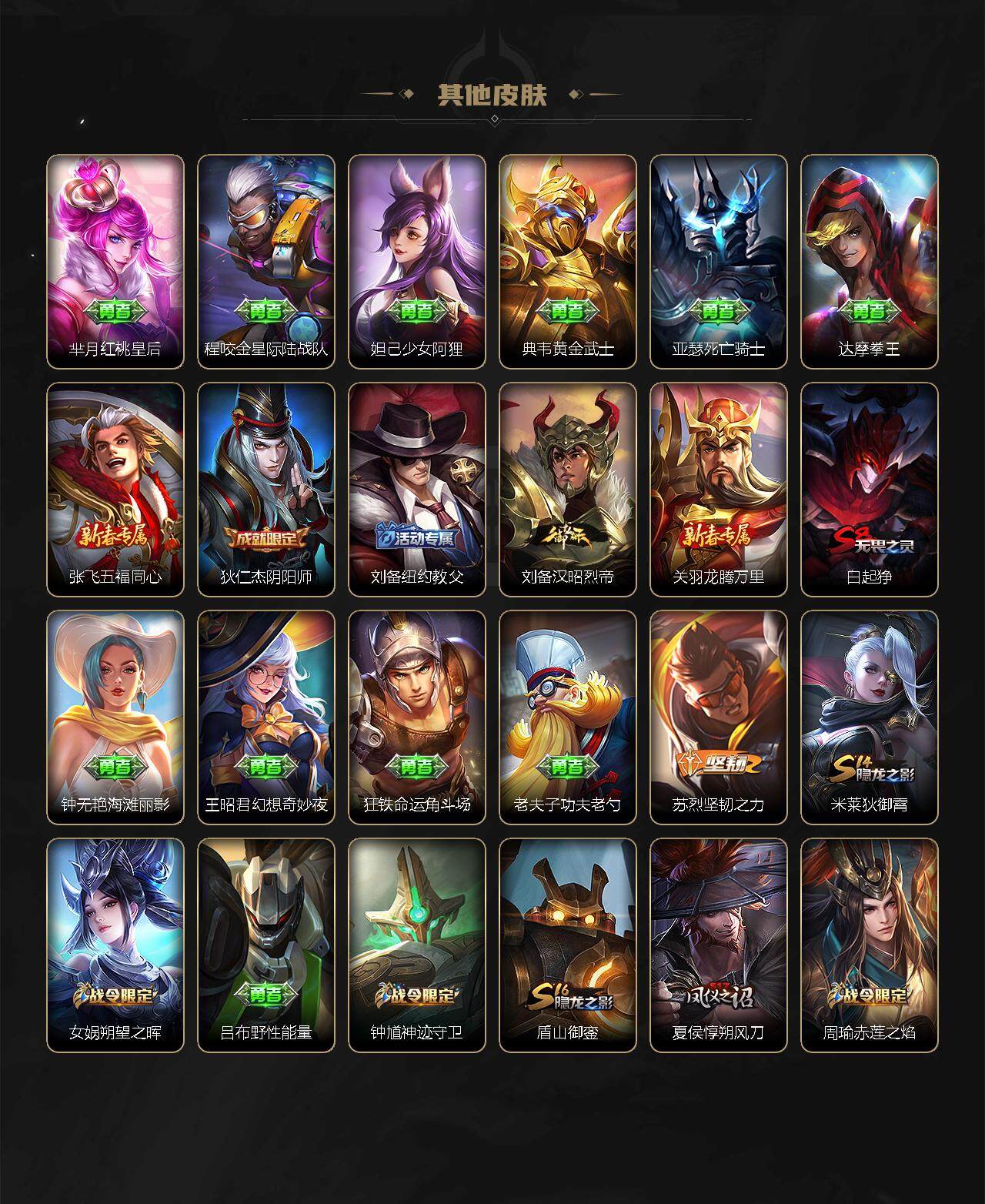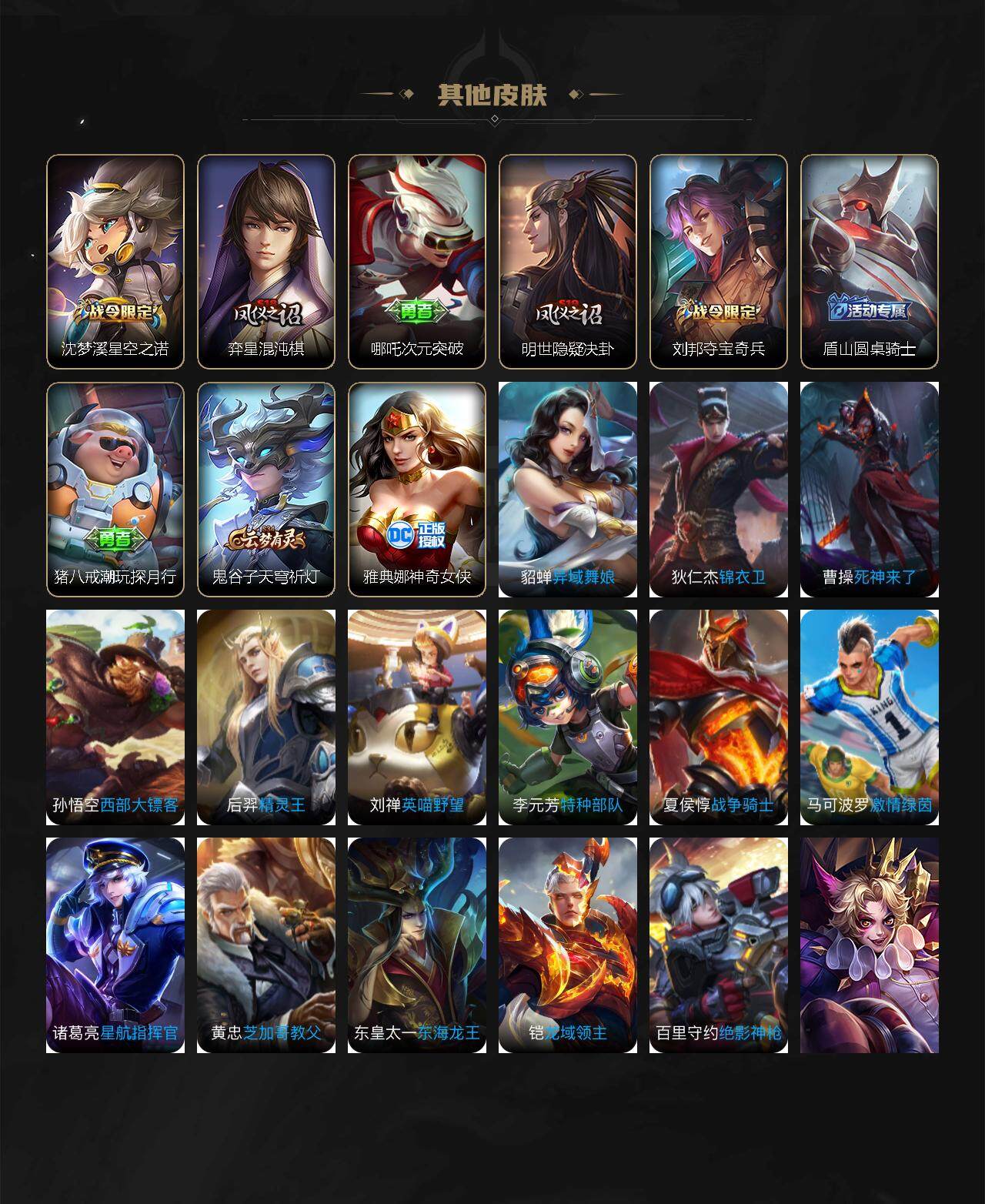 【其他皮肤】:项羽海滩派对,韩信教廷特使,韩信街头霸王,露娜哥特玫瑰,赵云白执事,赵云忍炎影,芈月红桃皇后,程咬金星际陆战队,妲己少女阿狸,典韦黄金武士,亚瑟死亡骑士,达摩拳王,张飞五福同心,狄仁杰阴阳师,刘备纽约教父,刘备汉昭烈帝,关羽龙腾万里,白起狰,钟无艳海滩丽影,王昭君幻想奇妙夜,狂铁命运角斗场,老夫子功夫老勺,苏烈坚韧之力,