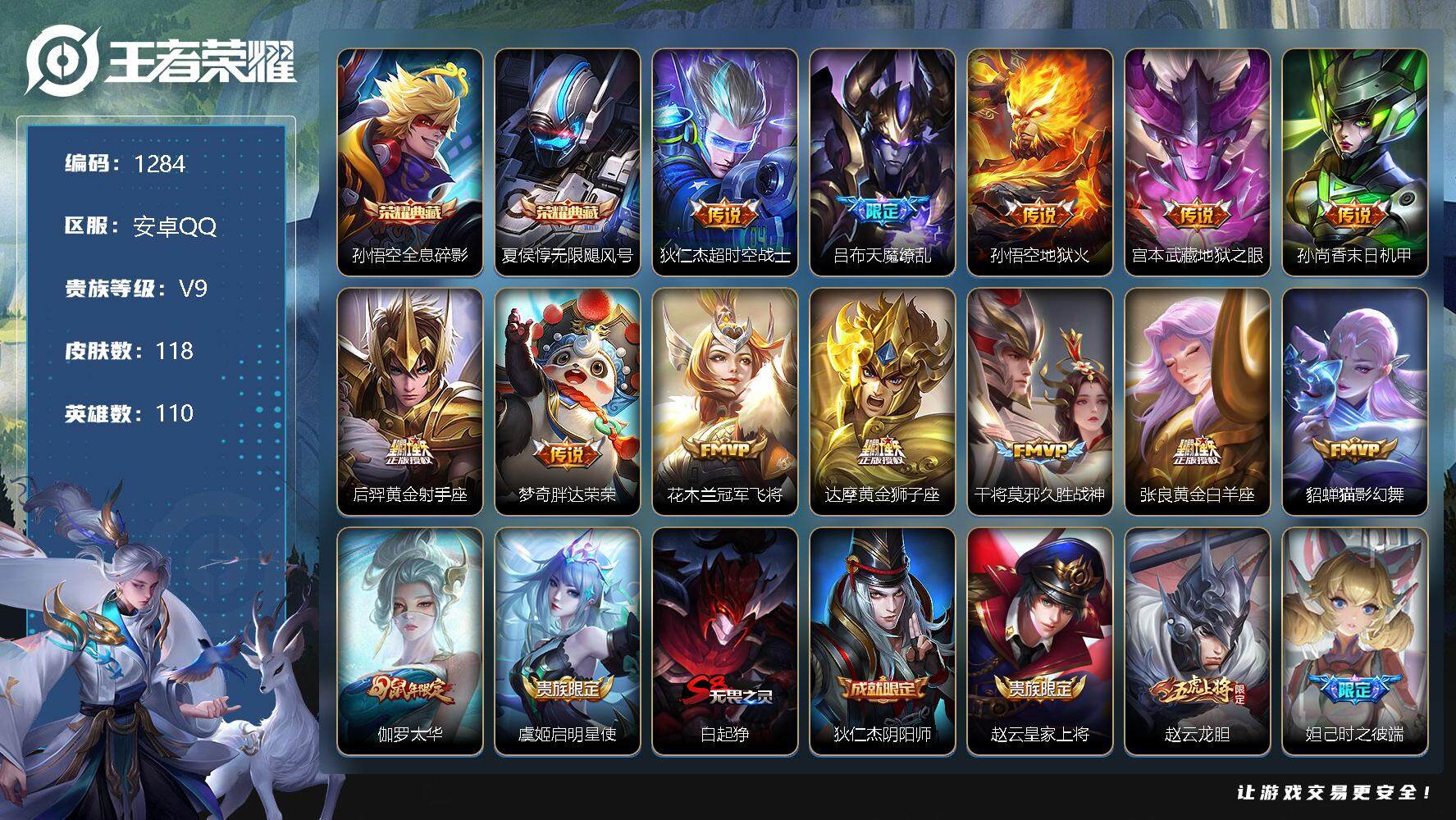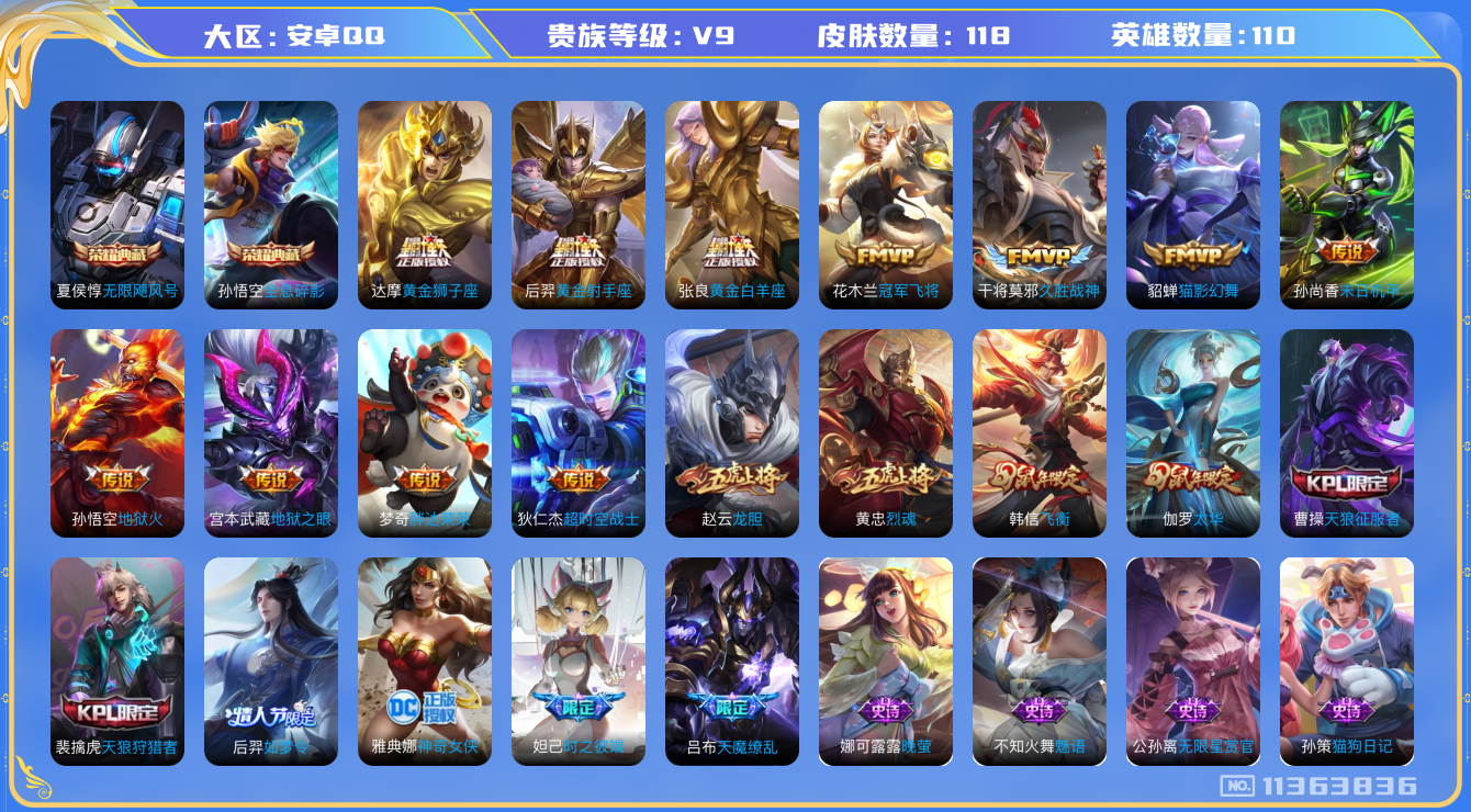 [11363836]【商品标题】:安卓Q-V0-荣耀黄金IV段位-110英雄-118皮肤-2典藏-0珍品无双-0无双-0珍品传说-14传说-35史诗