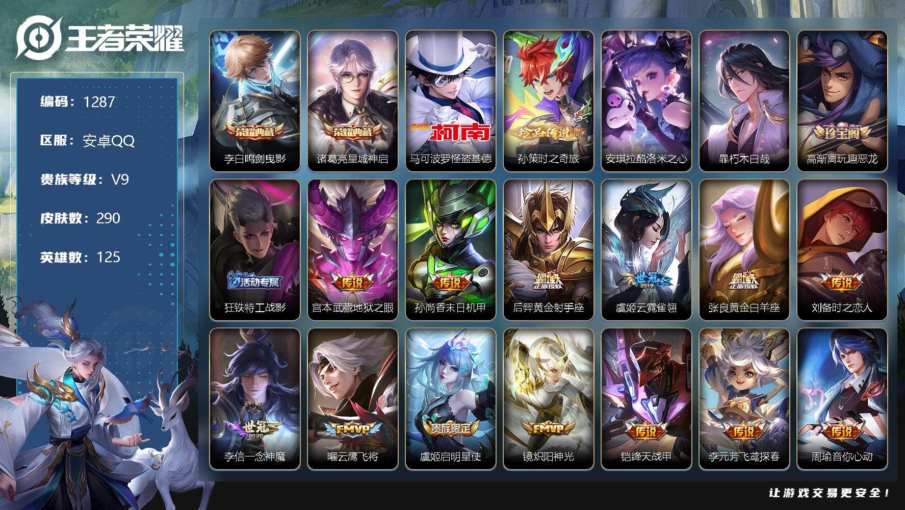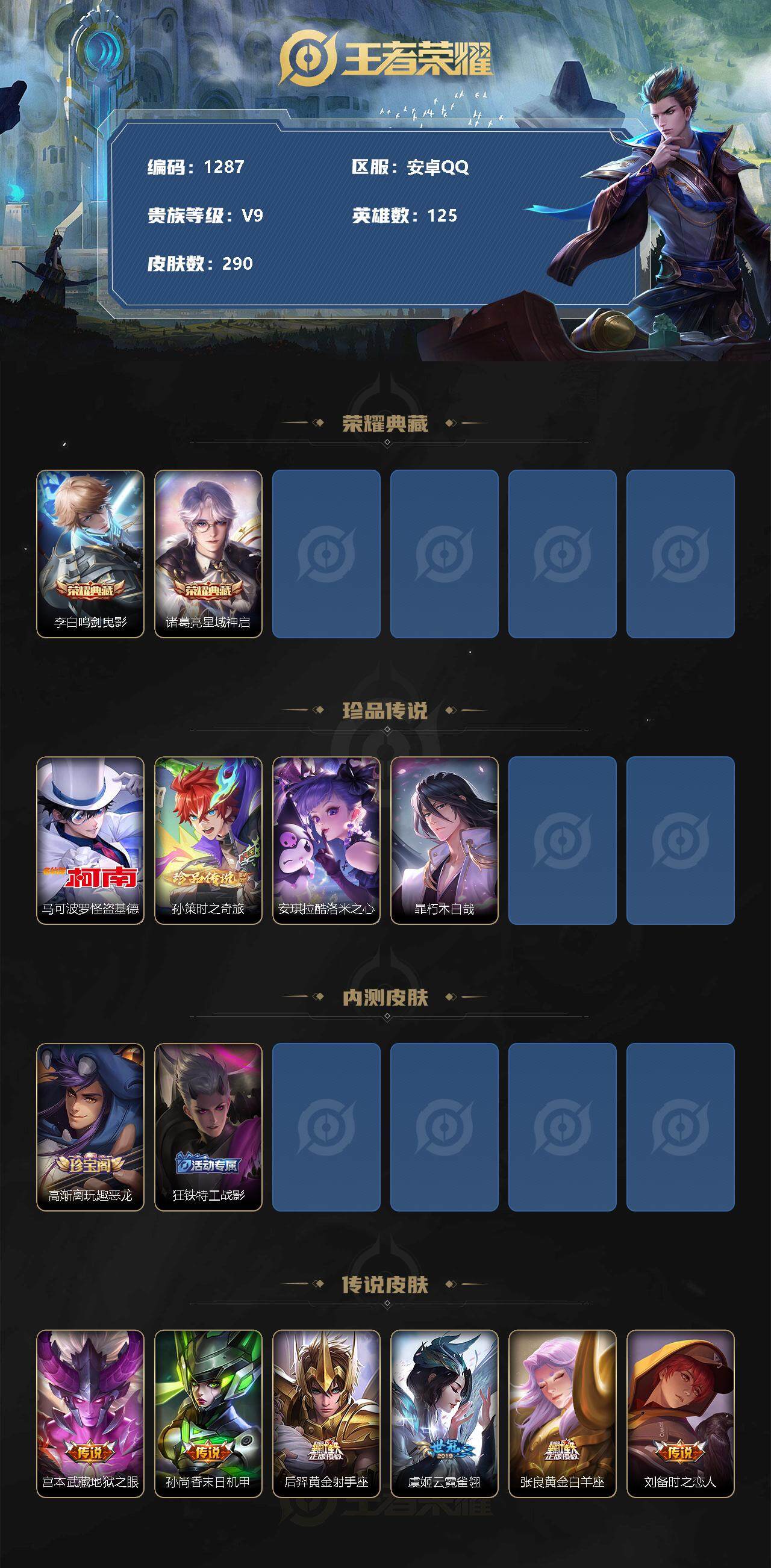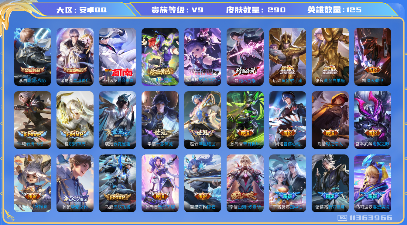 [11363966]【商品标题】:安卓Q-V9-最强王者段位-125英雄-290皮肤-2典藏-0珍品无双-0无双-4珍品传说-35传说-95史诗