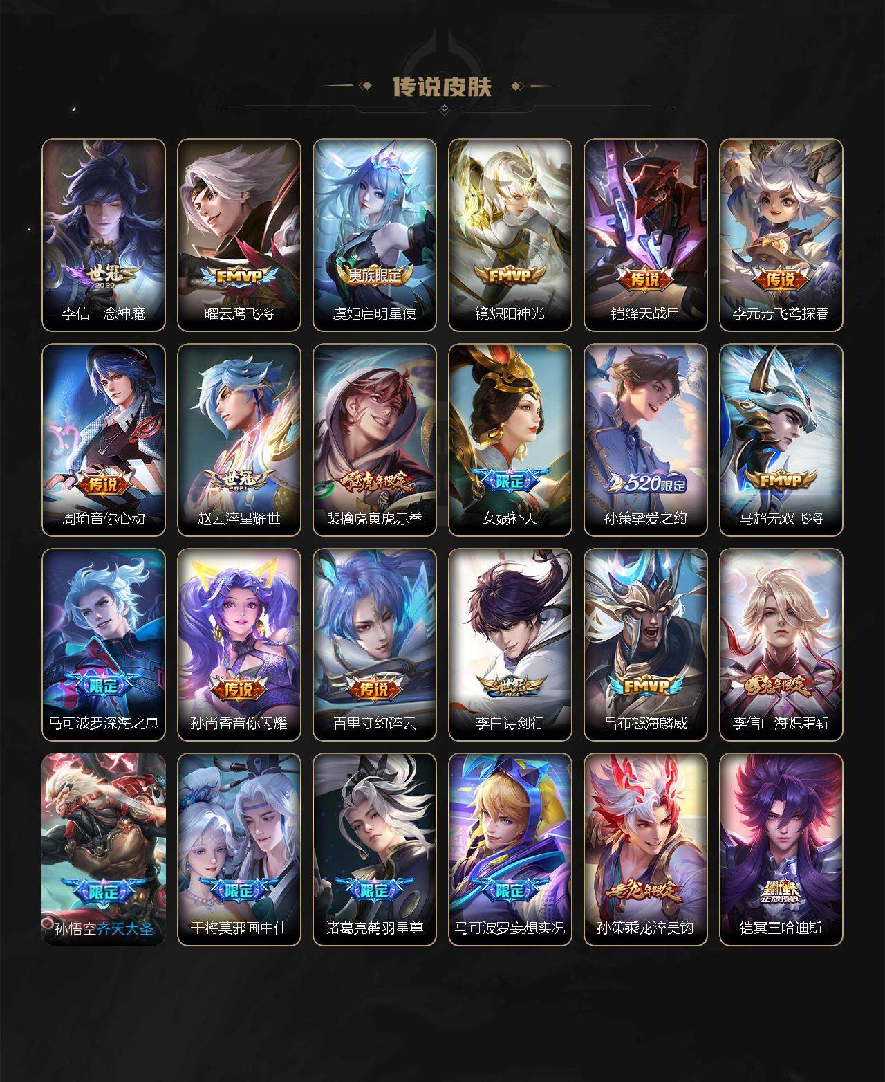 【传说皮肤】:女娲愿照千秋盛,妲己愿照众生和,虞姬愿照岁时盈,云缨幻光神枪,桑启鸣野蒿,铠冥王哈迪斯,孙策乘龙淬吴钩,马可波罗妄想实况,诸葛亮鹤羽星尊,干将莫邪画中仙,孙悟空齐天大圣,李信山海炽霜斩,吕布怒海麟威,李白诗剑行,百里守约碎云,孙尚香音你闪耀,马可波罗深海之息,马超无双飞将,孙策挚爱之约,女娲补天,裴擒虎寅虎赤拳,赵云淬星耀世,周瑜音你心动,李元芳飞鸢探春,铠绛天战甲,镜炽阳神光,虞姬启明星使,曜云鹰飞将,李信一念神魔,刘备时之恋人,张良黄金白羊座,虞姬云霓雀翎,后羿黄金射手座,孙尚香末日机甲,宫本武藏地狱之眼