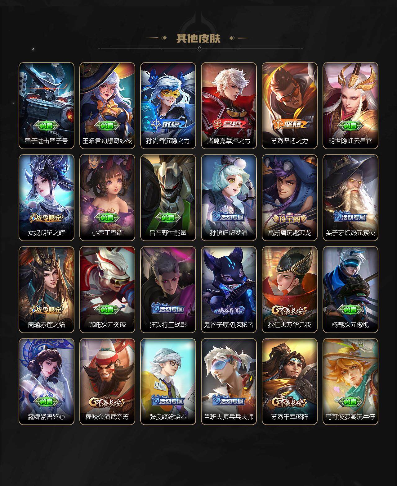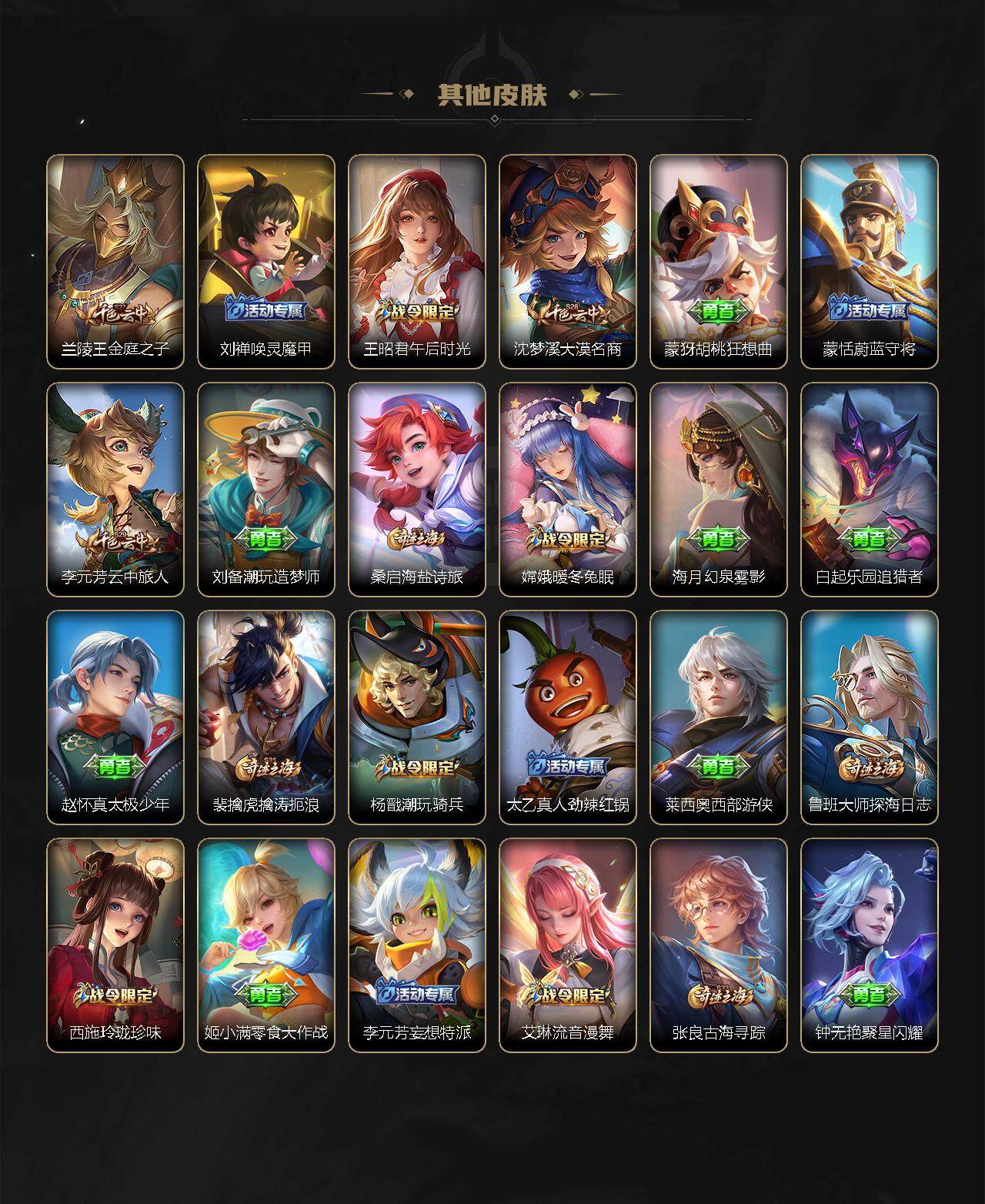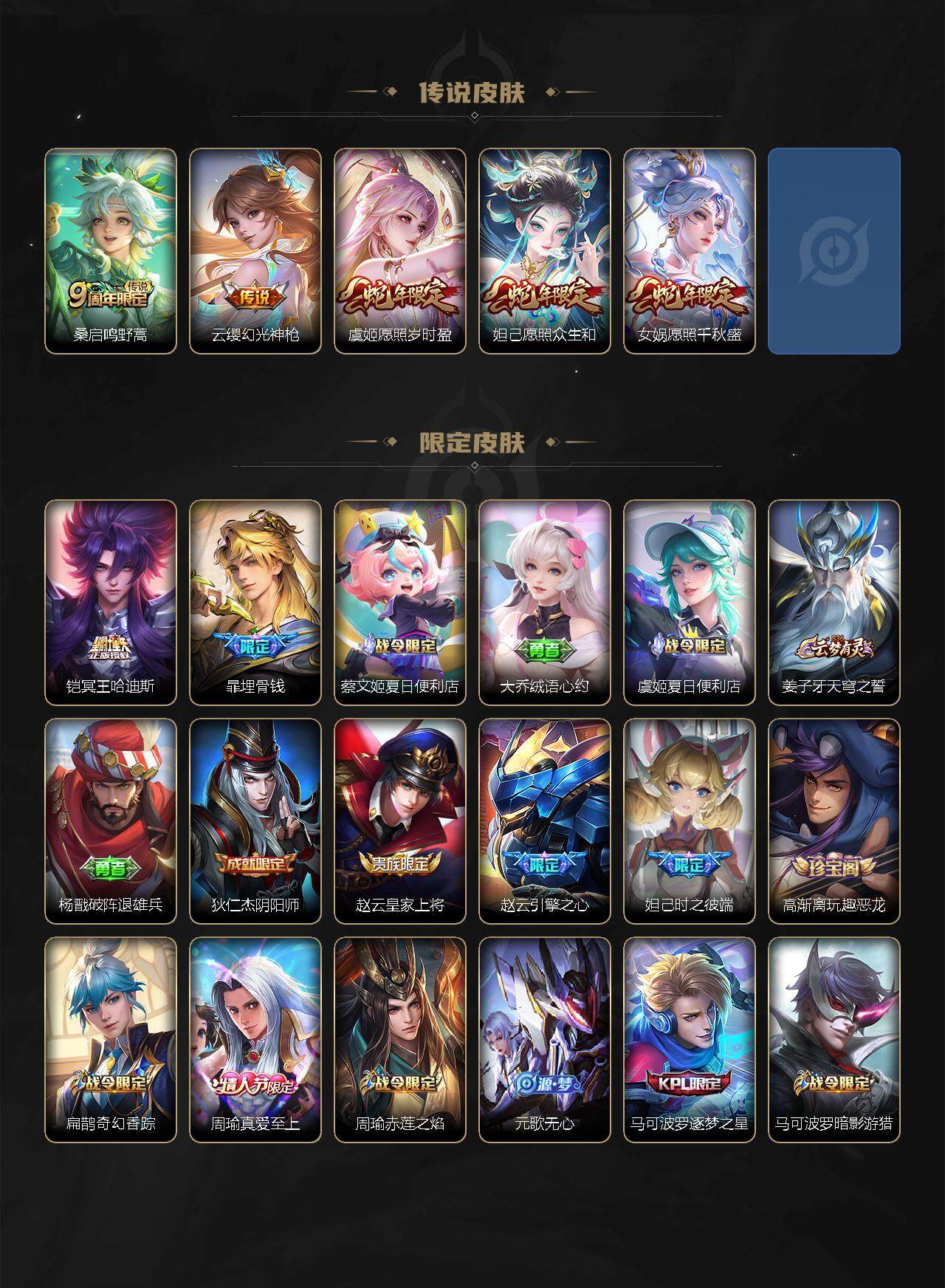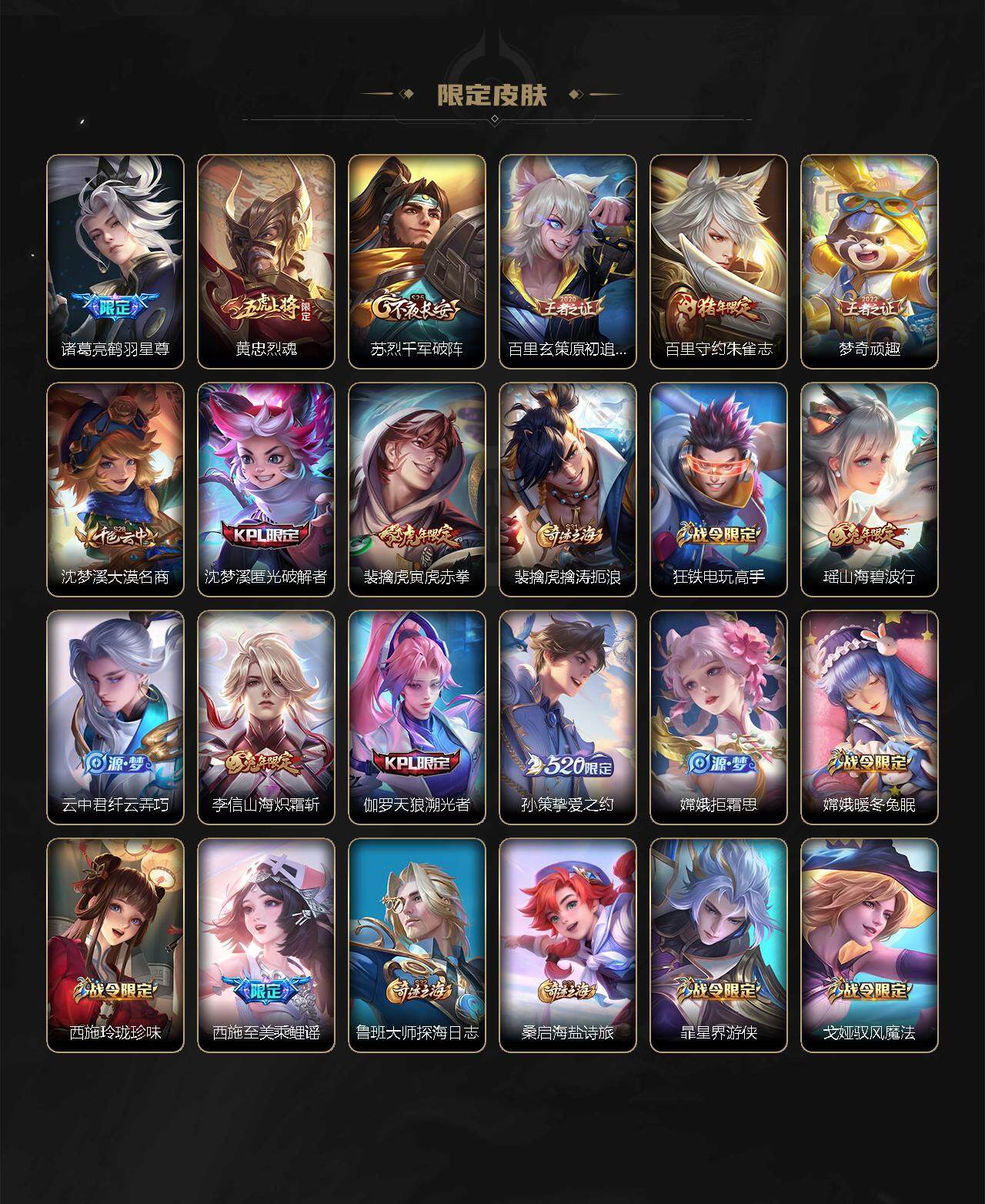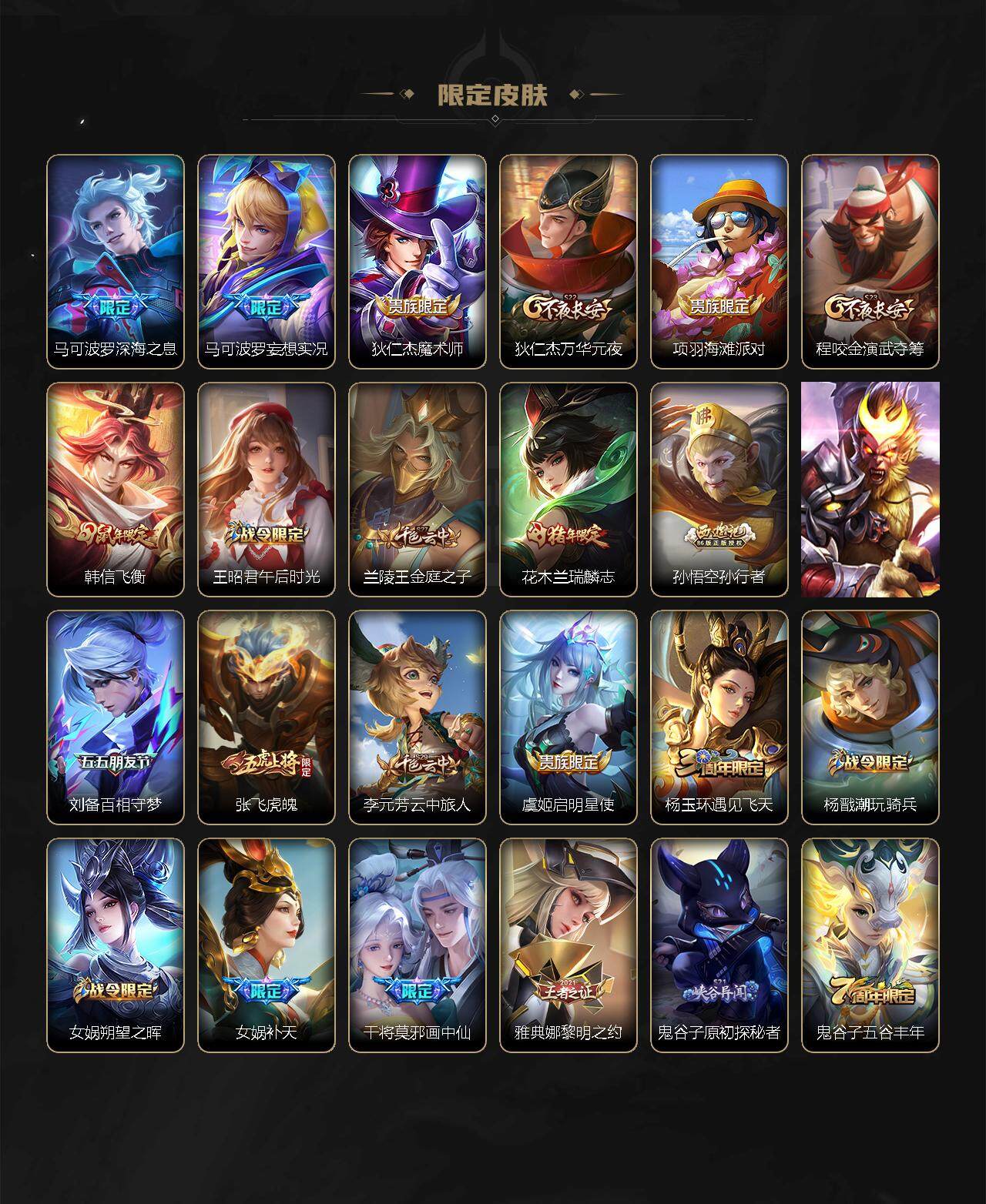 【限定皮肤】:铠冥王哈迪斯,暃埋骨钱,蔡文姬夏日便利店,大乔绒语心约,虞姬夏日便利店,姜子牙天穹之誓,杨戬破阵退雄兵,狄仁杰阴阳师,赵云皇家上将,赵云引擎之心,妲己时之彼端,高渐离玩趣恶龙,扁鹊奇幻香踪,周瑜真爱至上,周瑜赤莲之焰,元歌无心,马可波罗逐梦之星,马可波罗暗影游猎,马可波罗深海之息,马可波罗妄想实况,狄仁杰魔术师,狄仁杰万华元夜,项羽海滩派对,程咬金演武夺筹,韩信飞衡,王昭君午后时光,兰陵王金庭之子,花木兰瑞麟志,孙悟空孙行者,孙悟空齐天大圣,刘备百相守梦,张飞虎魄,李元芳云中旅人,虞姬启明星使,杨玉环遇见飞天,杨戬潮玩骑兵,女娲朔望之晖,女娲补天,干将莫邪画中仙,雅典娜黎明之约,鬼谷子原初探秘者,鬼谷子五谷丰年,诸葛亮鹤羽星尊,黄忠烈魂,苏烈千军破阵,百里玄策原初追逐者,百里守约朱雀志,梦奇顽趣,沈梦溪大漠名商,沈梦溪匿光破解者,裴擒虎寅虎赤拳,裴擒虎擒涛扼浪,狂铁电玩高手,瑶山海碧波行,云中君纤云弄巧,李信山海炽霜斩,伽罗天狼溯光者,孙策挚爱之约,嫦娥拒霜思,嫦娥暖冬兔眠,西施玲珑珍味,西施至美乘鲤谣,鲁班大师探海日志,桑启海盐诗旅,暃星界游侠,戈娅驭风魔法,艾琳流音漫舞,司空震地狱燃心,阿古朵江河有灵,张良古海寻踪,蒙恬荣光圣徽,高渐离燃音魔法,妲己灵卜魔法,鬼谷子天穹祈灯,伽罗琥珀纪元,孙策乘龙淬吴钩,沈梦溪龙舞盛年,鲁班七号蔬乡物语,李元芳蔬乡物语,刘邦剑破天穹,程咬金群星魔术团,