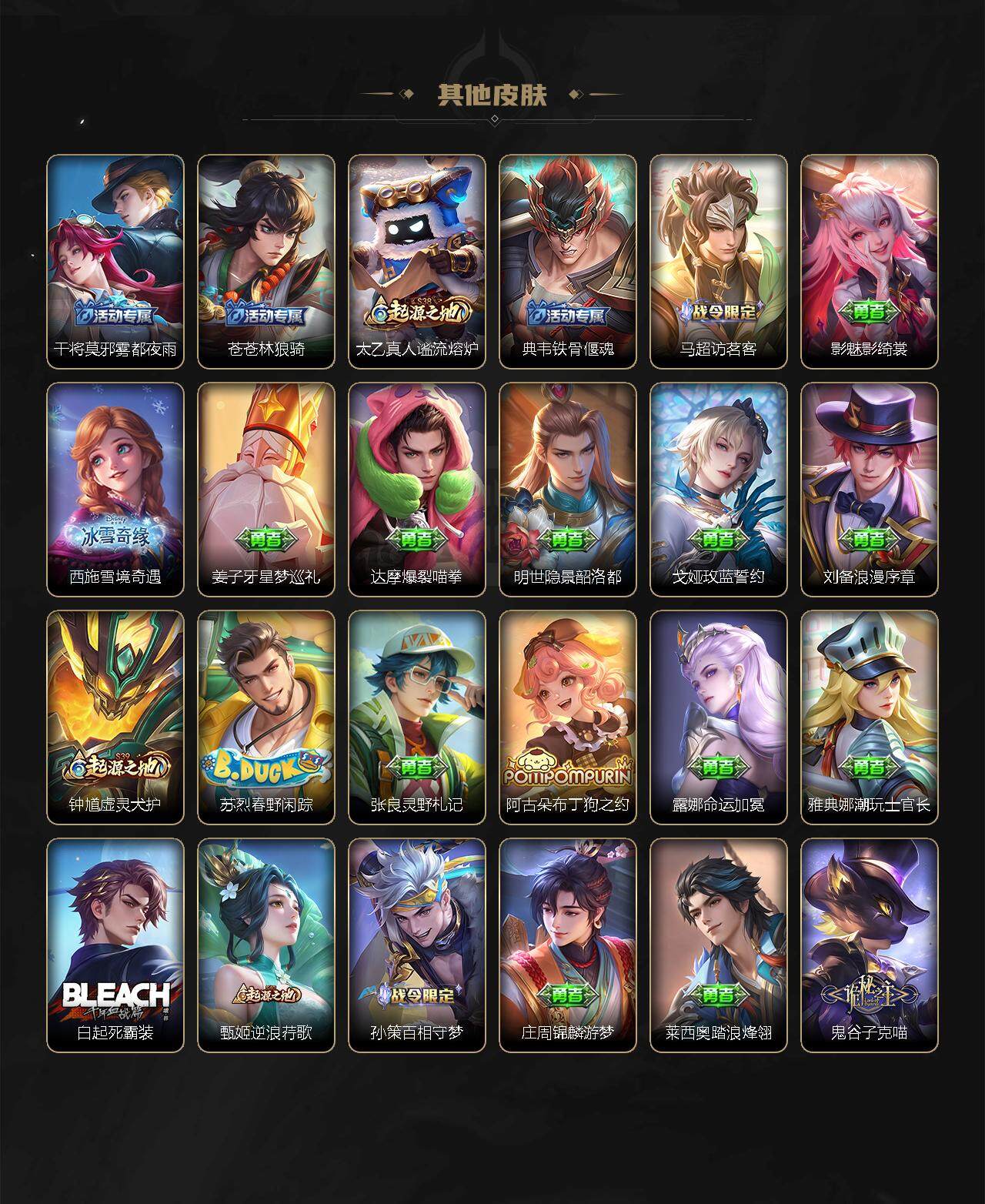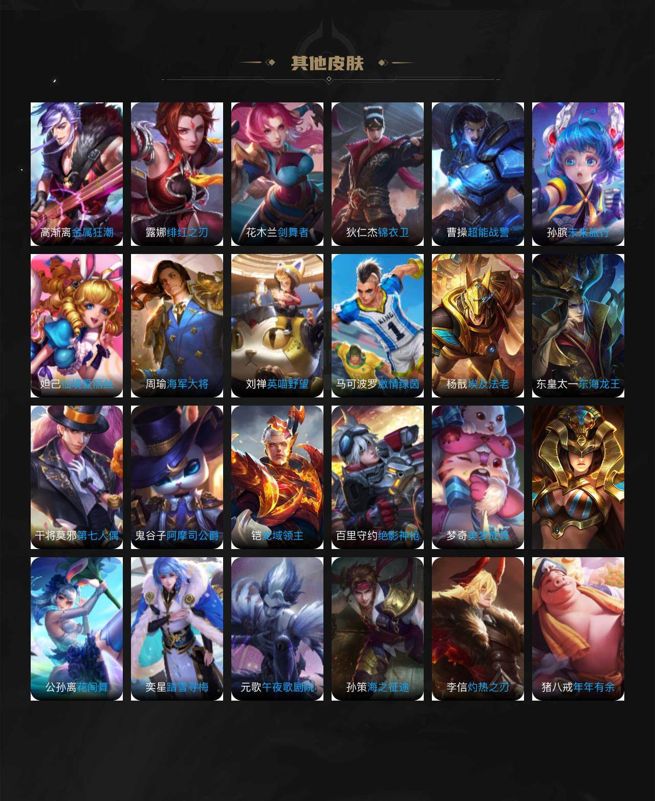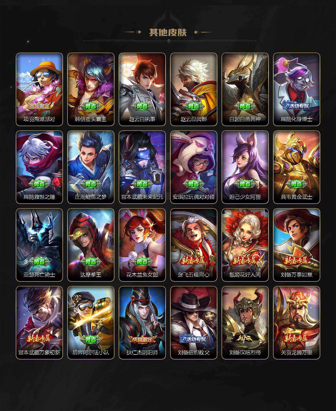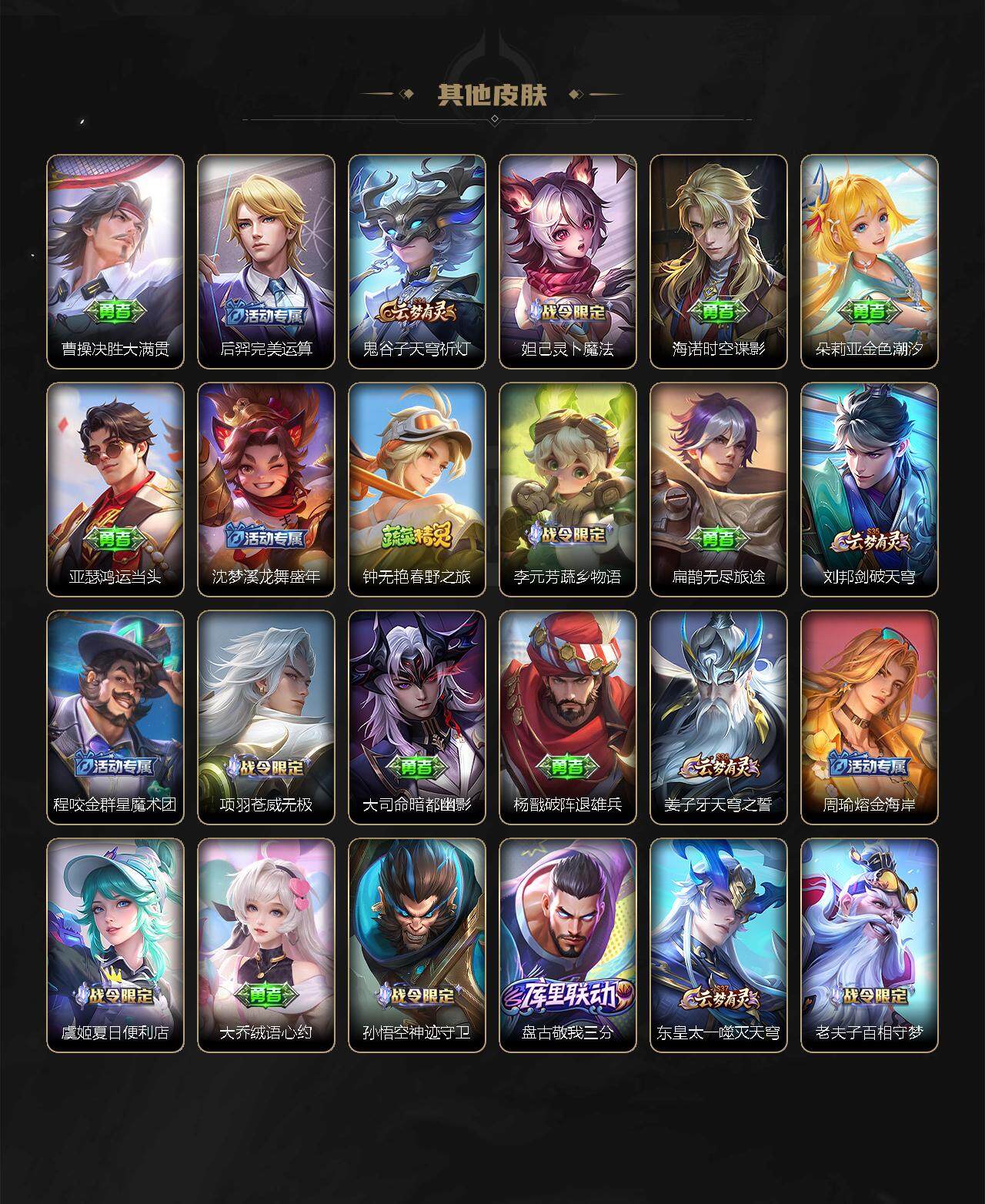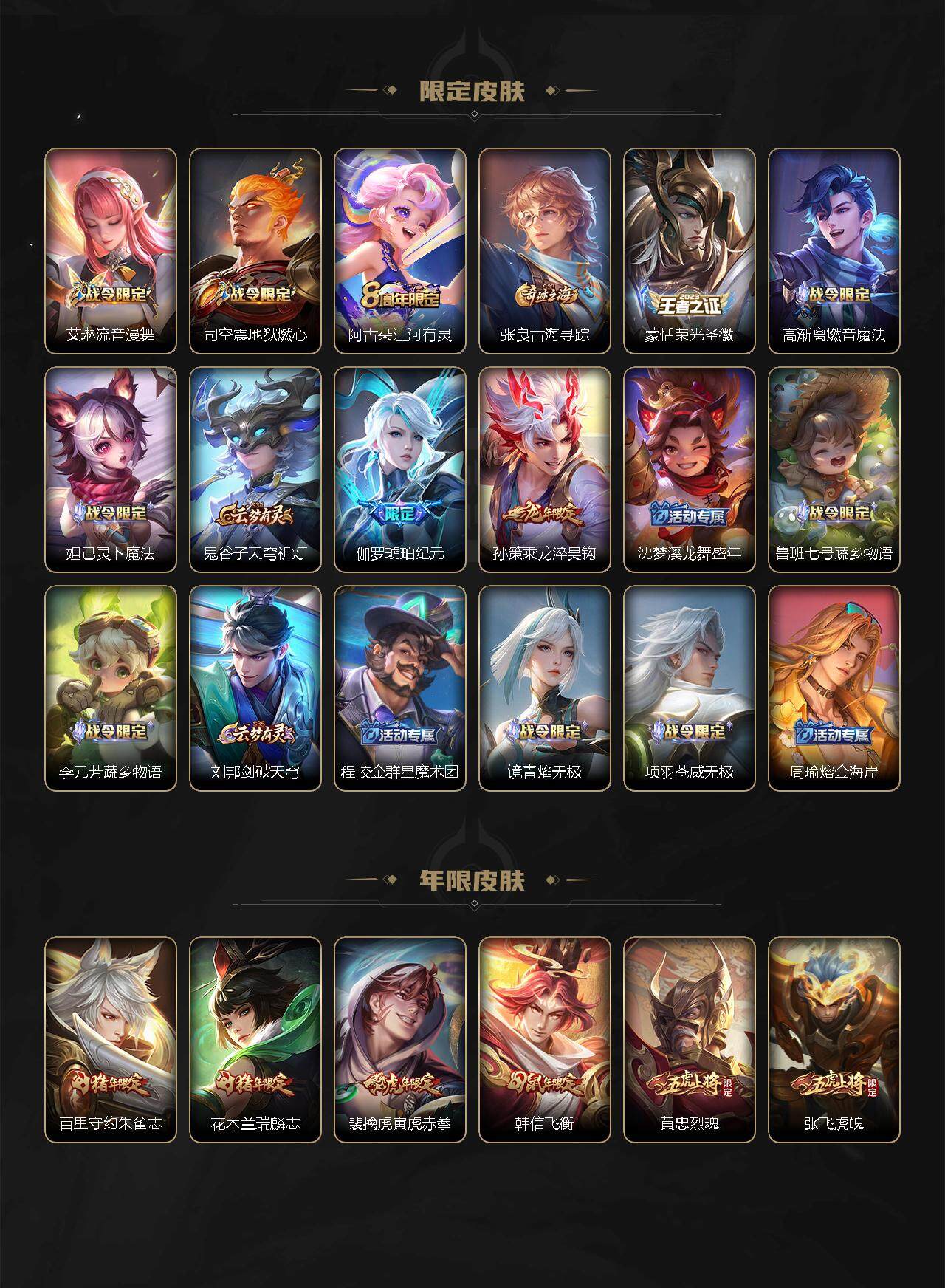 【限定皮肤】:铠冥王哈迪斯,暃埋骨钱,蔡文姬夏日便利店,大乔绒语心约,虞姬夏日便利店,姜子牙天穹之誓,杨戬破阵退雄兵,狄仁杰阴阳师,赵云皇家上将,赵云引擎之心,妲己时之彼端,高渐离玩趣恶龙,扁鹊奇幻香踪,周瑜真爱至上,周瑜赤莲之焰,元歌无心,马可波罗逐梦之星,马可波罗暗影游猎,马可波罗深海之息,马可波罗妄想实况,狄仁杰魔术师,狄仁杰万华元夜,项羽海滩派对,程咬金演武夺筹,韩信飞衡,王昭君午后时光,兰陵王金庭之子,花木兰瑞麟志,孙悟空孙行者,孙悟空齐天大圣,刘备百相守梦,张飞虎魄,李元芳云中旅人,虞姬启明星使,杨玉环遇见飞天,杨戬潮玩骑兵,女娲朔望之晖,女娲补天,干将莫邪画中仙,雅典娜黎明之约,鬼谷子原初探秘者,鬼谷子五谷丰年,诸葛亮鹤羽星尊,黄忠烈魂,苏烈千军破阵,百里玄策原初追逐者,百里守约朱雀志,梦奇顽趣,沈梦溪大漠名商,沈梦溪匿光破解者,裴擒虎寅虎赤拳,裴擒虎擒涛扼浪,狂铁电玩高手,瑶山海碧波行,云中君纤云弄巧,李信山海炽霜斩,伽罗天狼溯光者,孙策挚爱之约,嫦娥拒霜思,嫦娥暖冬兔眠,西施玲珑珍味,西施至美乘鲤谣,鲁班大师探海日志,桑启海盐诗旅,暃星界游侠,戈娅驭风魔法,艾琳流音漫舞,司空震地狱燃心,阿古朵江河有灵,张良古海寻踪,蒙恬荣光圣徽,高渐离燃音魔法,妲己灵卜魔法,鬼谷子天穹祈灯,伽罗琥珀纪元,孙策乘龙淬吴钩,沈梦溪龙舞盛年,鲁班七号蔬乡物语,李元芳蔬乡物语,刘邦剑破天穹,程咬金群星魔术团,