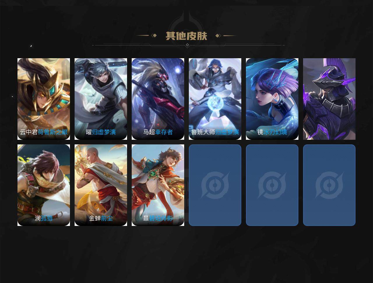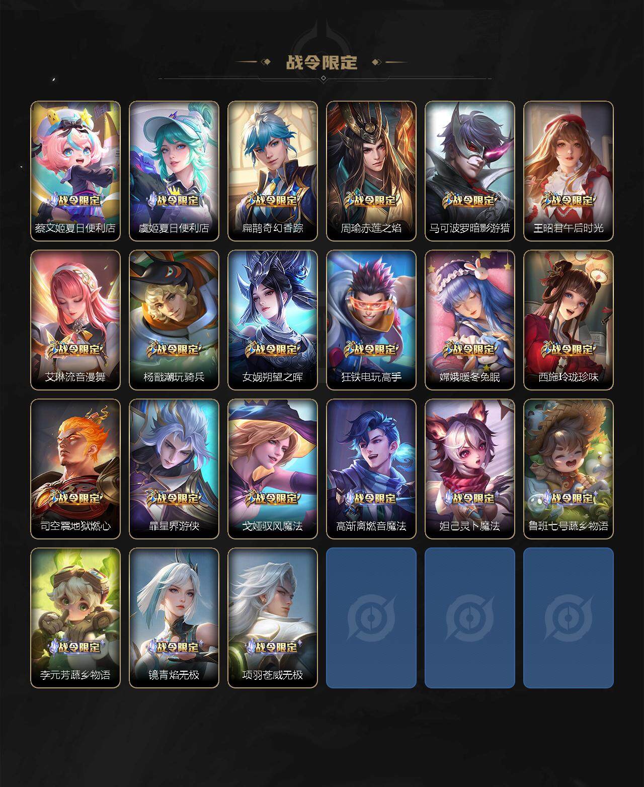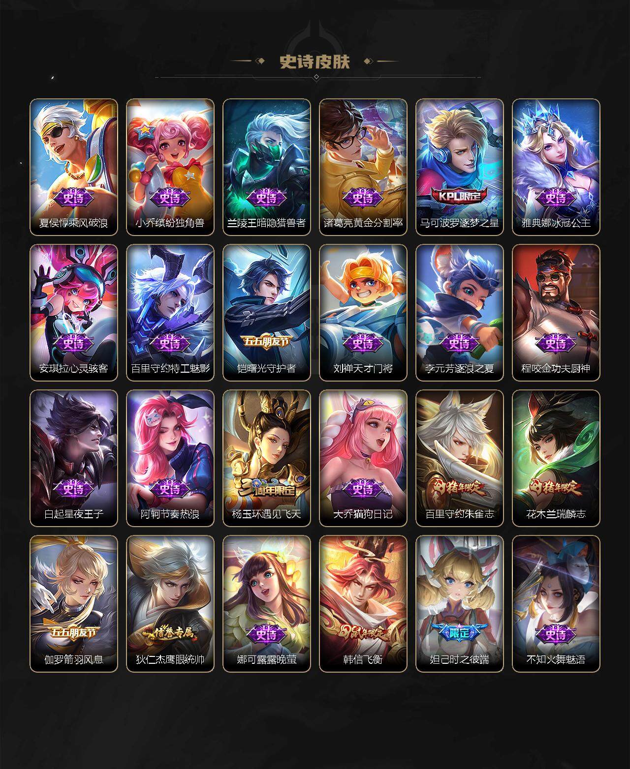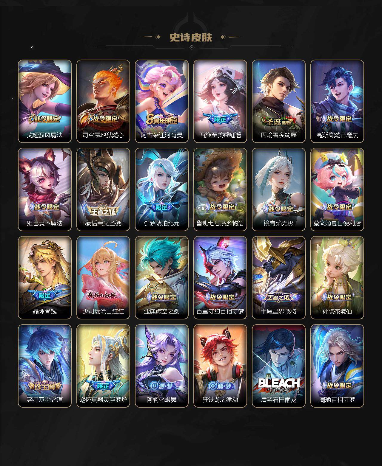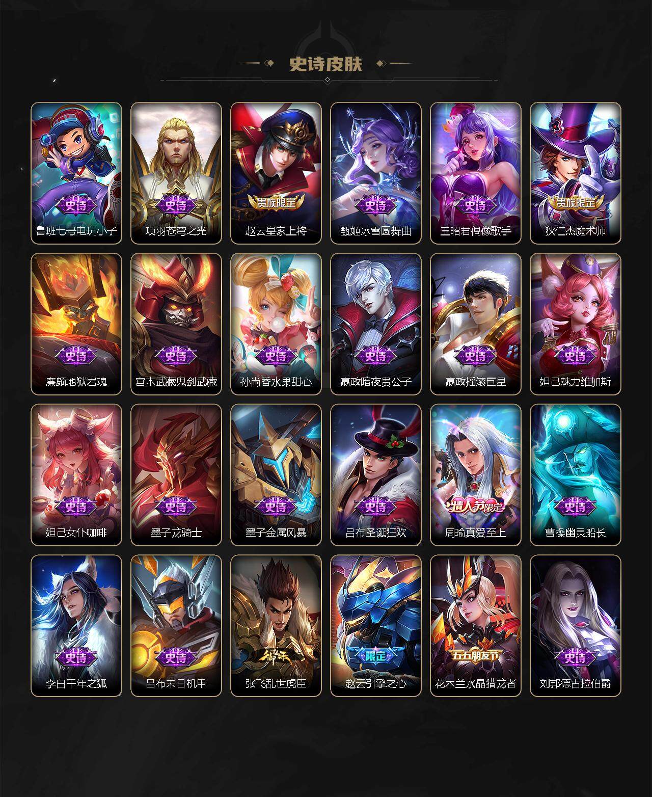 【限定皮肤】:铠冥王哈迪斯,暃埋骨钱,蔡文姬夏日便利店,大乔绒语心约,虞姬夏日便利店,姜子牙天穹之誓,杨戬破阵退雄兵,狄仁杰阴阳师,赵云皇家上将,赵云引擎之心,妲己时之彼端,高渐离玩趣恶龙,扁鹊奇幻香踪,周瑜真爱至上,周瑜赤莲之焰,元歌无心,马可波罗逐梦之星,马可波罗暗影游猎,马可波罗深海之息,马可波罗妄想实况,狄仁杰魔术师,狄仁杰万华元夜,项羽海滩派对,程咬金演武夺筹,韩信飞衡,王昭君午后时光,兰陵王金庭之子,花木兰瑞麟志,孙悟空孙行者,孙悟空齐天大圣,刘备百相守梦,张飞虎魄,李元芳云中旅人,虞姬启明星使,杨玉环遇见飞天,杨戬潮玩骑兵,女娲朔望之晖,女娲补天,干将莫邪画中仙,雅典娜黎明之约,鬼谷子原初探秘者,鬼谷子五谷丰年,诸葛亮鹤羽星尊,黄忠烈魂,苏烈千军破阵,百里玄策原初追逐者,百里守约朱雀志,梦奇顽趣,沈梦溪大漠名商,沈梦溪匿光破解者,裴擒虎寅虎赤拳,裴擒虎擒涛扼浪,狂铁电玩高手,瑶山海碧波行,云中君纤云弄巧,李信山海炽霜斩,伽罗天狼溯光者,孙策挚爱之约,嫦娥拒霜思,嫦娥暖冬兔眠,西施玲珑珍味,西施至美乘鲤谣,鲁班大师探海日志,桑启海盐诗旅,暃星界游侠,戈娅驭风魔法,艾琳流音漫舞,司空震地狱燃心,阿古朵江河有灵,张良古海寻踪,蒙恬荣光圣徽,高渐离燃音魔法,妲己灵卜魔法,鬼谷子天穹祈灯,伽罗琥珀纪元,孙策乘龙淬吴钩,沈梦溪龙舞盛年,鲁班七号蔬乡物语,李元芳蔬乡物语,刘邦剑破天穹,程咬金群星魔术团,