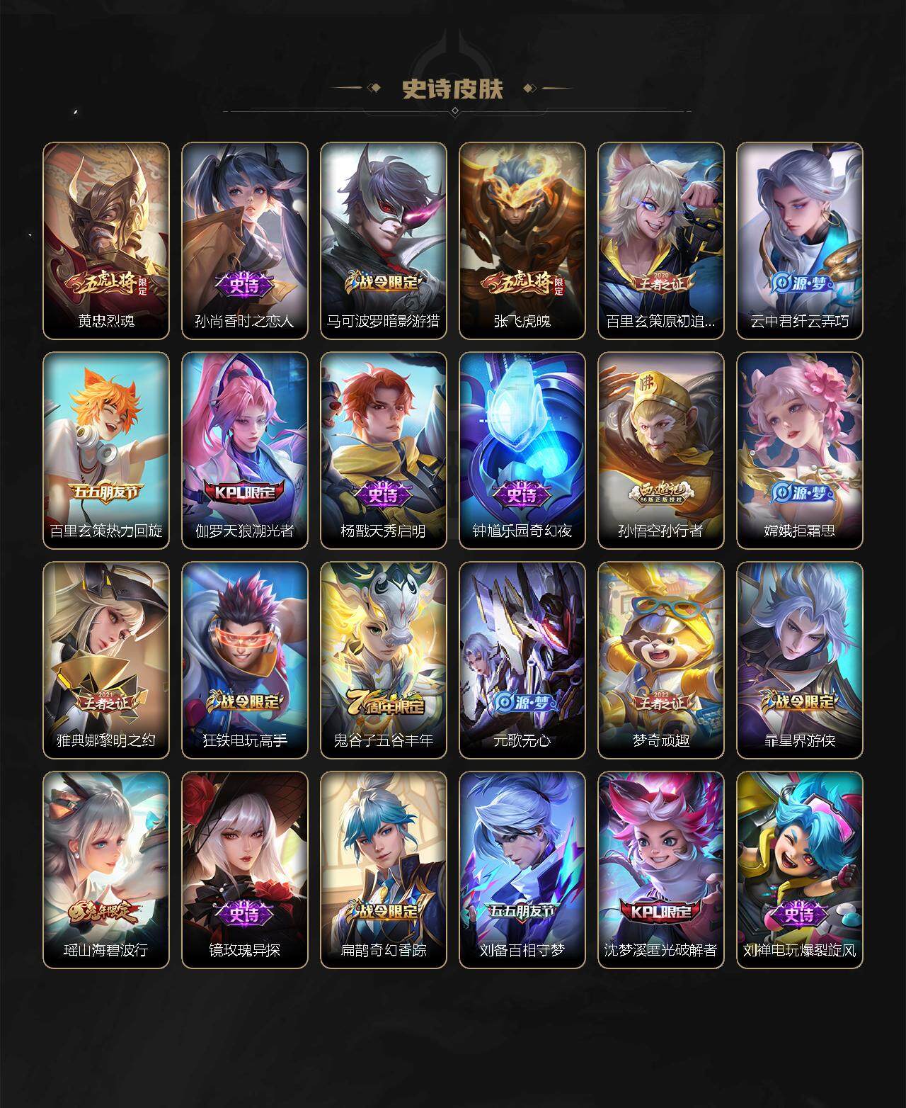 黄忠烈魂,张飞虎魄,韩信飞衡,伽罗天狼溯光者,马可波罗逐梦之星,花木兰瑞麟志,百里守约朱雀志,周瑜真爱至上,妲己时之彼端,赵云引擎之心,孙悟空孙行者,裴擒虎寅虎·赤拳,女娲补天,马可波罗深海之息,李白诗剑行,瑶山海·碧波行,西施至美·乘鲤谣,桑启鸣野蒿,虞姬愿照·岁时盈,妲己愿照·众生和,女娲愿照·千秋盛