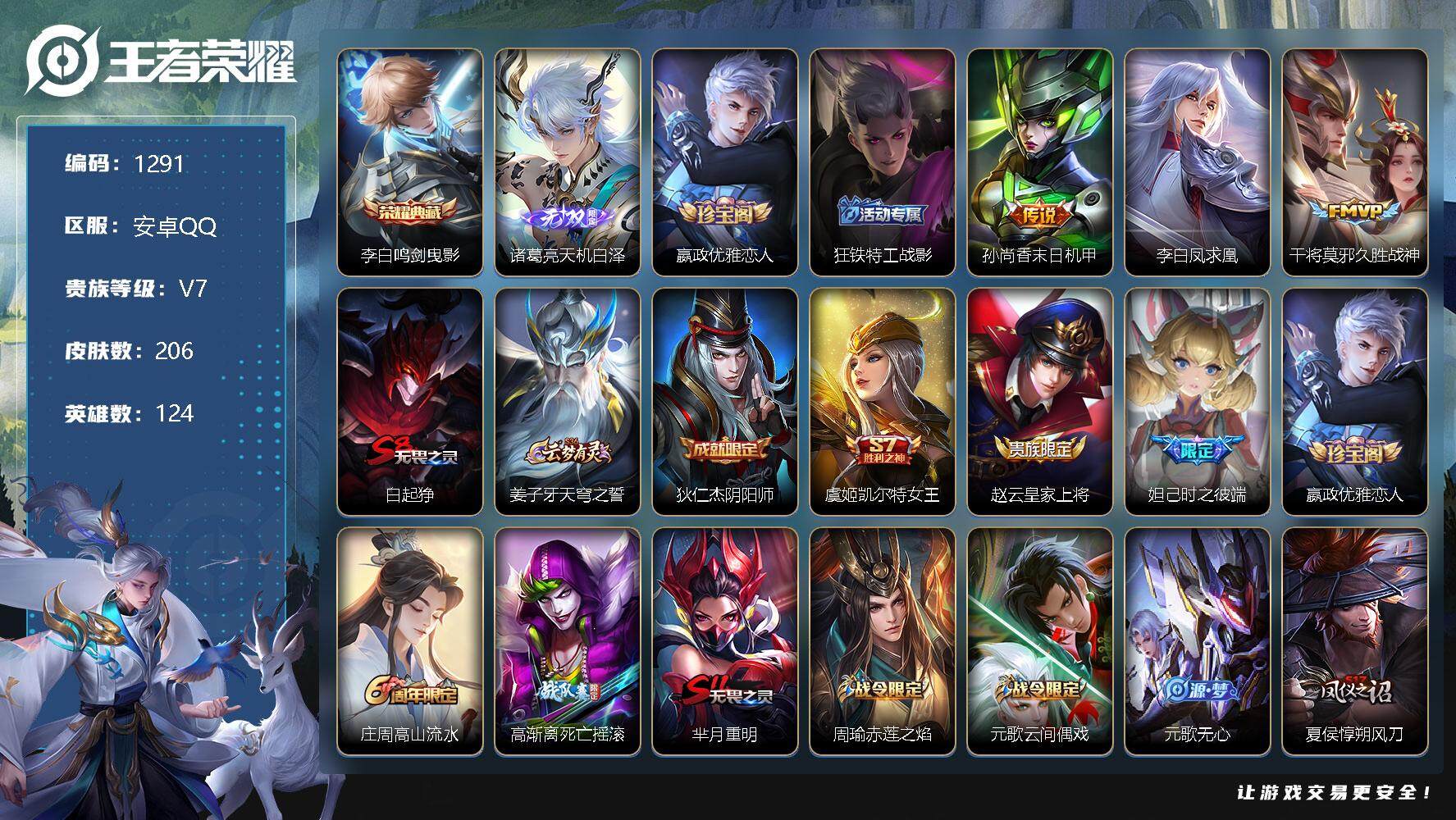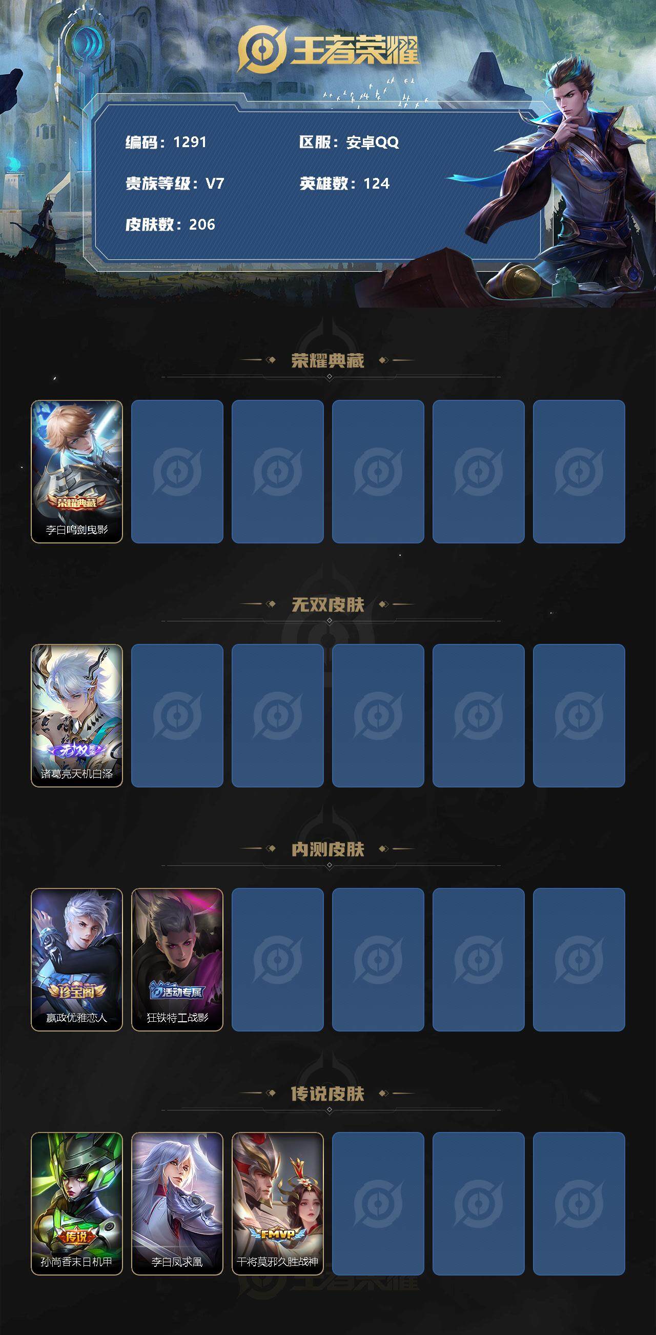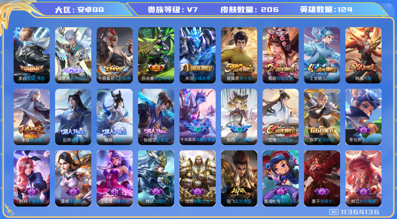 [11364136]【商品标题】:安卓Q-V7-最强王者段位-124英雄-206皮肤-1典藏-0珍品无双-1无双-0珍品传说-3传说-71史诗