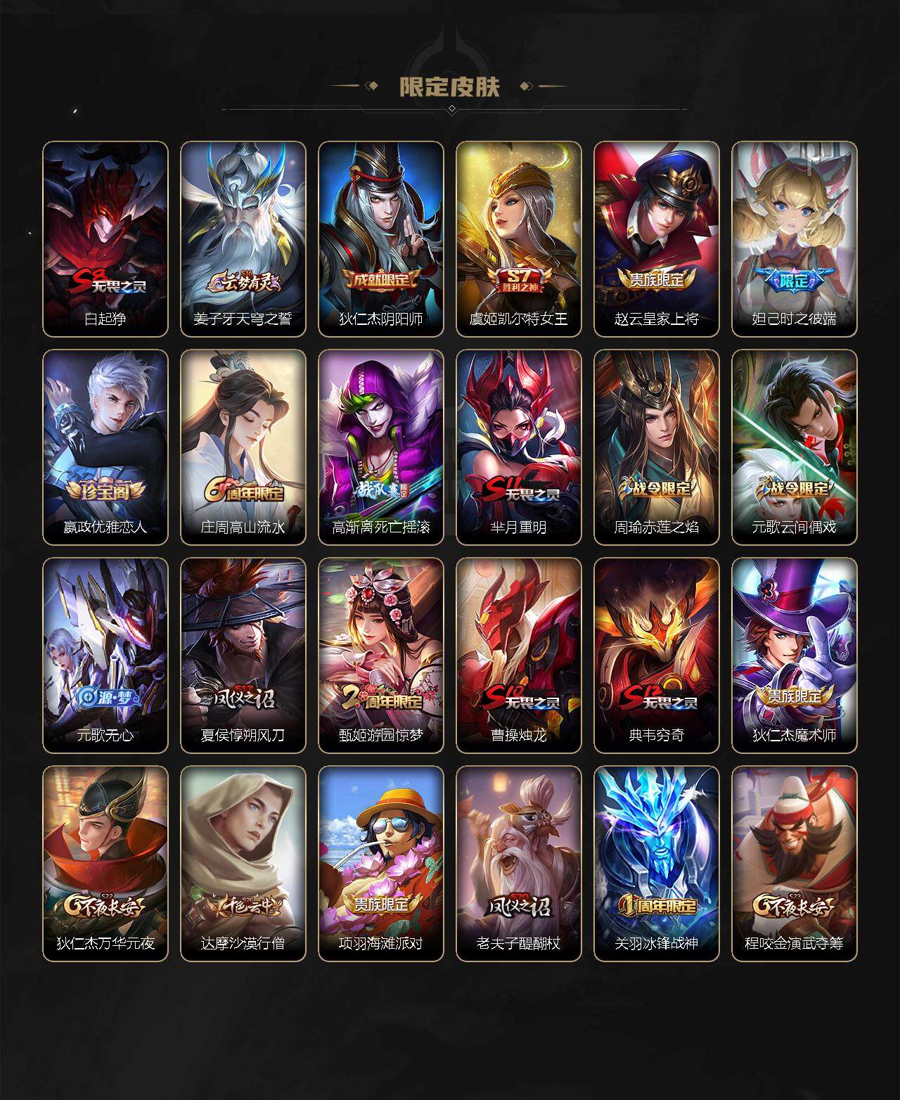 【限定皮肤】:白起狰,姜子牙天穹之誓,狄仁杰阴阳师,虞姬凯尔特女王,赵云皇家上将,妲己时之彼端,嬴政优雅恋人,庄周高山流水,高渐离死亡摇滚,芈月重明,周瑜赤莲之焰,元歌云间偶戏,元歌无心,夏侯惇朔风刀,甄姬游园惊梦,曹操烛龙,典韦穷奇,狄仁杰魔术师,狄仁杰万华元夜,达摩沙漠行僧,项羽海滩派对,老夫子醍醐杖,关羽冰锋战神,程咬金演武夺筹,韩信飞衡,兰陵王驯魔猎人,兰陵王金庭之子,孙悟空至尊宝,牛魔御旌,后羿如梦令,李元芳银河之约,李元芳云中旅人,钟馗驱傩正仪,干将莫邪冰霜恋舞曲,雅典娜单词大作战,雅典娜黎明之约,蔡文姬繁星吟游,太乙真人饕餮,太乙真人华丽摇滚,鬼谷子原初探秘者,苏烈千军破阵,百里玄策原初追逐者,弈星混沌棋,梦奇顽趣,沈梦溪星空之诺,沈梦溪大漠名商,明世隐疑决卦,裴擒虎李小龙,狂铁御狮,米莱狄御霄,云中君纤云弄巧,盾山御銮,上官婉儿梁祝,嫦娥如梦令,嫦娥拒霜思,蒙犽狂想玩偶喵,鲁班大师探海日志,桑启海盐诗旅,艾琳流音漫舞,张良古海寻踪,蒙犽百解令,鬼谷子天穹祈灯,刘邦剑破天穹,镜青焰无极