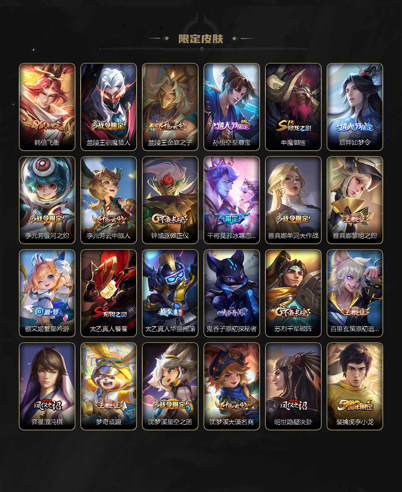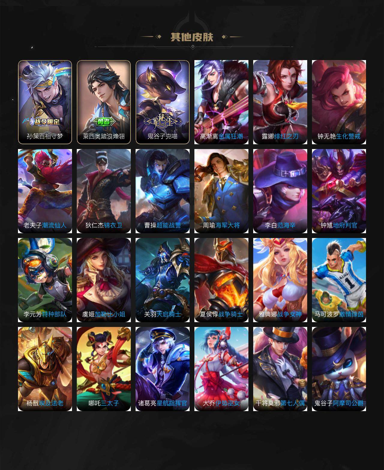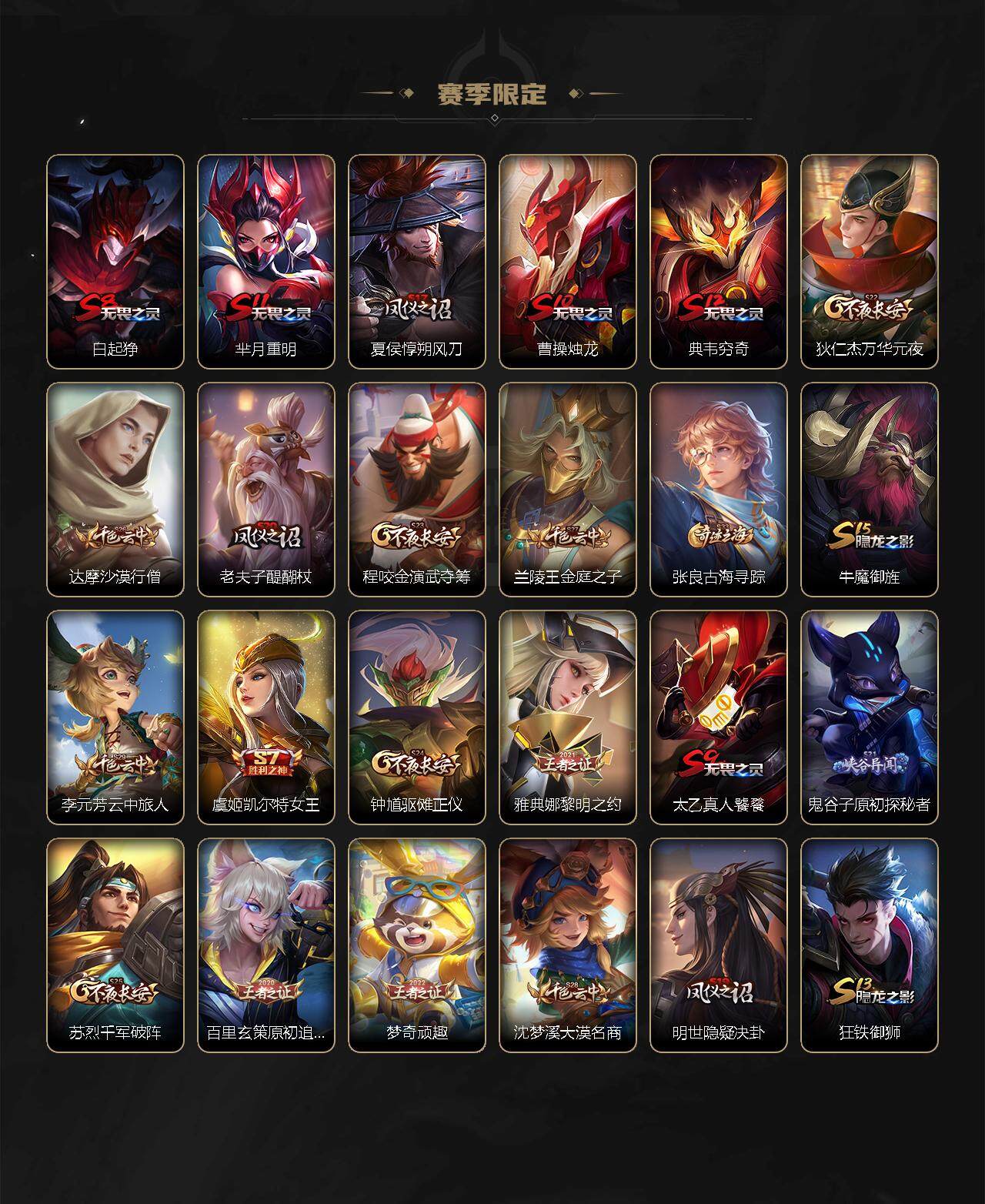【赛季限定】:白起狰,芈月重明,夏侯惇朔风刀,曹操烛龙,典韦穷奇,狄仁杰万华元夜,达摩沙漠行僧,老夫子醍醐杖,程咬金演武夺筹,兰陵王金庭之子,张良古海寻踪,牛魔御旌,李元芳云中旅人,虞姬凯尔特女王,钟馗驱傩正仪,雅典娜黎明之约,太乙真人饕餮,鬼谷子原初探秘者,苏烈千军破阵,百里玄策原初追逐者,弈星混沌棋,梦奇顽趣,沈梦溪大漠名商,明世隐疑决卦,狂铁御狮,米莱狄御霄,盾山御銮,鲁班大师探海日志,桑启海盐诗旅,鬼谷子天穹祈灯,刘邦剑破天穹,姜子牙天穹之誓