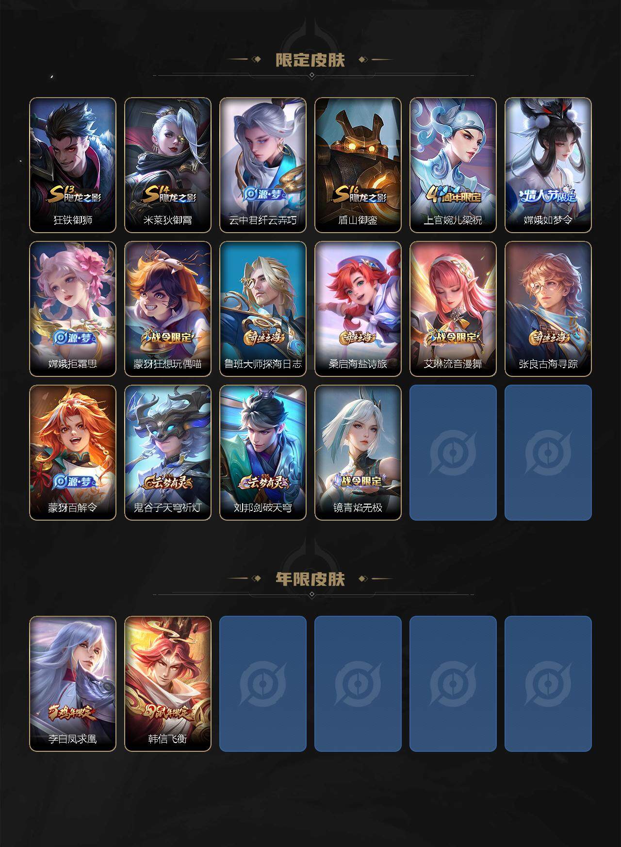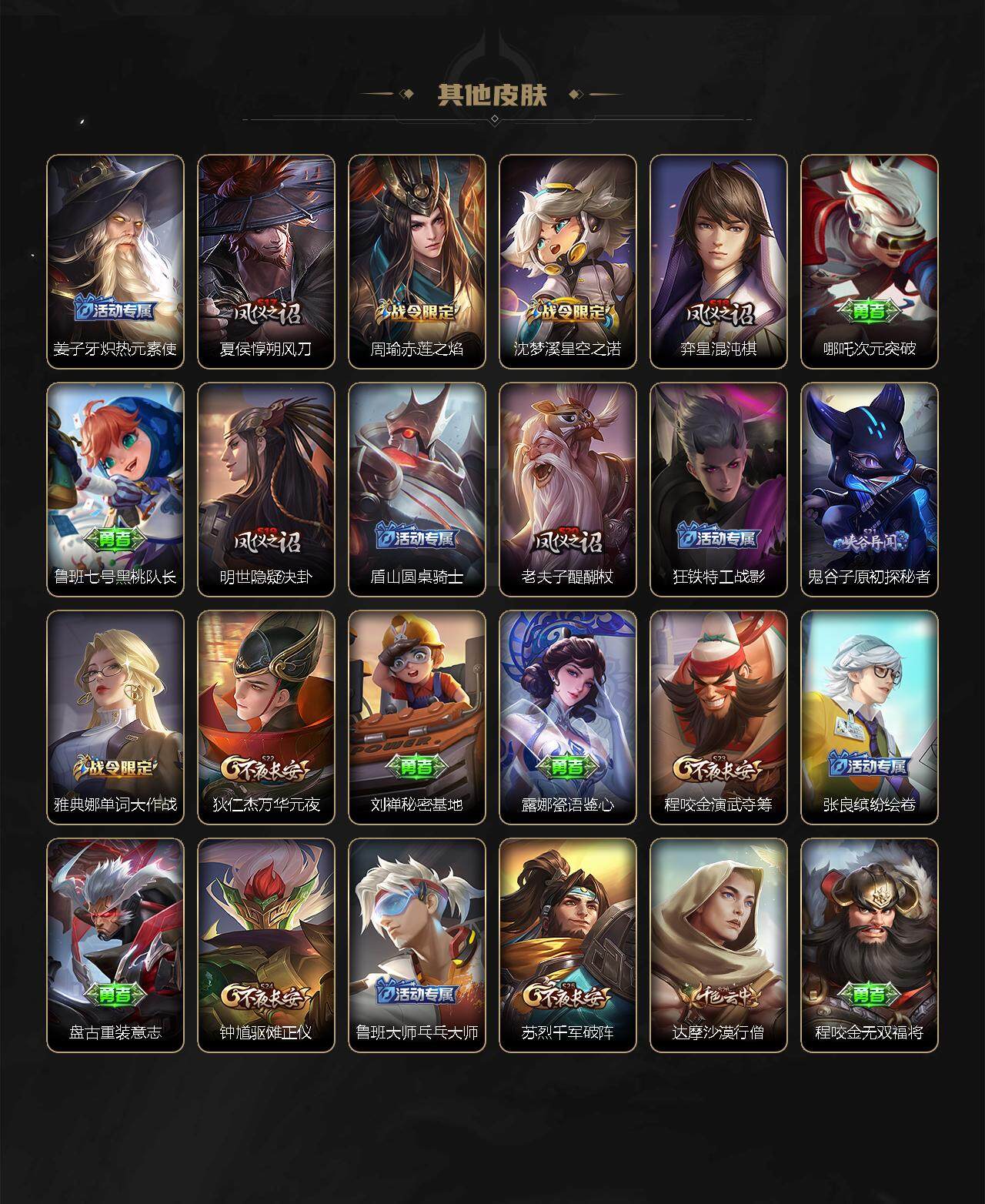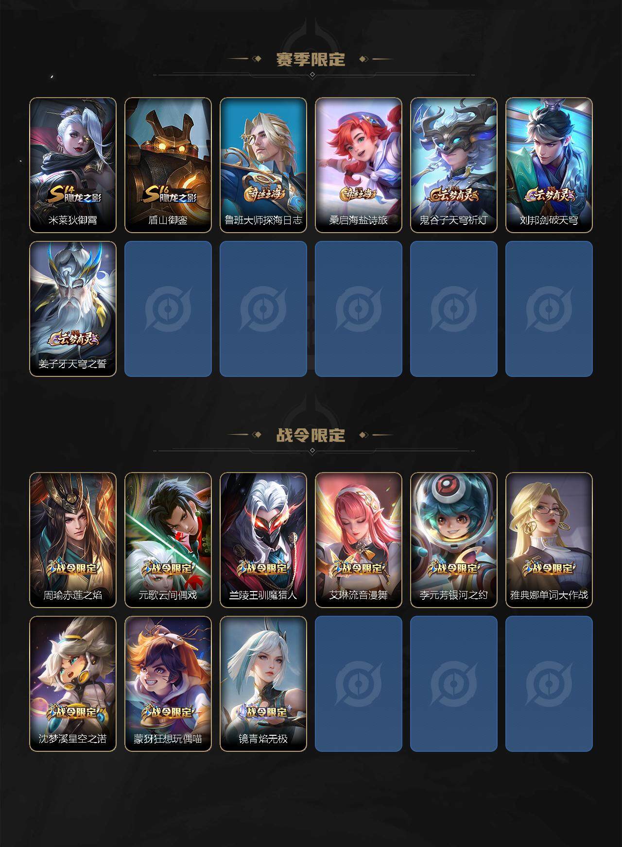 【赛季限定】:白起狰,芈月重明,夏侯惇朔风刀,曹操烛龙,典韦穷奇,狄仁杰万华元夜,达摩沙漠行僧,老夫子醍醐杖,程咬金演武夺筹,兰陵王金庭之子,张良古海寻踪,牛魔御旌,李元芳云中旅人,虞姬凯尔特女王,钟馗驱傩正仪,雅典娜黎明之约,太乙真人饕餮,鬼谷子原初探秘者,苏烈千军破阵,百里玄策原初追逐者,弈星混沌棋,梦奇顽趣,沈梦溪大漠名商,明世隐疑决卦,狂铁御狮,米莱狄御霄,盾山御銮,鲁班大师探海日志,桑启海盐诗旅,鬼谷子天穹祈灯,刘邦剑破天穹,姜子牙天穹之誓