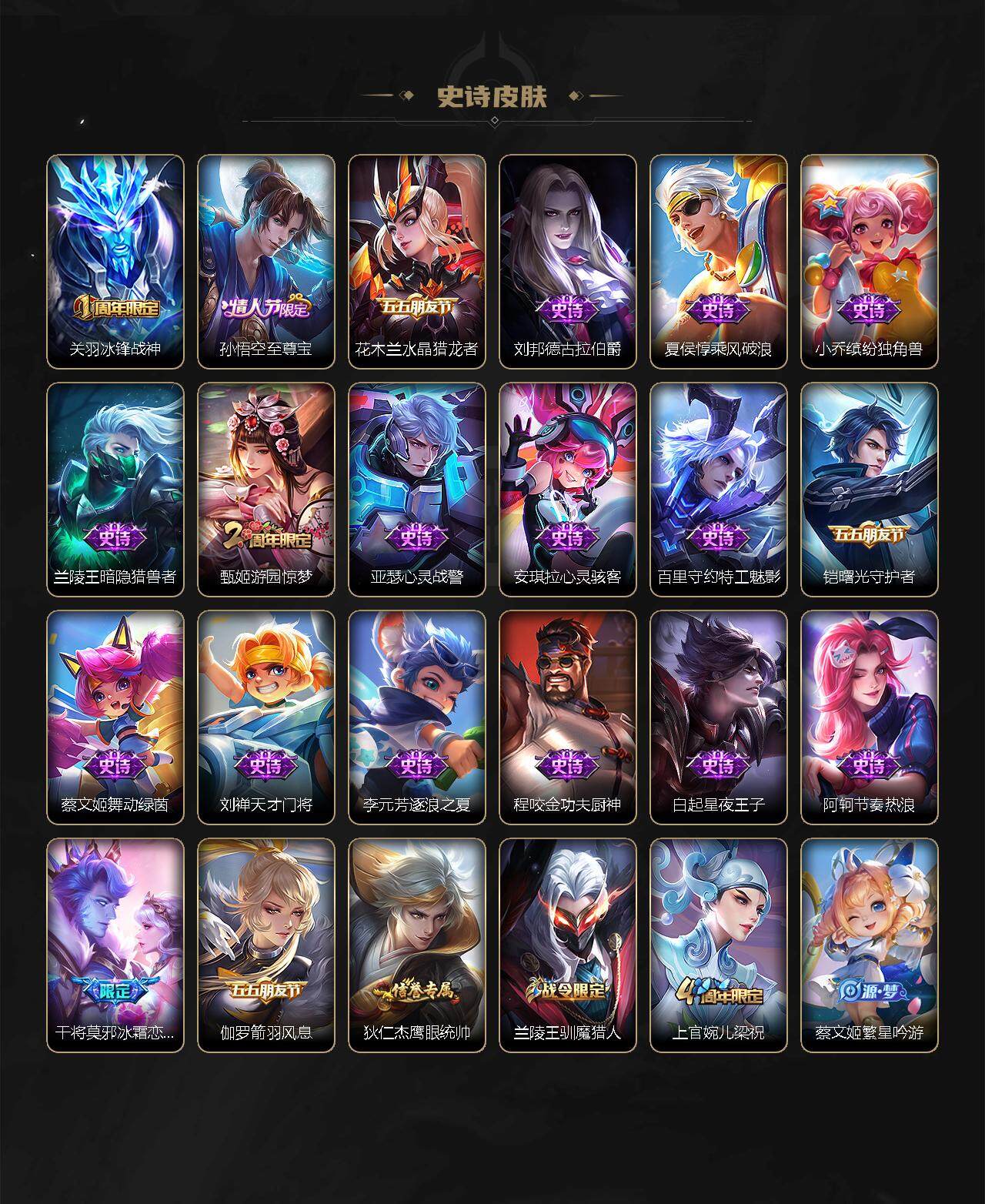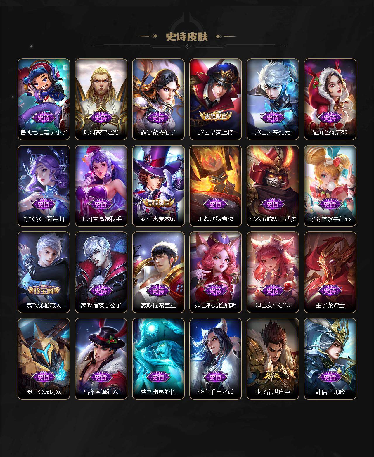 【史诗皮肤】:鲁班七号电玩小子,项羽苍穹之光,露娜紫霞仙子,赵云皇家上将,赵云未来纪元,貂蝉圣诞恋歌,甄姬冰雪圆舞曲,王昭君偶像歌手,狄仁杰魔术师,廉颇地狱岩魂,宫本武藏鬼剑武藏,孙尚香水果甜心,嬴政