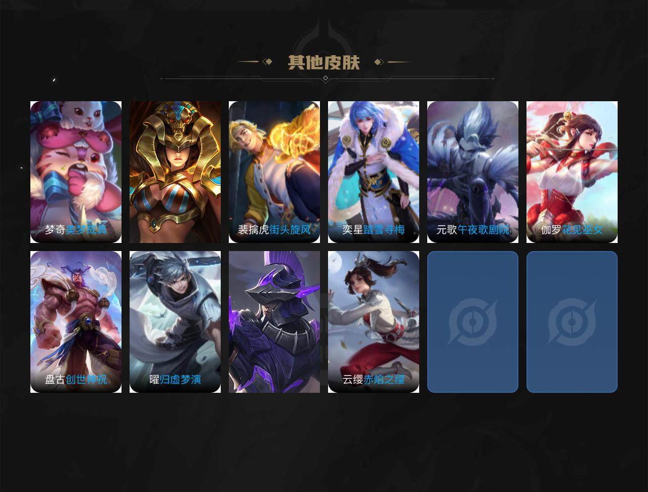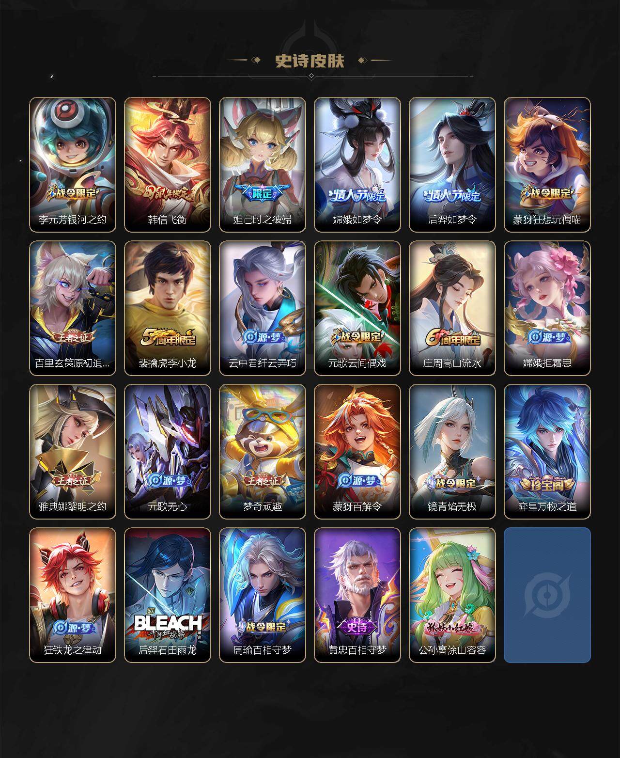 虞姬凯尔特女王,白起狰,太乙真人饕餮,曹操烛龙,芈月重明,典韦穷奇,狂铁御狮,米莱狄御霄,牛魔御旌,盾山御銮,夏侯惇朔风刀,明世隐疑决卦,老夫子醍醐杖,鬼谷子原初探秘者,狄仁杰万华元夜,程咬金演武夺筹,钟馗驱傩正仪,苏烈千军破阵,沈梦溪星空之诺,李元芳银河之约,蒙犽狂想玩偶喵,元歌云间偶戏,弈星混沌棋,达摩沙漠行僧,兰陵王金庭之子,沈梦溪大漠名商,李元芳云中旅人,桑启海盐诗旅,鲁班大师探海日志,张良古海寻踪,镜青焰无极
