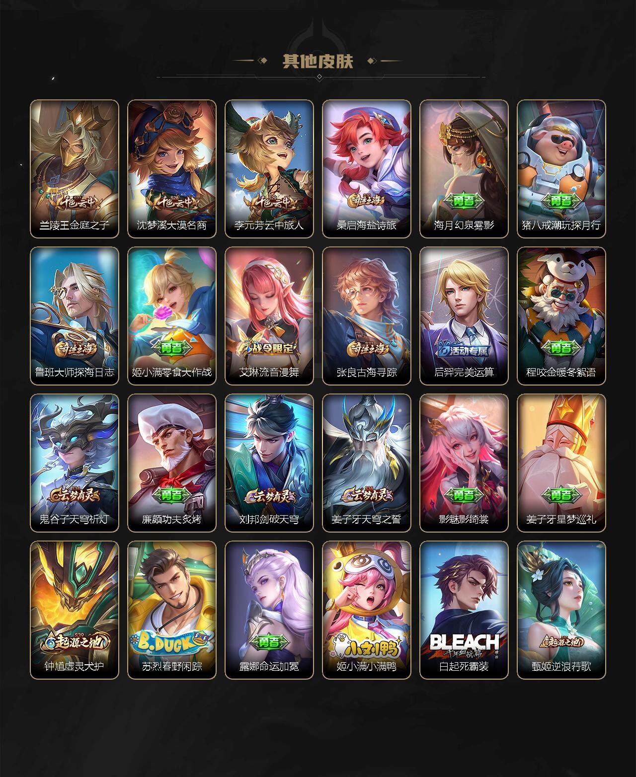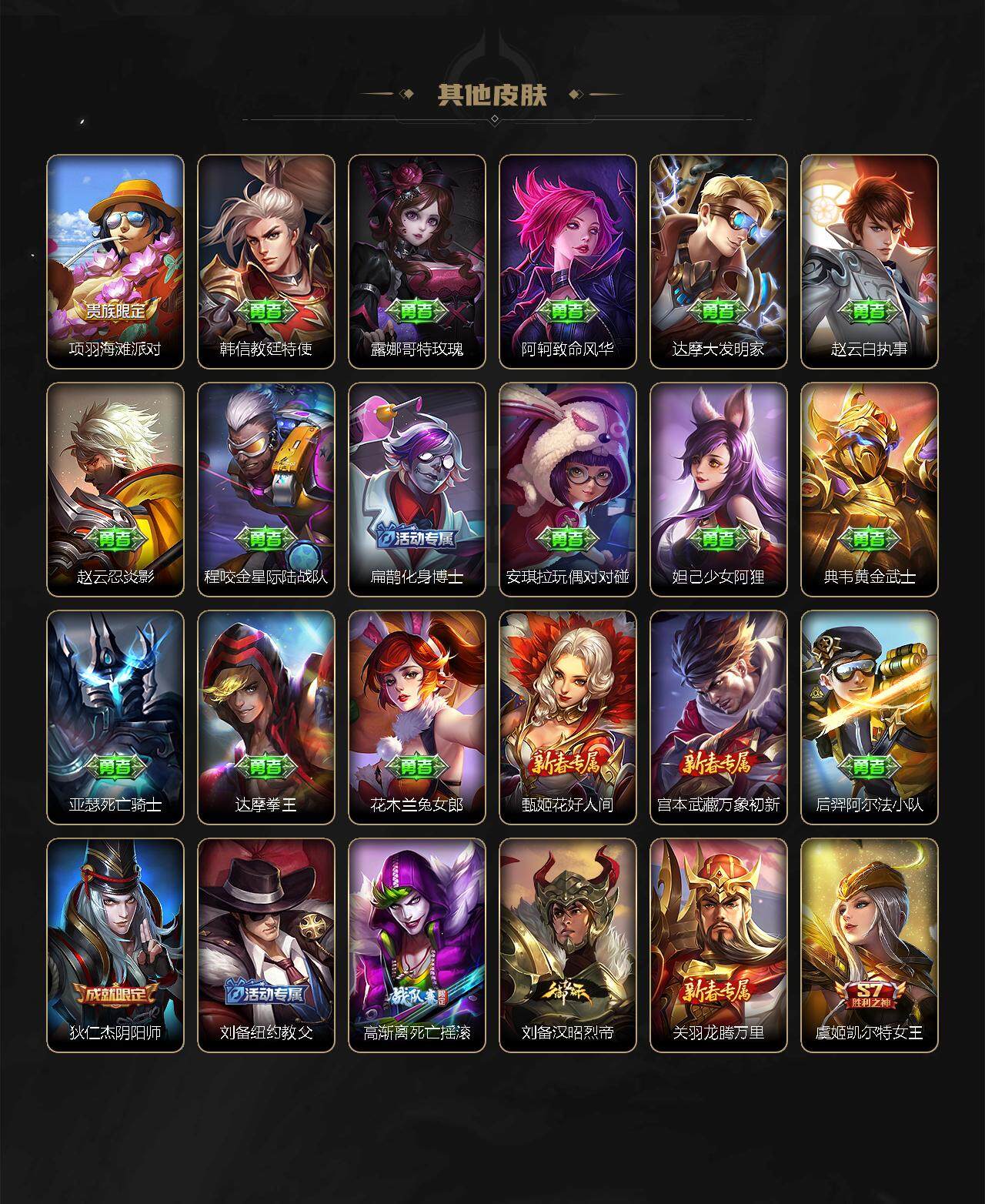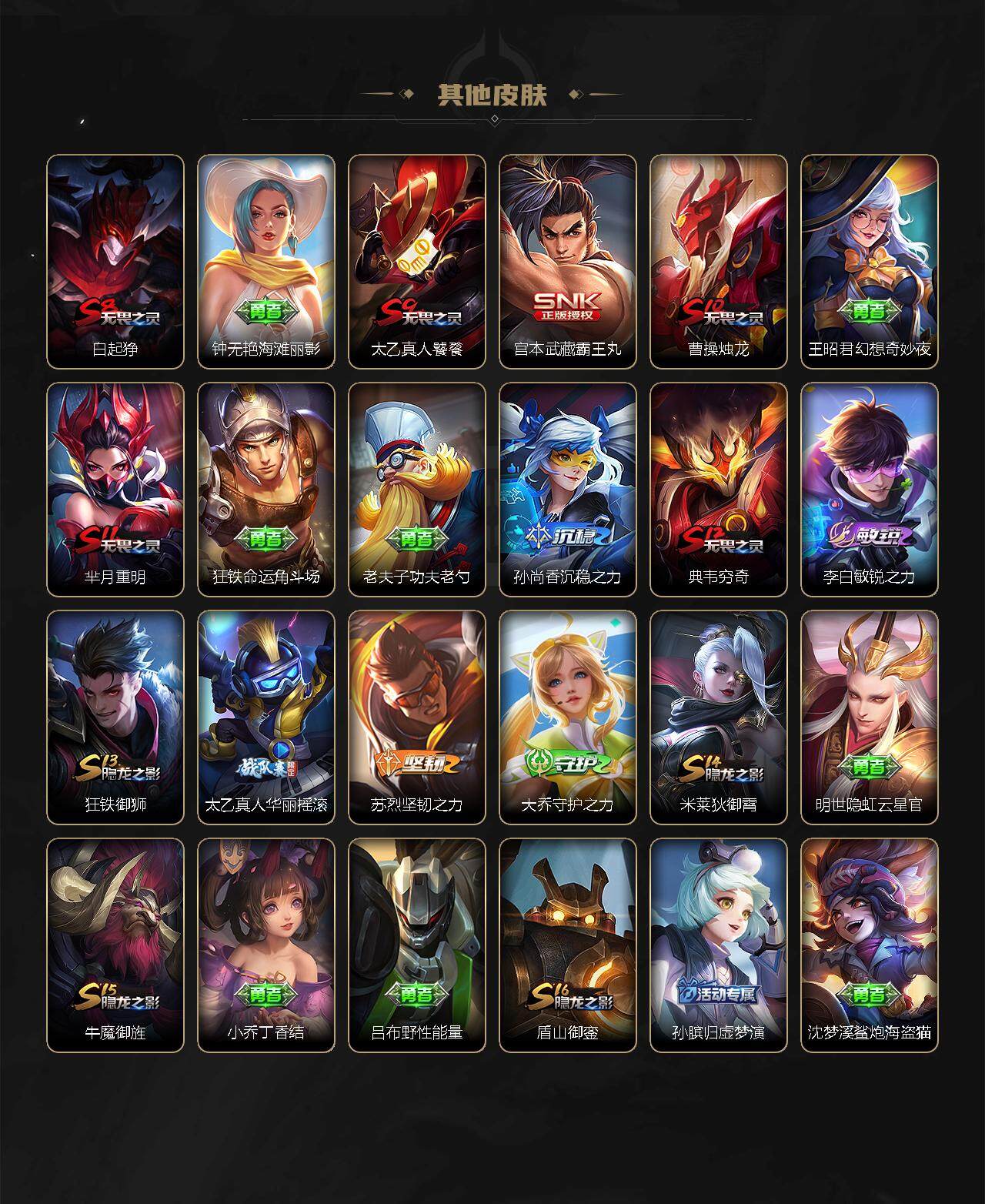 伽罗箭羽风息,李元芳逐浪之夏,阿轲节奏热浪,露娜紫霞仙子,王昭君偶像歌手,韩信白龙吟,项羽苍穹之光,鲁班七号电玩小子,墨子龙骑士,嬴政摇滚巨星,刘禅天才门将,白起星夜王子,安琪拉心灵骇客,程咬金功夫厨神,刘邦德古拉伯爵,兰陵王暗隐猎兽者,曹操幽灵船长,宫本武藏鬼剑武藏,亚瑟心灵战警,蔡文姬舞动绿茵,廉颇地狱岩魂,小乔缤纷独角兽,夏侯惇乘风破浪,花木兰水晶猎龙者,铠曙光守护者,墨子金属风暴,百里玄策原初追逐者,吕布圣诞狂欢,貂蝉圣诞恋歌,百里守约特工魅影,嬴政暗夜贵公子,嫦娥拒霜思,雅典娜黎明之约,李白千年之狐,蒙犽百解令