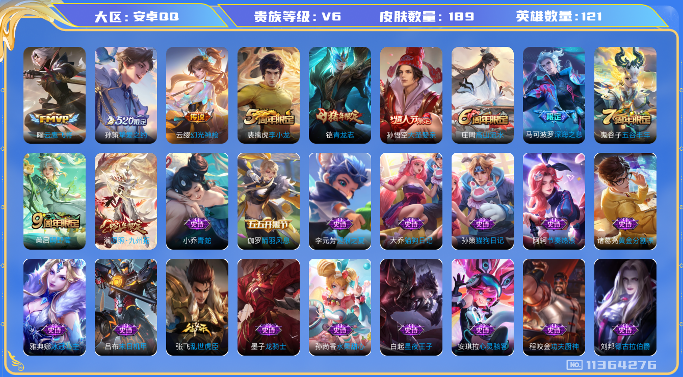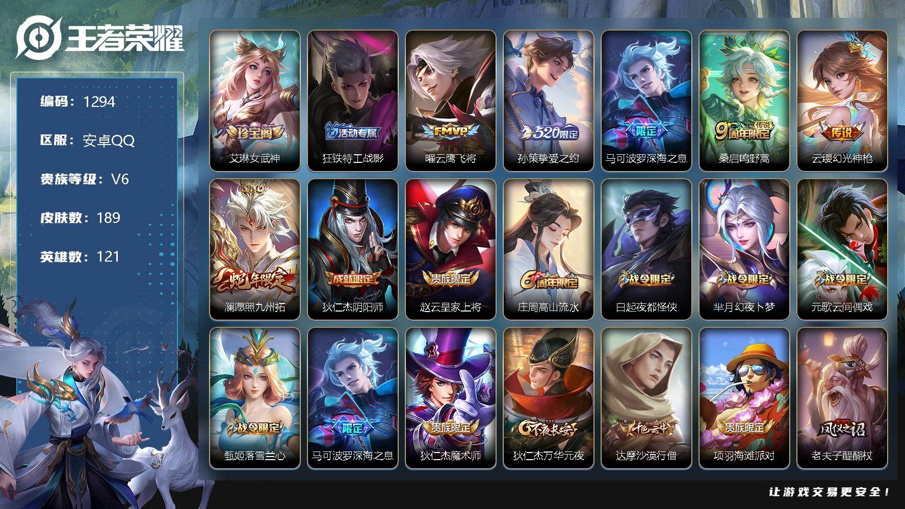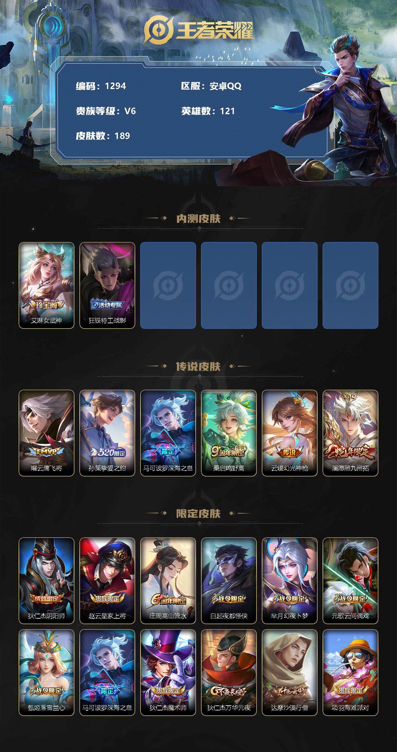 [11364276]【商品标题】:安卓Q-V1-荣耀黄金I段位-121英雄-189皮肤-0典藏-0珍品无双-0无双-0珍品传说-6传说-54史诗