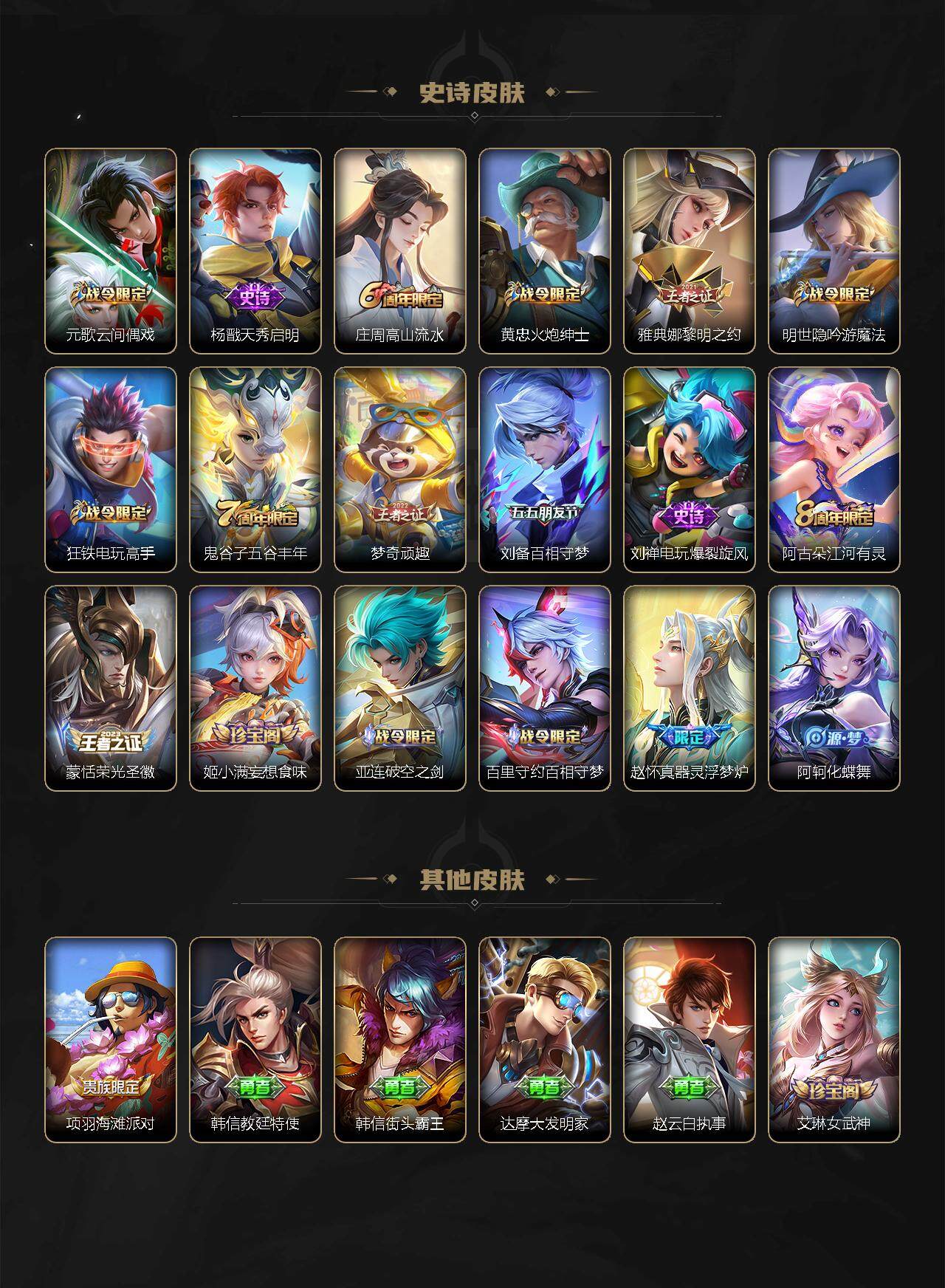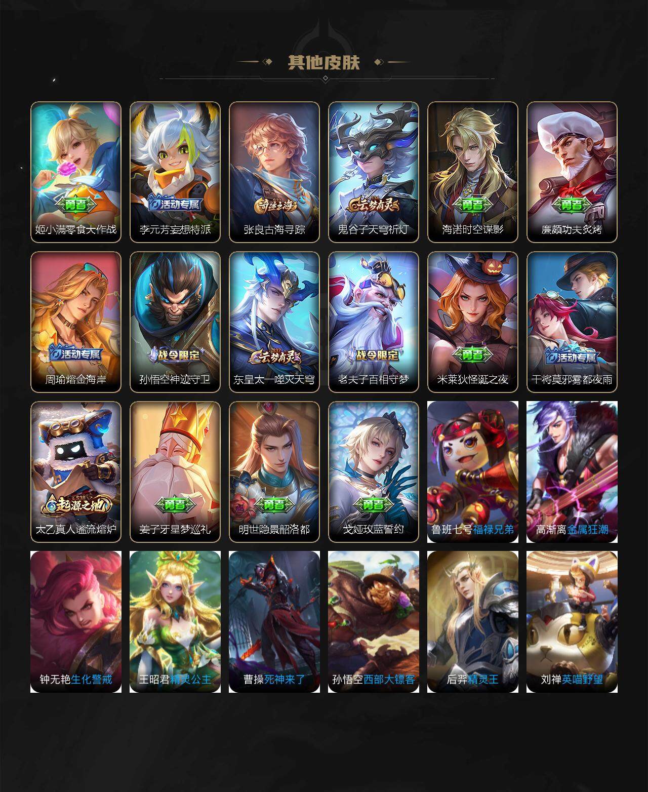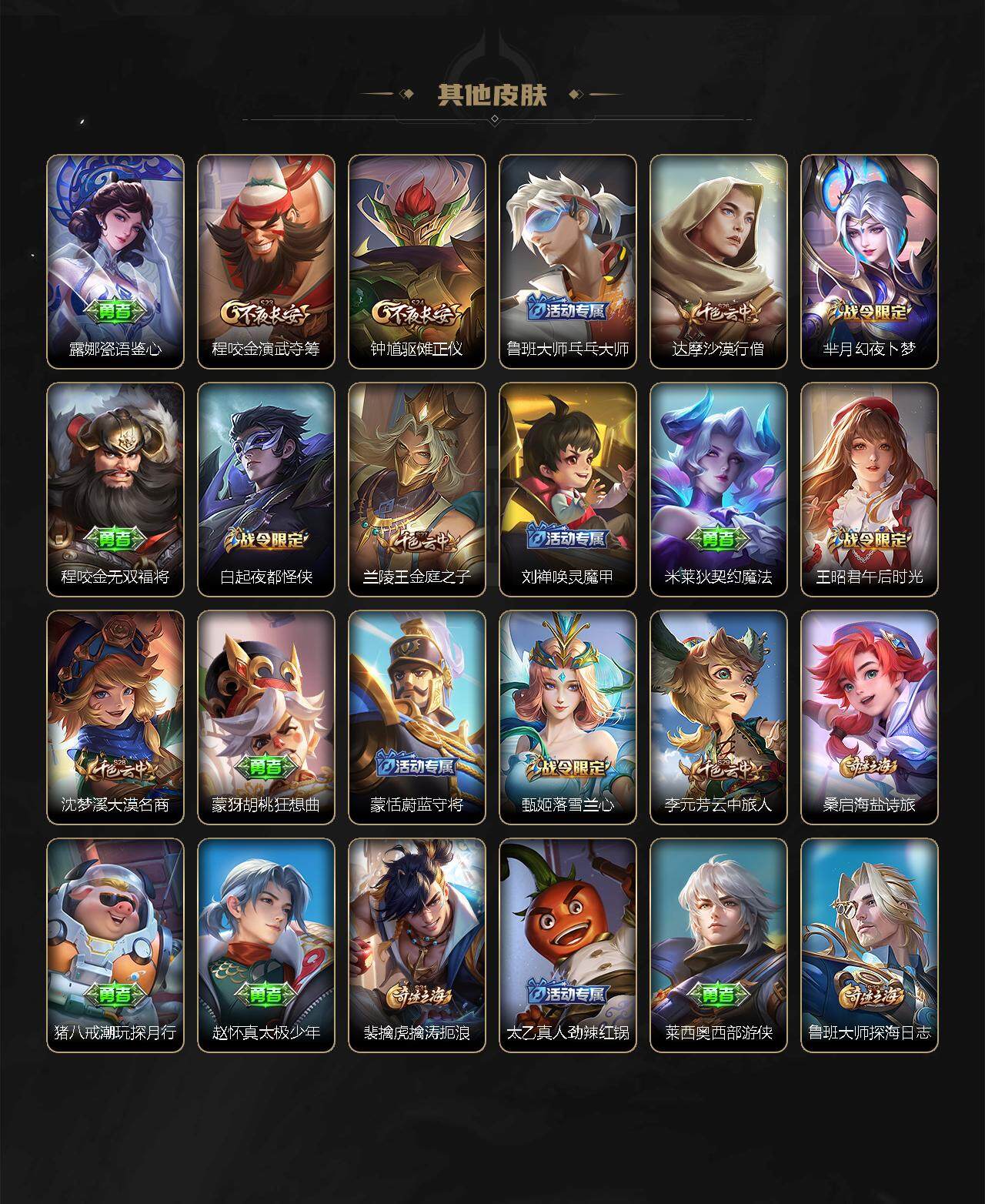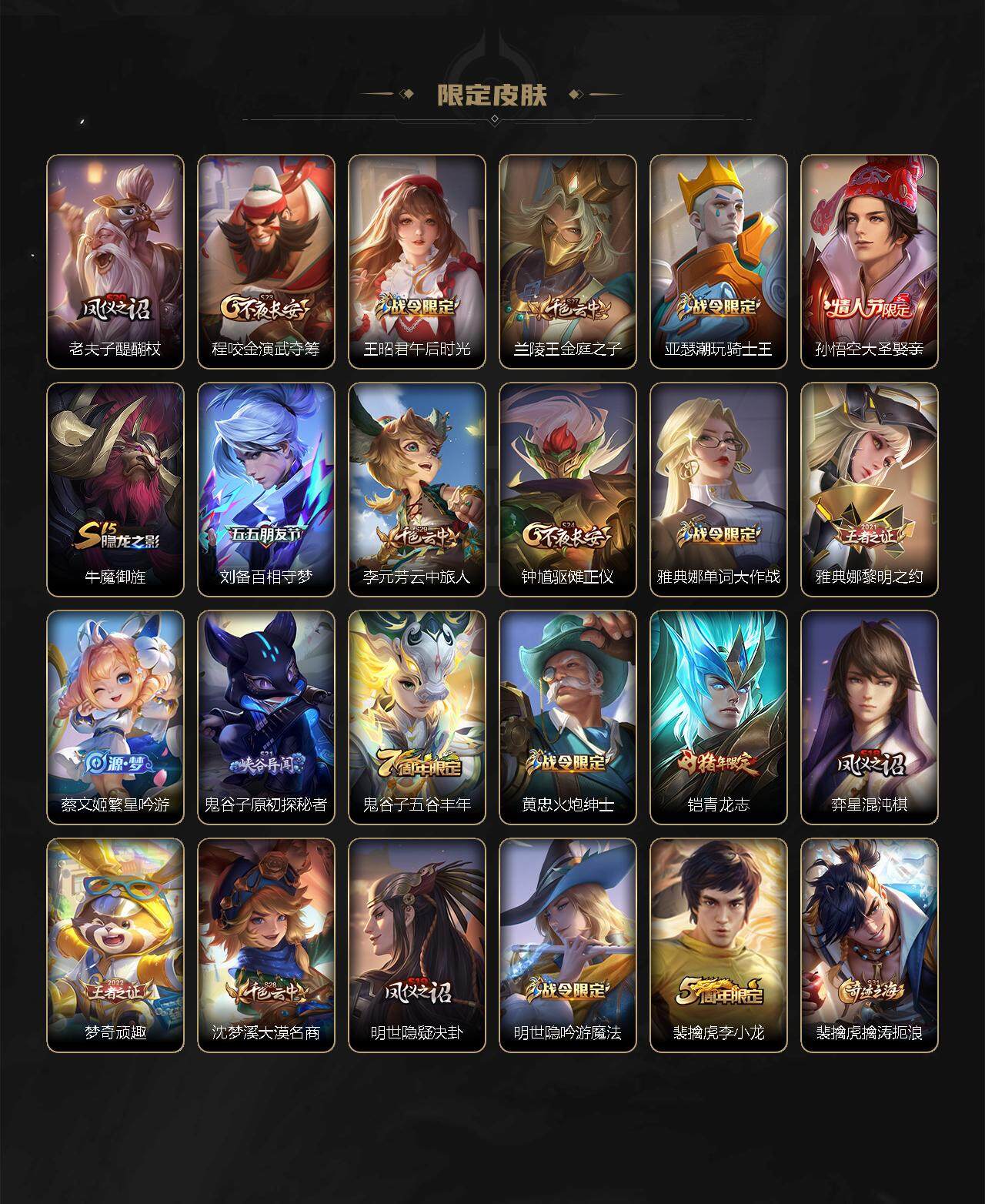 【限定皮肤】:狄仁杰阴阳师,赵云皇家上将,庄周高山流水,白起夜都怪侠,芈月幻夜卜梦,元歌云间偶戏,甄姬落雪兰心,马可波罗深海之息,狄仁杰魔术师,狄仁杰万华元夜,达摩沙漠行僧,项羽海滩派对,老夫子醍醐杖,程咬金演武夺筹,王昭君午后时光,兰陵王金庭之子,亚瑟潮玩骑士王,孙悟空大圣娶亲,牛魔御旌,刘备百相守梦,李元芳云中旅人,钟馗驱傩正仪,雅典娜单词大作战,雅典娜黎明之约,蔡文姬繁星吟游,鬼谷子原初探秘者,鬼谷子五谷丰年,黄忠火炮绅士,铠青龙志,弈星混沌棋,梦奇顽趣,沈梦溪大漠名商,明世隐疑决卦,明世隐吟游魔法,裴擒虎李小龙,裴擒虎擒涛扼浪,狂铁电玩高手,米莱狄御霄,盾山御銮,孙策挚爱之约,猪八戒西部大镖客,蒙犽狂想玩偶喵,鲁班大师探海日志,桑启海盐诗旅,艾琳女武神,阿古朵江河有灵,张良古海寻踪,蒙恬荣光圣徽,鬼谷子天穹祈灯,姬小满妄想食味,周瑜熔金海岸