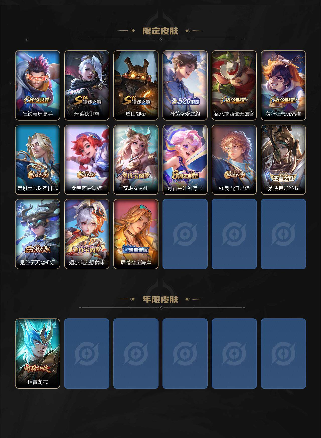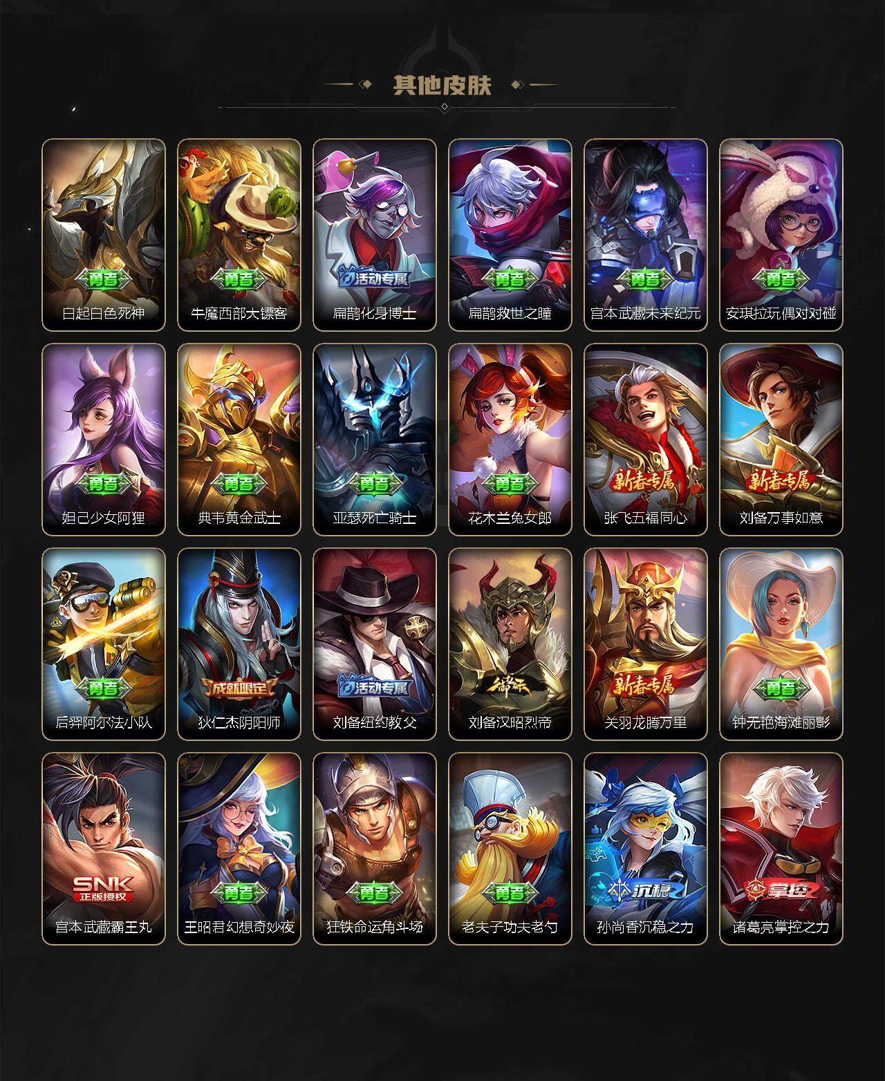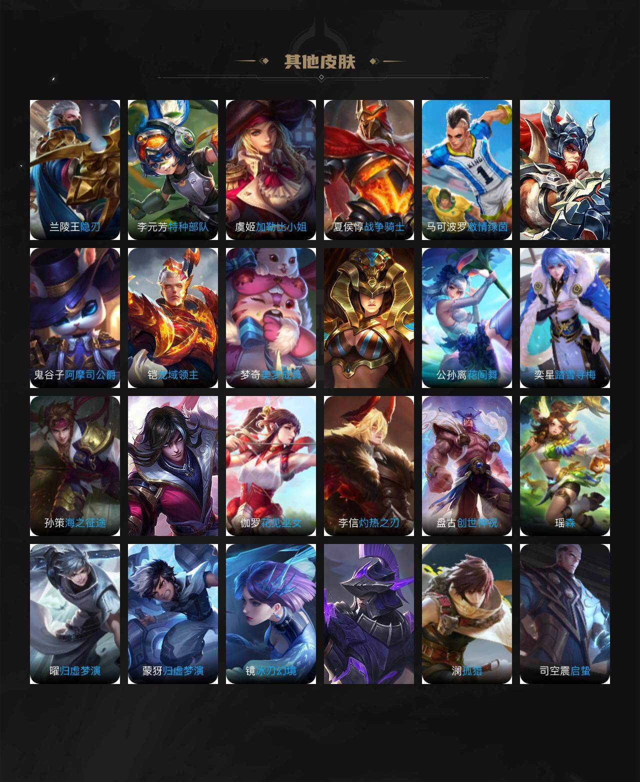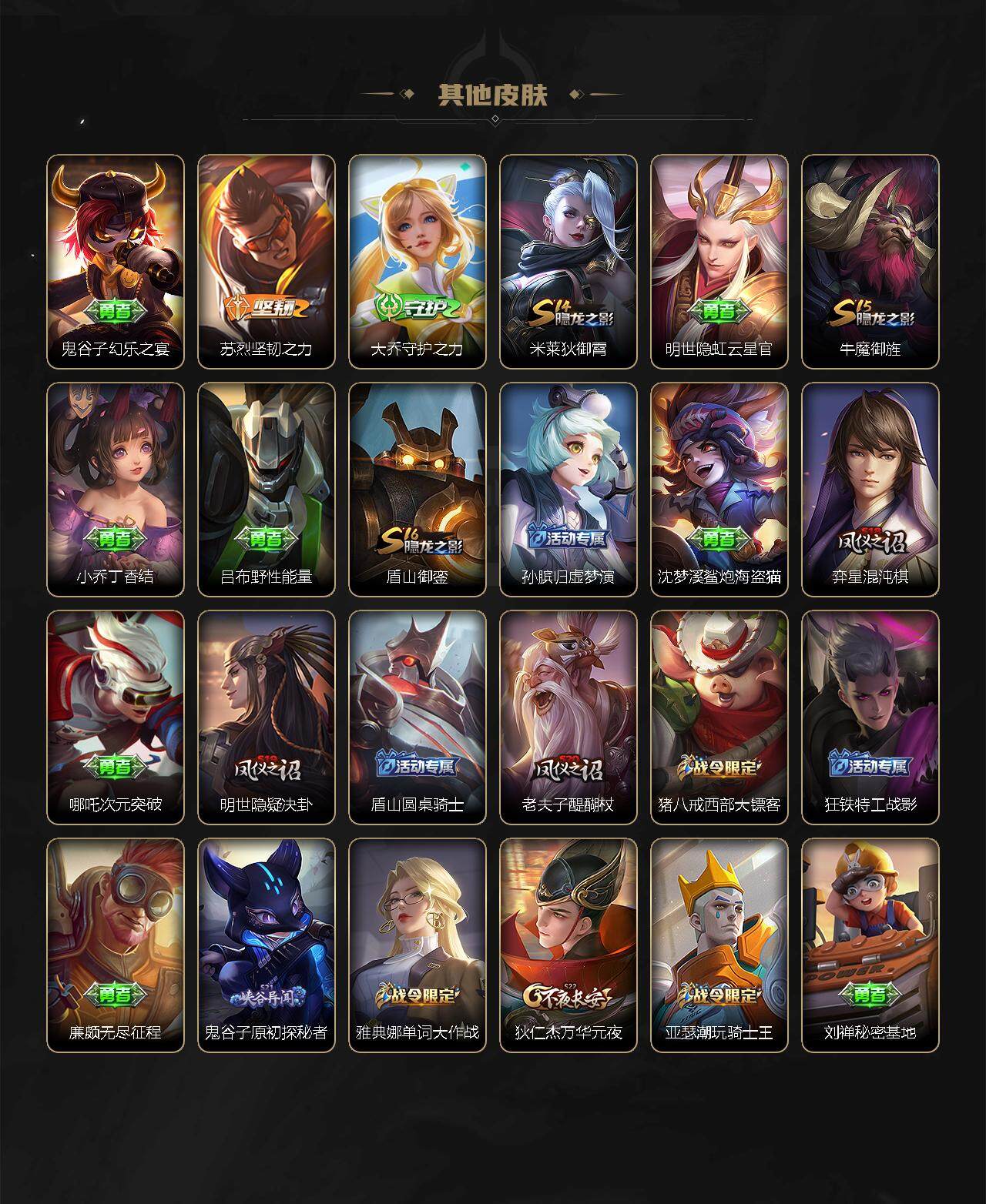 【限定皮肤】:狄仁杰阴阳师,赵云皇家上将,庄周高山流水,白起夜都怪侠,芈月幻夜卜梦,元歌云间偶戏,甄姬落雪兰心,马可波罗深海之息,狄仁杰魔术师,狄仁杰万华元夜,达摩沙漠行僧,项羽海滩派对,老夫子醍醐杖,程咬金演武夺筹,王昭君午后时光,兰陵王金庭之子,亚瑟潮玩骑士王,孙悟空大圣娶亲,牛魔御旌,刘备百相守梦,李元芳云中旅人,钟馗驱傩正仪,雅典娜单词大作战,雅典娜黎明之约,蔡文姬繁星吟游,鬼谷子原初探秘者,鬼谷子五谷丰年,黄忠火炮绅士,铠青龙志,弈星混沌棋,梦奇顽趣,沈梦溪大漠名商,明世隐疑决卦,明世隐吟游魔法,裴擒虎李小龙,裴擒虎擒涛扼浪,狂铁电玩高手,米莱狄御霄,盾山御銮,孙策挚爱之约,猪八戒西部大镖客,蒙犽狂想玩偶喵,鲁班大师探海日志,桑启海盐诗旅,艾琳女武神,阿古朵江河有灵,张良古海寻踪,蒙恬荣光圣徽,鬼谷子天穹祈灯,姬小满妄想食味,周瑜熔金海岸