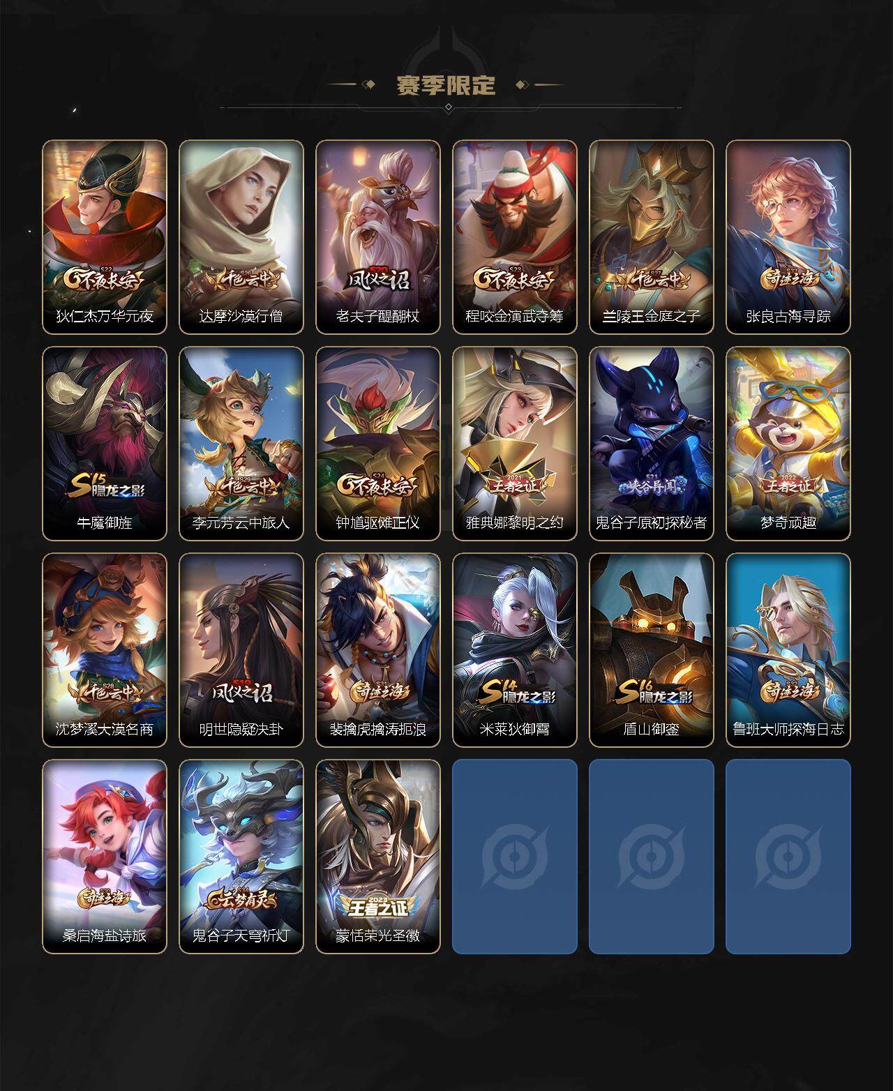 【赛季限定】:狄仁杰万华元夜,达摩沙漠行僧,老夫子醍醐杖,程咬金演武夺筹,兰陵王金庭之子,张良古海寻踪,牛魔御旌,李元芳云中旅人,钟馗驱傩正仪,雅典娜黎明之约,鬼谷子原初探秘者,弈星混沌棋,梦奇顽趣,沈梦溪大漠名商,明世隐疑决卦,裴擒虎擒涛扼浪,米莱狄御霄,盾山御銮,鲁班大师探海日志,桑启海盐诗旅,鬼谷子天穹祈灯,蒙恬荣光圣徽