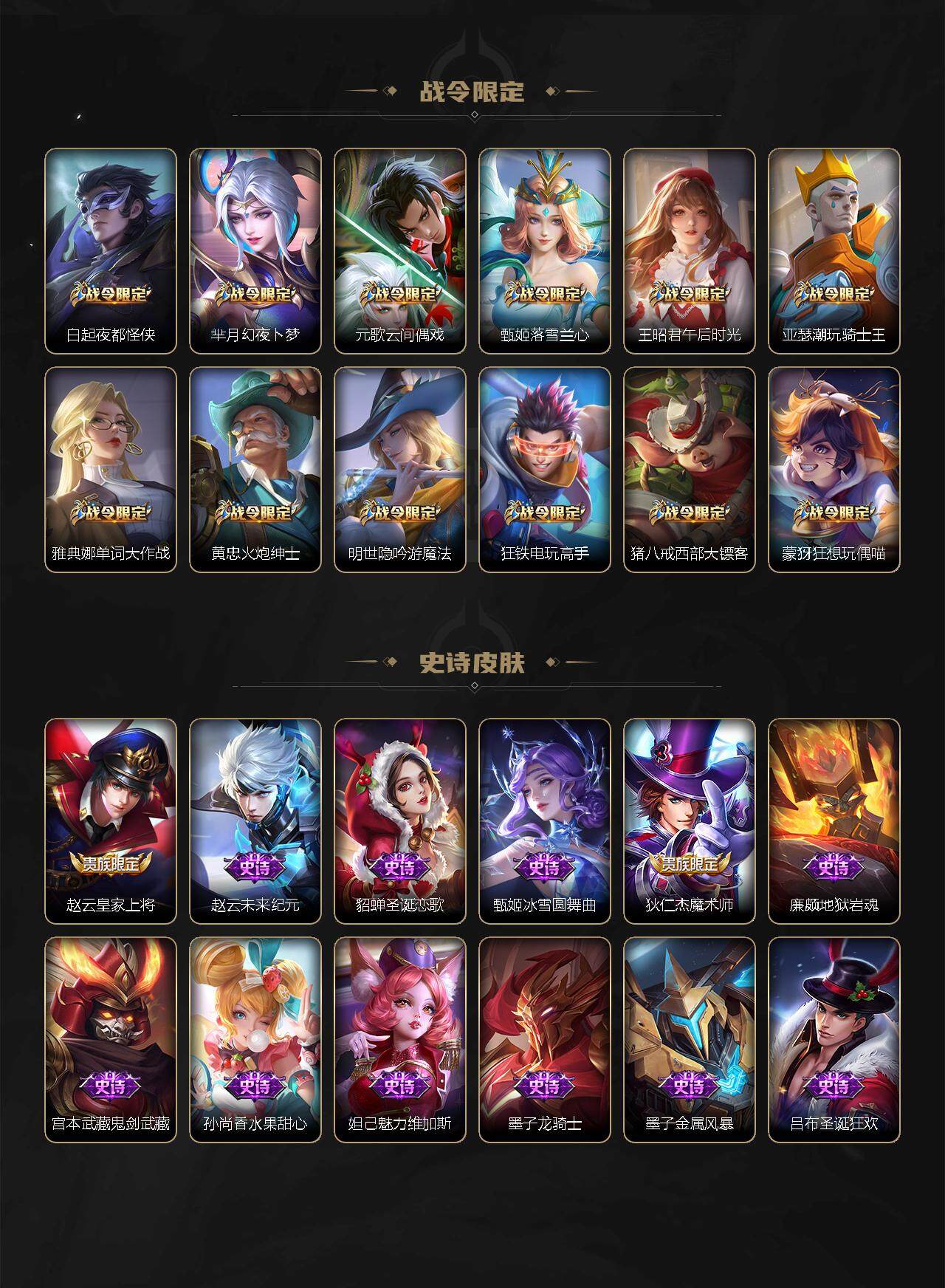 【战令限定】:白起夜都怪侠,芈月幻夜卜梦,元歌云间偶戏,甄姬落雪兰心,王昭君午后时光,亚瑟潮玩骑士王,雅典娜单词大作战,黄忠火炮绅士,明世隐吟游魔法,狂铁电玩高手,猪八戒西部大镖客,蒙犽狂想玩偶喵