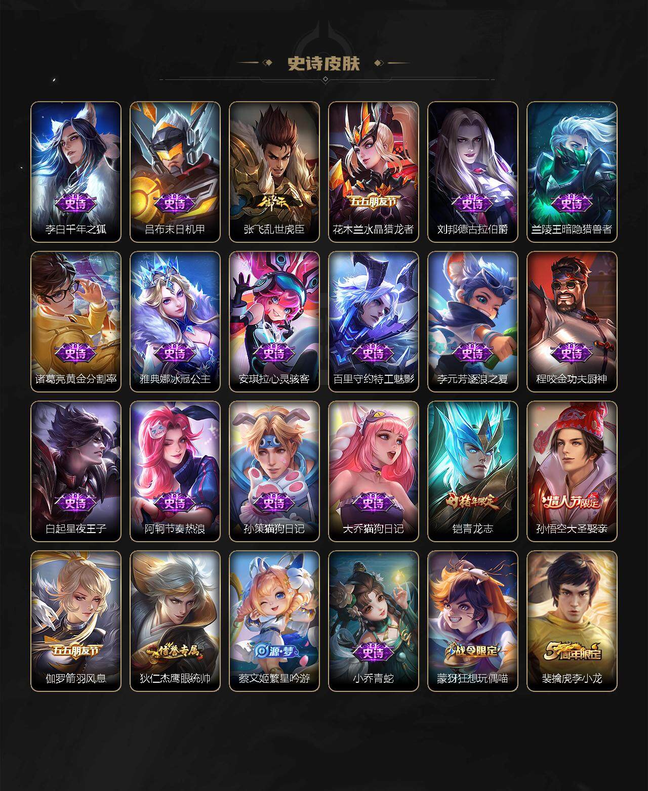 【史诗皮肤】:赵云皇家上将,赵云未来纪元,貂蝉圣诞恋歌,甄姬冰雪圆舞曲,狄仁杰魔术师,廉颇地狱岩魂,宫本武藏鬼剑武藏,孙尚香水果甜心,妲己魅力维加斯,墨子龙骑士,墨子金属风暴,吕布圣诞狂欢,李白千年之狐,吕布末日机甲,张飞乱世虎臣,花木兰水晶猎龙者,刘邦德古拉伯爵,兰陵王暗隐猎兽者,诸葛亮黄金分割率,雅典娜冰冠公主,安琪拉心灵骇客,百里守约特工魅影,李元芳逐浪之夏,程咬金功夫厨神,白起星夜王子,阿轲节奏热浪,孙策猫狗日记,大乔猫狗日记,铠青龙志,孙悟空大圣娶