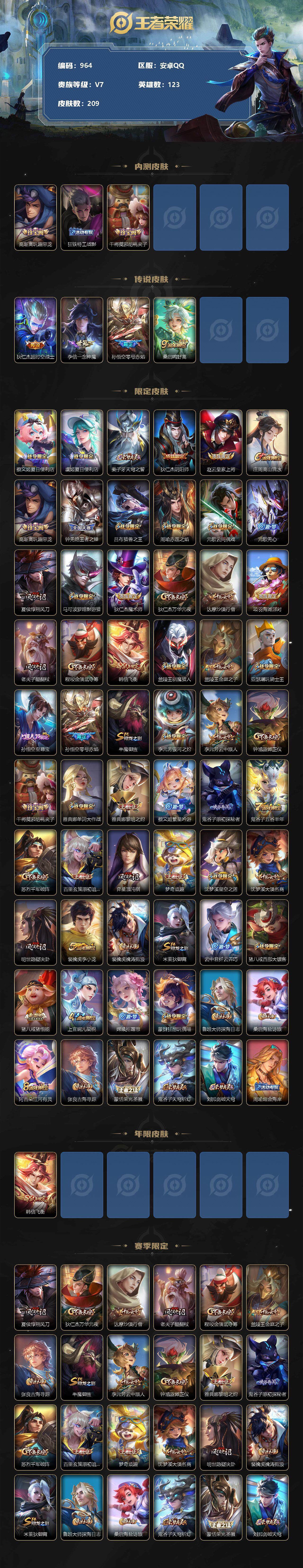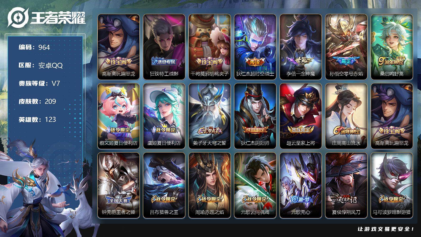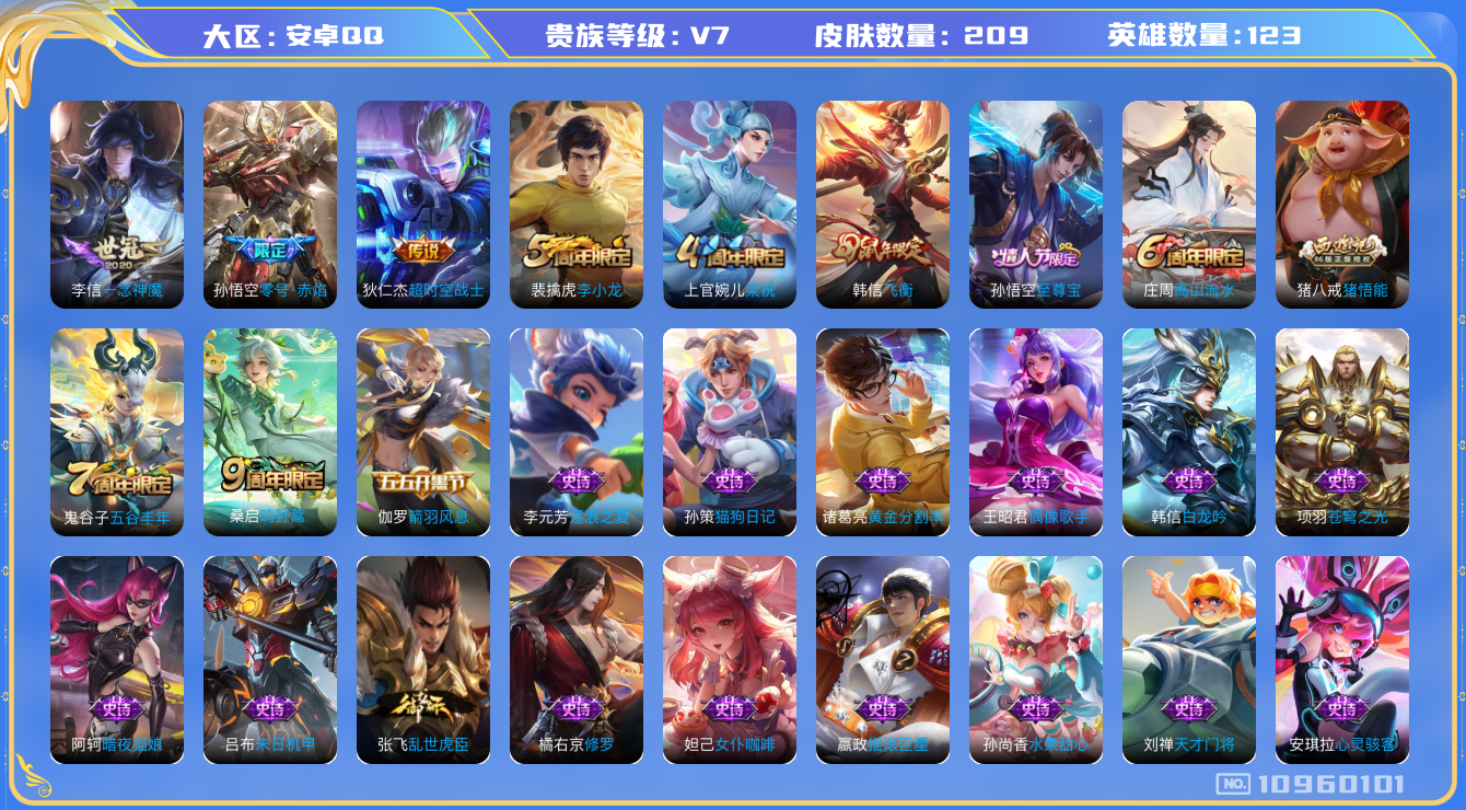 [10960101]【商品标题】:安卓Q-V6-至尊星耀I段位-123英雄-209皮肤-0典藏-0珍品无双-0无双-0珍品传说-4传说-62史诗