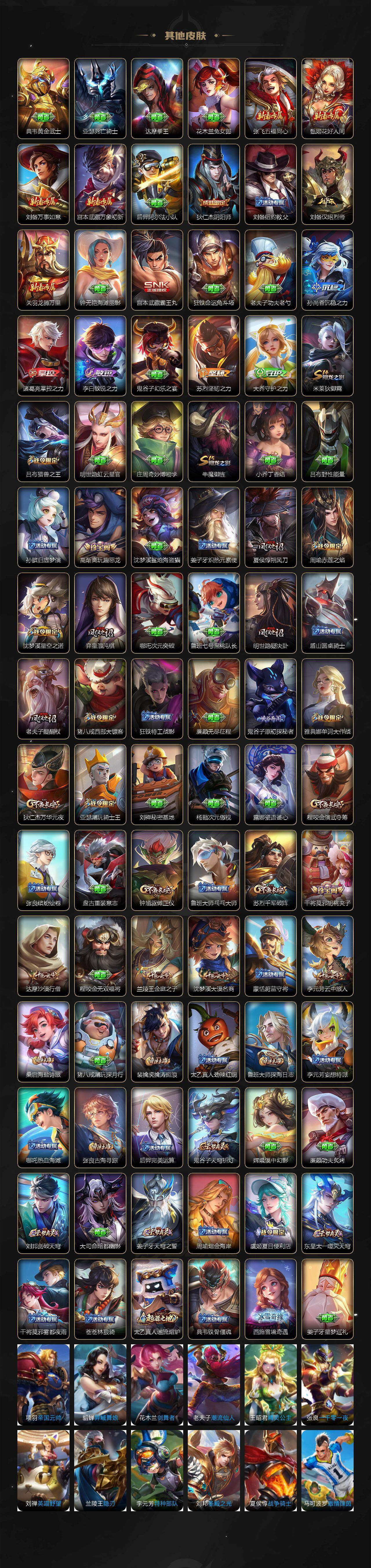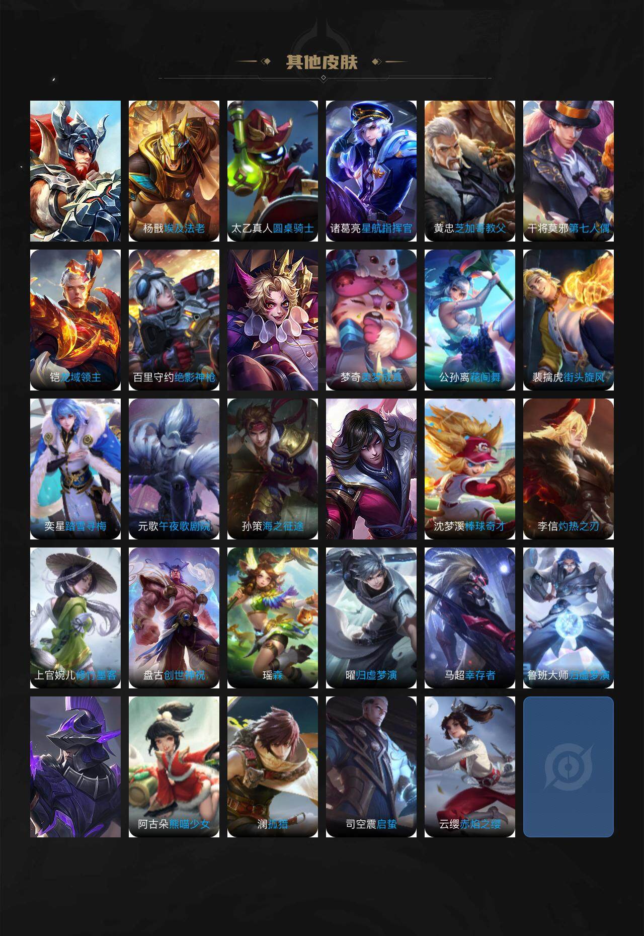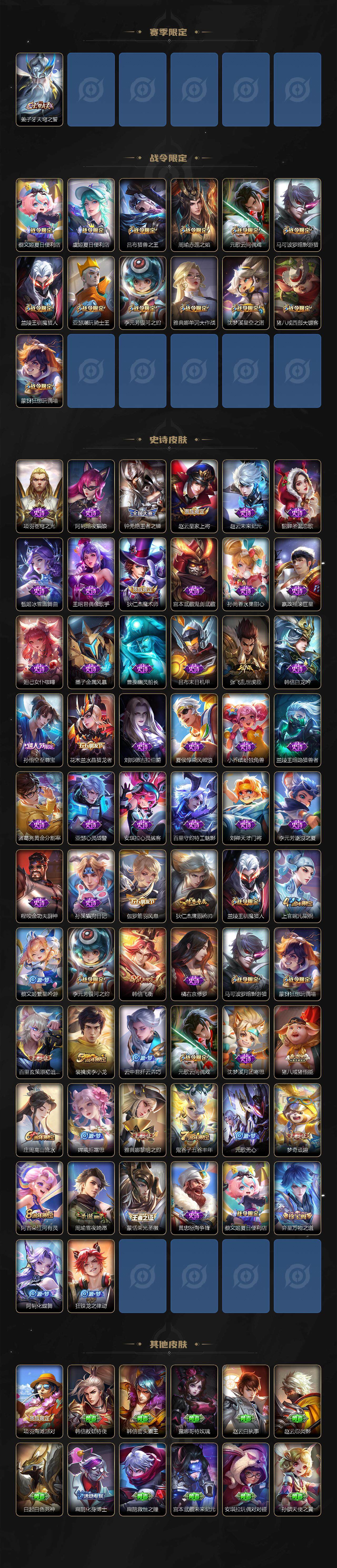 【限定皮肤】:蔡文姬夏日便利店,虞姬夏日便利店,姜子牙天穹之誓,狄仁杰阴阳师,赵云皇家上将,庄周高山流水,高渐离玩趣恶龙,钟无艳王者之锤,吕布猎兽之王,周瑜赤莲之焰,元歌云间偶戏,元歌无心,夏侯惇朔风刀,马可波罗暗影游猎,狄仁杰魔术师,狄仁杰万华元夜,达摩沙漠行僧,项羽海滩派对,老夫子醍醐杖,程咬金演武夺筹,韩信飞衡,兰陵王驯魔猎人,兰陵王金庭之子,亚瑟潮玩骑士王,孙悟空至尊宝,孙悟空零号赤焰,牛魔御旌,李元芳银河之约,李元芳云中旅人,钟馗驱傩正仪,干将莫邪胡桃夹子,雅典娜单词大作战,雅典娜黎明之约,蔡文姬繁星吟游,鬼谷子原初探秘者,鬼谷子五谷丰年,苏烈千军破阵,百里玄策原初追逐者,弈星混沌棋,梦奇顽趣,沈梦溪星空之诺,沈梦溪大漠名商,明世隐疑决卦,裴擒虎李小龙,裴擒虎擒涛扼浪,米莱狄御霄,云中君纤云弄巧,猪八戒西部大镖客,猪八戒猪悟能,上官婉儿梁祝,嫦娥拒霜思,蒙犽狂想玩偶喵,鲁班大师探海日志,桑启海盐诗旅,阿古朵江河有灵,张良古海寻踪,蒙恬荣光圣徽,鬼谷子天穹祈灯,刘邦剑破天穹,周瑜熔金海岸