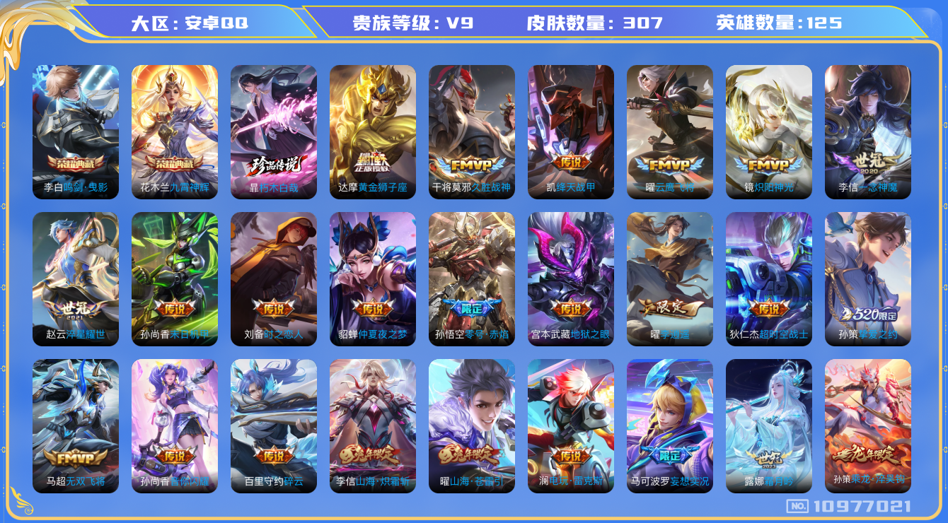 [10977021]【商品标题】:安卓Q-V9-最强王者段位-125英雄-307皮肤-2典藏-0珍品无双-0无双-1珍品传说-32传说-97史诗