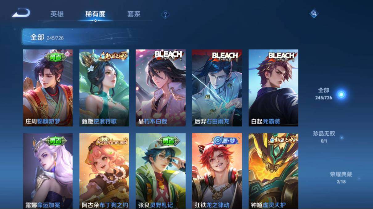 - PX_2106552-Q/荣耀黄金/213皮肤/123英雄/2典藏/0珍品无双/0无双/2珍品传说/16传说/74史诗/7稀有英雄 【2 珍品传说】怪盗基德 马可波罗,江户川柯南 鲁班七号, 【2 典藏皮肤】银白咏叹调 铠,九霄神辉 花木兰, 【16 传说皮肤】武圣 关羽,启明星使 虞姬,齐天大圣 孙悟空,凤求凰 李白,音你心动 周瑜,炽阳神光 镜,遇见神鼓 吕布,时之恋人 刘备,黄金狮子座 达摩