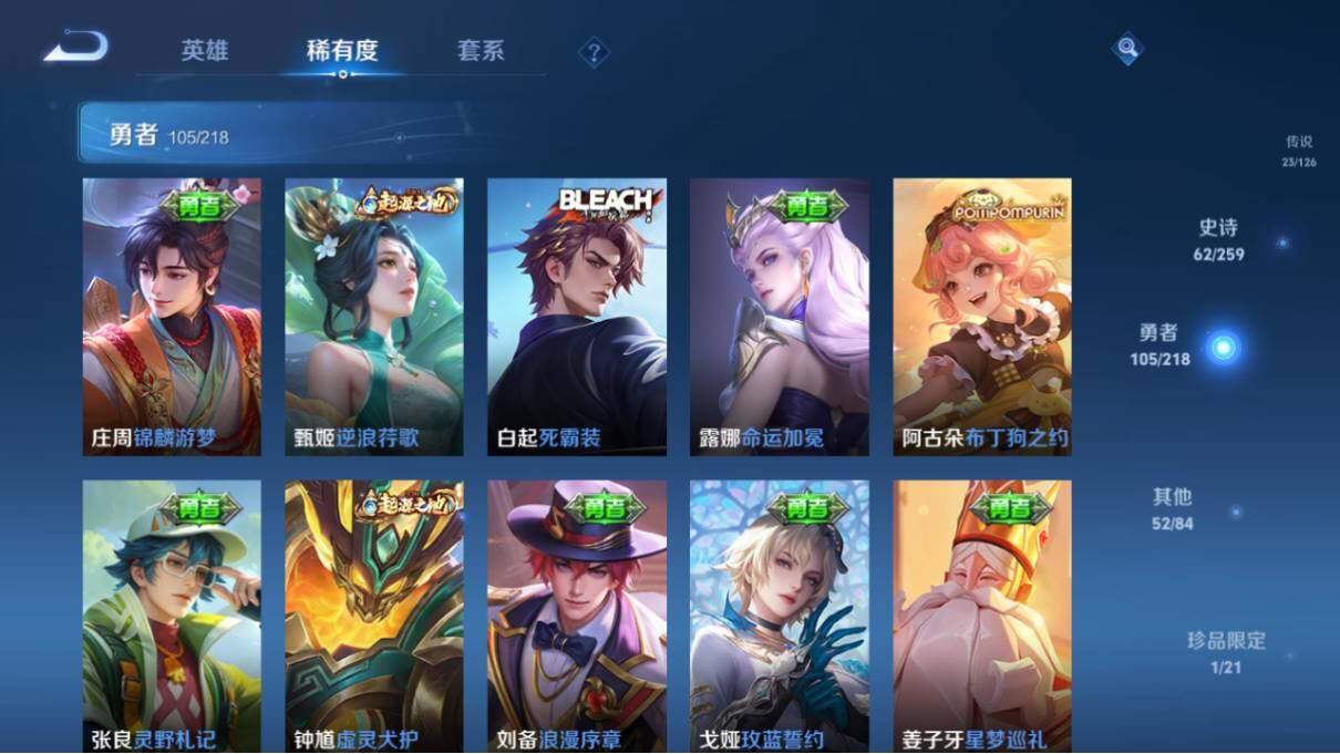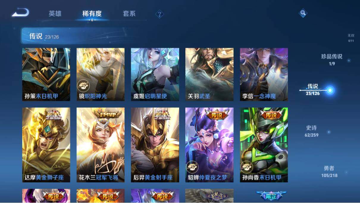[10977181]【商品标题】:安卓Q-V8-至尊星耀I段位-125英雄-245皮肤-2典藏-0珍品无双-0无双-1珍品传说-23传说-62史诗