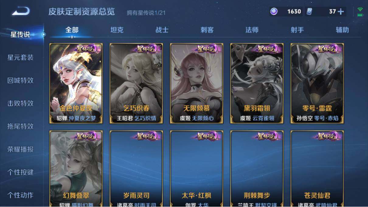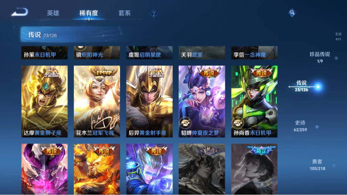 【传说皮肤】:狄仁杰超时空战士,孙悟空地狱火,宫本武藏地狱之眼,孙尚香末日机甲,貂蝉仲夏夜之梦,后羿黄金射手座,花木兰冠军飞将,达摩黄金狮子座,李信一念神魔,关羽武圣,虞姬启明星使,镜炽阳神光,孙策末日机甲,马超无双飞将,李白诗剑行,夏洛特浮生妄,诸葛亮鹤羽星尊,马可波罗妄想实况,孙尚香乘龙问璇玑,貂蝉曦玄引,桑启鸣野蒿,云缨幻光神枪,澜愿照九州拓