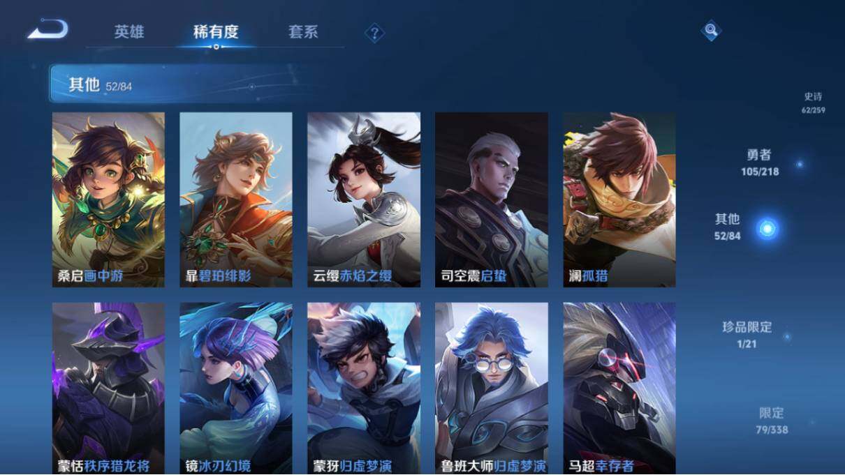 曹操烛龙,芈月重明,典韦穷奇,狂铁御狮,米莱狄御霄,牛魔御旌,盾山御銮,夏侯惇朔风刀,明世隐疑决卦,老夫子醍醐杖,鬼谷子原初探秘者,狄仁杰万华元夜,程咬金演武夺筹,钟馗驱傩正仪,苏烈千军破阵,吕布猎兽之王,女娲朔望之晖,弈星混沌棋,达摩沙漠行僧,兰陵王金庭之子,沈梦溪大漠名商,李元芳云中旅人,桑启海盐诗旅,裴擒虎擒涛扼浪,鲁班大师探海日志,张良古海寻踪