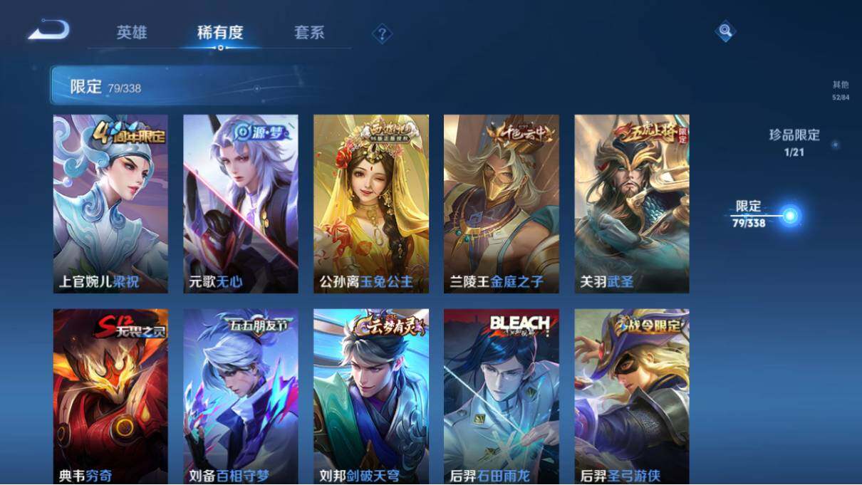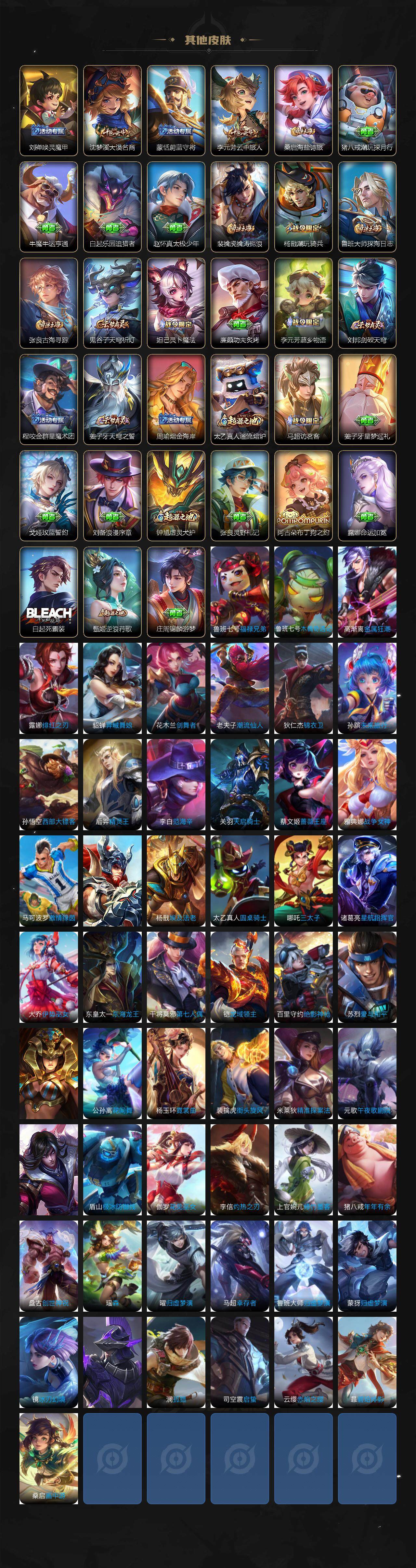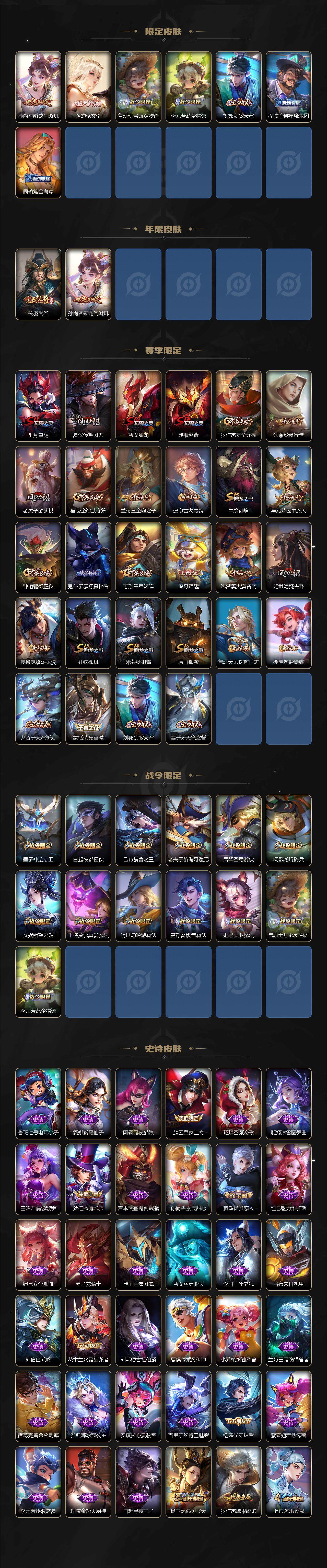 【限定皮肤】:姜子牙天穹之誓,狄仁杰阴阳师,赵云皇家上将,墨子神迹守卫,嬴政优雅恋人,庄周高山流水,高渐离玩趣恶龙,白起夜都怪侠,芈月重明,吕布猎兽之王,元歌无心,夏侯惇朔风刀,曹操烛龙,典韦穷奇,马可波罗妄想实况,狄仁杰魔术师,狄仁杰万华元夜,达摩沙漠行僧,项羽海滩派对,老夫子醍醐杖,老夫子航海奇遇记,关羽武圣,程咬金演武夺筹,韩信傲雪梅枪,兰陵王金庭之子,牛魔御旌,后羿圣弓游侠,刘备百相守梦,李元芳云中旅人,虞姬启明星使,钟馗驱傩正仪,杨玉环遇见飞天,杨戬潮玩骑兵,女娲朔望之晖,干将莫邪真爱魔法,蔡文姬繁星吟游,鬼谷子原初探秘者,鬼谷子五谷丰年,诸葛亮鹤羽星尊,苏烈千军破阵,弈星混沌棋,梦奇顽趣,公孙离玉兔公主,沈梦溪大漠名商,明世隐疑决卦,明世隐吟游魔法,裴擒虎李小龙,裴擒虎擒涛扼浪,狂铁御狮,米莱狄御霄,盾山御銮,上官婉儿梁祝,鲁班大师探海日志,桑启海盐诗旅,夏洛特浮生妄,张良古海寻踪,蒙恬荣光圣徽,高渐离燃音魔法,妲己灵卜魔法,鬼谷子天穹祈灯,孙尚香乘龙问璇玑,貂蝉曦玄引,鲁班七号蔬乡物语,李元芳蔬乡物语,刘邦剑破天穹,程咬金群星魔术团,周瑜熔金海岸