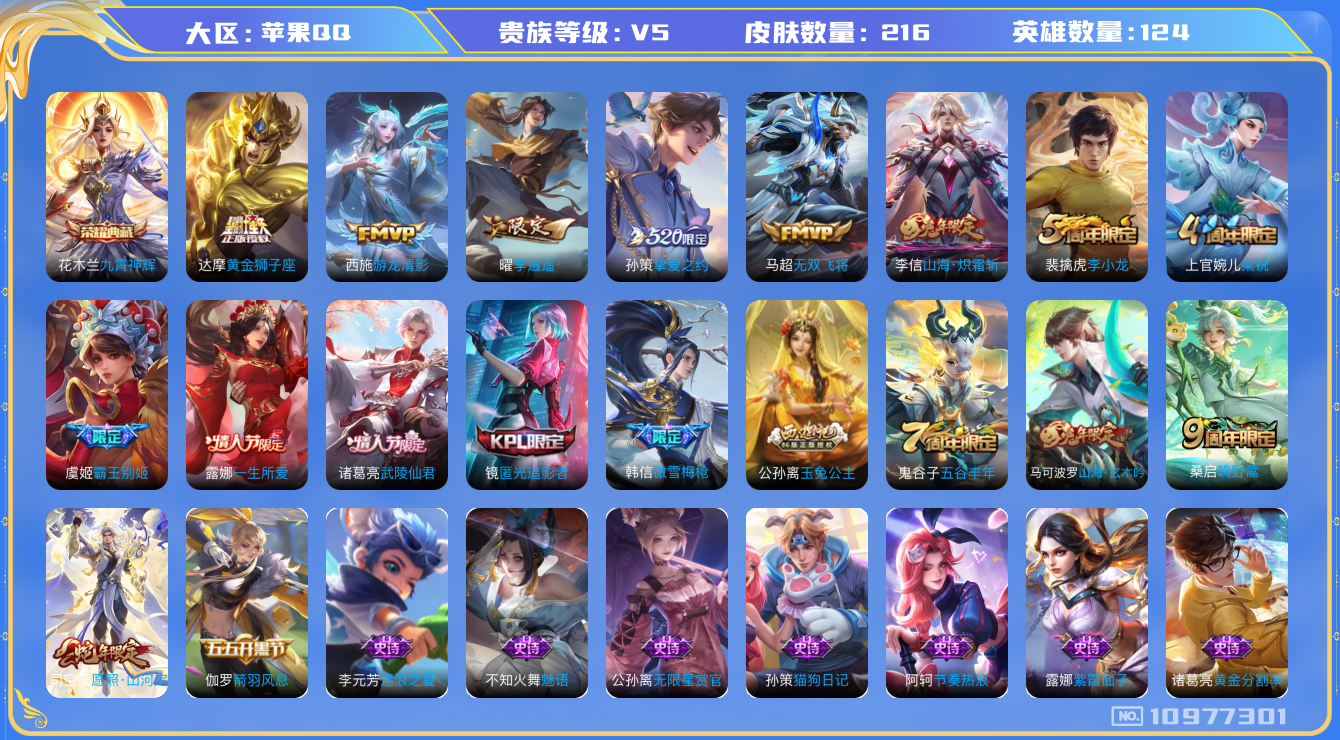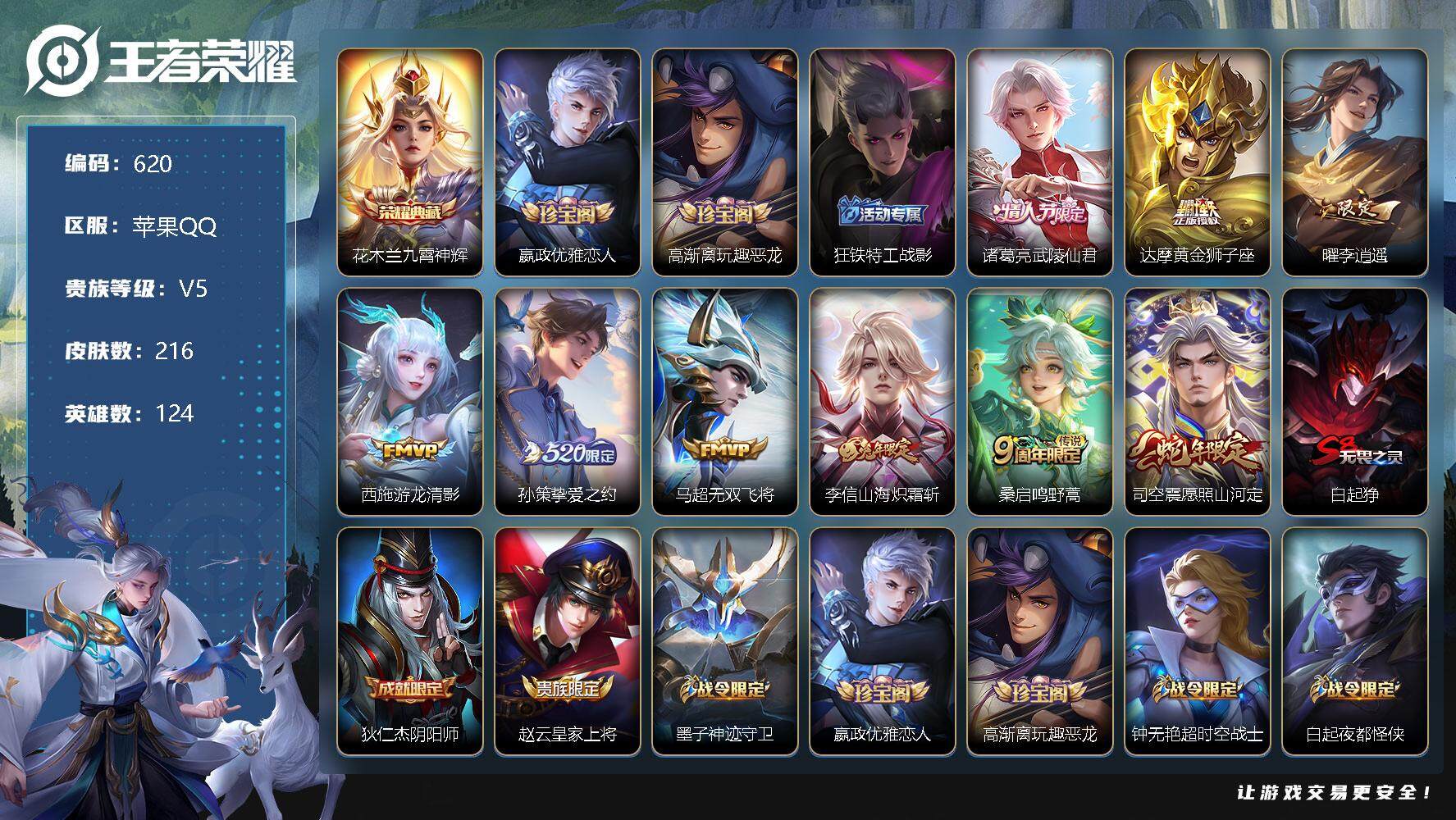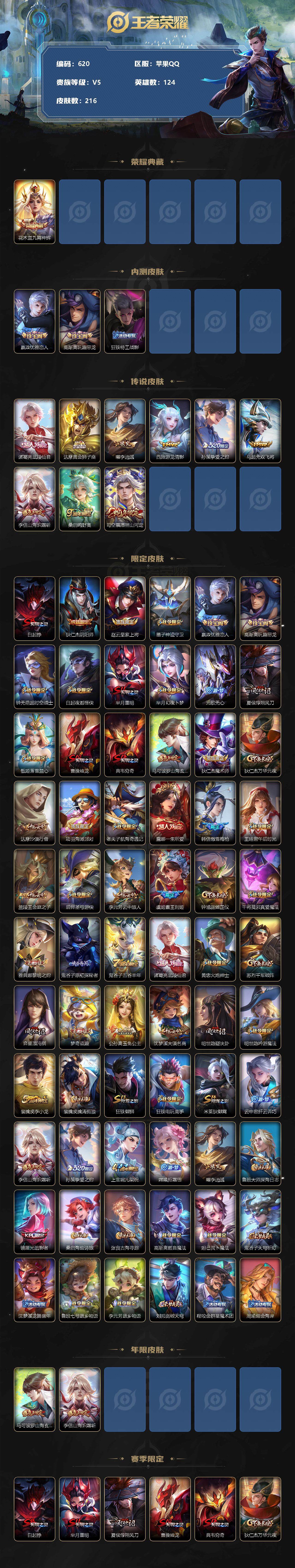 [10977301]【商品标题】:苹果Q-V5-永恒钻石II段位-124英雄-216皮肤-1典藏-0珍品无双-0无双-0珍品传说-9传说-66史诗