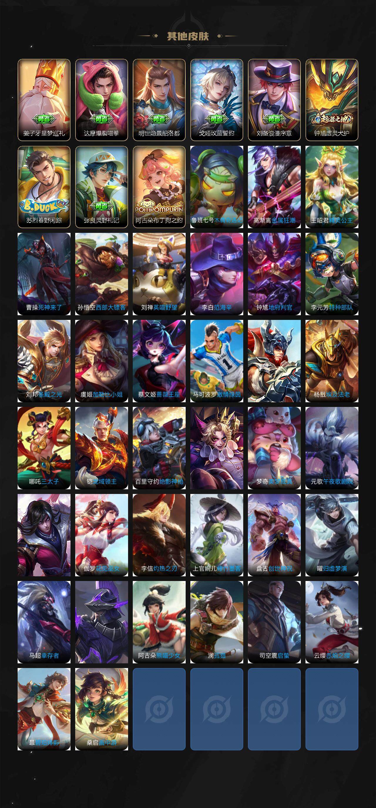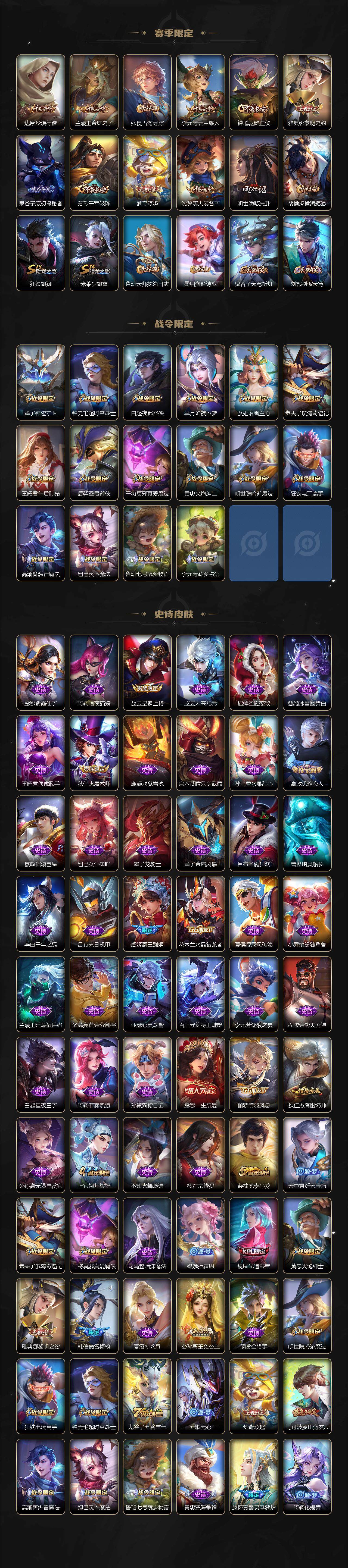 【限定皮肤】:白起狰,狄仁杰阴阳师,赵云皇家上将,墨子神迹守卫,嬴政优雅恋人,高渐离玩趣恶龙,钟无艳超时空战士,白起夜都怪侠,芈月重明,芈月幻夜卜梦,元歌无心,夏侯惇朔风刀,甄姬落雪兰心,曹操烛龙,典韦穷奇,马可波罗山海玄木吟,狄仁杰魔术师,狄仁杰万华元夜,达摩沙漠行僧,项羽海滩派对,老夫子航海奇遇记,露娜一生所爱,韩信傲雪梅枪,王昭君午后时光,兰陵王金庭之子,后羿圣弓游侠,李元芳云中旅人,虞姬霸王别姬,钟馗驱傩正仪,干将莫邪真爱魔法,雅典娜黎明之约,鬼谷子原初探秘者,鬼谷子五谷丰年,诸葛亮武陵仙君,黄忠火炮绅士,苏烈千军破阵,弈星混沌棋,梦奇顽趣,公孙离玉兔公主,沈梦溪大漠名商,明世隐疑决卦,明世隐吟游魔法,裴擒虎李小龙,裴擒虎擒涛扼浪,狂铁御狮,狂铁电玩高手,米莱狄御霄,云中君纤云弄巧,李信山海炽霜斩,孙策挚爱之约,上官婉儿梁祝,嫦娥拒霜思,曜李逍遥 ,鲁班大师探海日志,镜匿光追影者,桑启海盐诗旅,张良古海寻踪,高渐离燃音魔法,妲己灵卜魔法,鬼谷子天穹祈灯,沈梦溪龙舞盛年,鲁班七号蔬乡物语,李元芳蔬乡物语,刘邦剑破天穹,程咬金群星魔术团,周瑜熔金海岸
