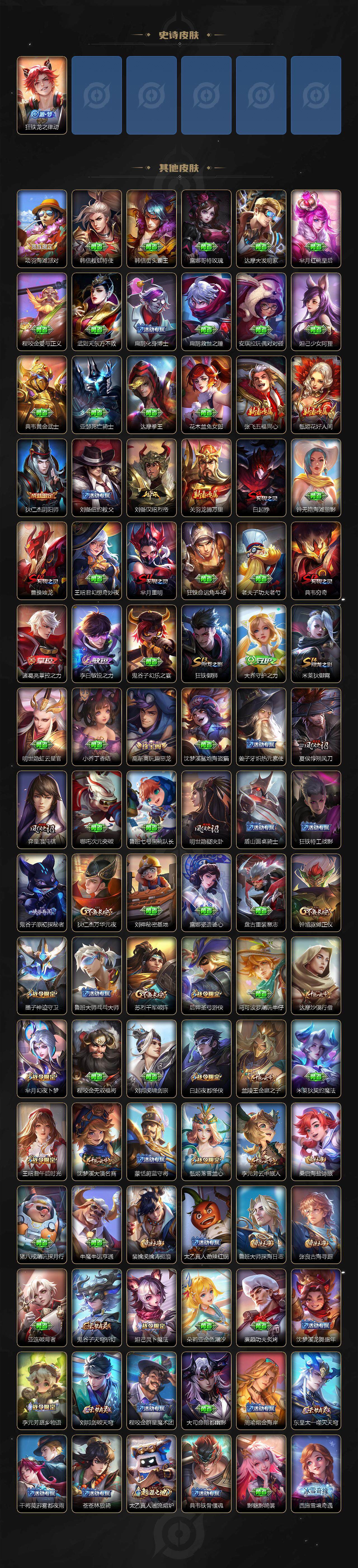 - [11879276]V7 1典藏 1传说 123英雄 226皮肤 可修改实名 优质装备:鸣剑·曳影,一念神魔,涂山容容 珍宝阁皮:胡桃夹子,女武神 限定皮:逐霄战戟,至尊宝,傲雪梅枪,神威(电光马子),高山流水,五谷丰年,梁祝,李小龙,逐梦之影,猪悟能,大圣娶亲,山海·玄木吟(马可年限) 史诗皮:苍穹之光,电玩小子(小书包),千年之狐,高渐离燃音魔法,冰冠公主,青蛇,偶像歌手,电玩·爆裂旋风,猫狗日记-孙策,节奏热浪,修罗,女仆咖啡,摇滚巨星,水果甜心,天才门将,星夜王子,暗隐猎兽者,幽灵船长,鬼剑武藏,地狱岩魂,纤云弄巧,繁星吟游(呼啦呼啦),拒霜思,乘风破浪,逐浪之夏,水晶猎龙者,曙光守护者,箭羽风息,金属风暴,圣诞狂欢,圣诞恋歌,鹰眼统帅,魅力维加斯,无心,未来纪元-赵云