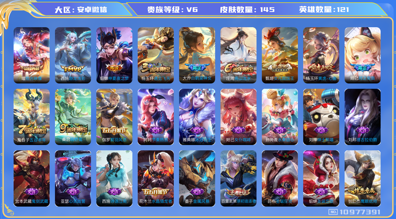[10977391]【商品标题】:安卓WX-V3-永恒钻石III段位-121英雄-145皮肤-1典藏-0珍品无双-0无双-0珍品传说-3传说-42史诗